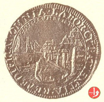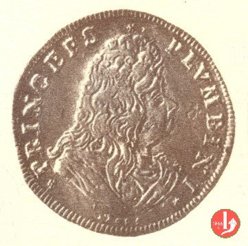 . PRINCEPS • PLVMBINI Busto a destra, a testa nuda con lunga capigliatura; sotto 1695 LABOR • "CV • "PATIENTIA • "REAEDIFICAT • "OMNIA • Veduta della città di Piombino dal mare; in alto, a caratteri minuti -CIVI • • PLVMBINI -