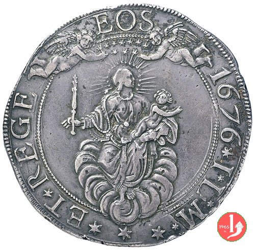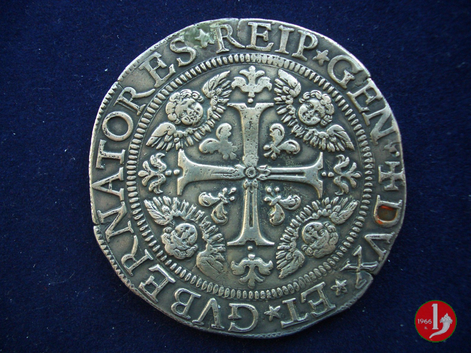 Prende il nome di scudo largo perchè battuto su moduli larghi a partire dal 1649 in contemporanea con l'emissione dell'altro scudo precedente che, da quella data, prende il nome di scudo stretto. Il C.N.I. descrive 30 date diverse con 52 varianti: ad esempio al R/ al posto di GEN c'è GENVE o GENV, o, in un esemplare del 1698, GVBERNATORER, la corona ha un vario numero di stelle e la Madonna non sempre ha la raggiera dietro alla testa. La prima moneta che riporta un'iscrizione sul taglio è un esemplare di questo nominale del 1676 da considerarsi R4, la scritta rassicura sul mantenimento del giusto peso e il corretto valore della moneta ( •PESO •GRANI •726 (serie di roselline) •BONTA' •ONCIE • 10 •16 (serie di roselline) • Secondo le tariffe del 1755 e del 1761, nelle contrattazioni gli scudi d'argento di Genova superavano di circa 1 punto tutte le altre monete coniate nel mondo intero piú correnti e ufficialmente valutate sulla piazza di Genova. Facendo una stima sui pezzi e sulle varianti note dei vari anni nei quali sono stati battuti i multipli e sottomultipli della serie degli scudi stretti e larghi si può concludere che i periodi con minori tirature, e quindi piú rari, sono i pezzi battuti negli anni dal 1638 al 1650 e dal 1700 in poi. | ||||||||