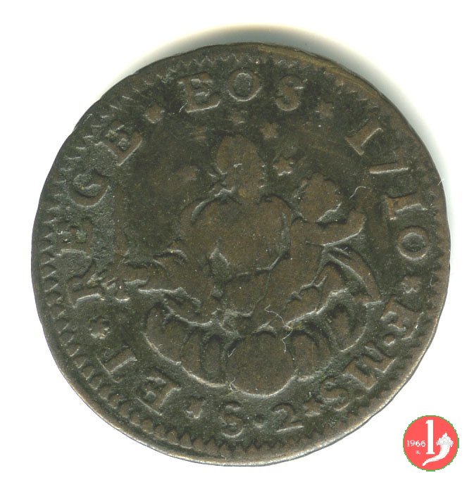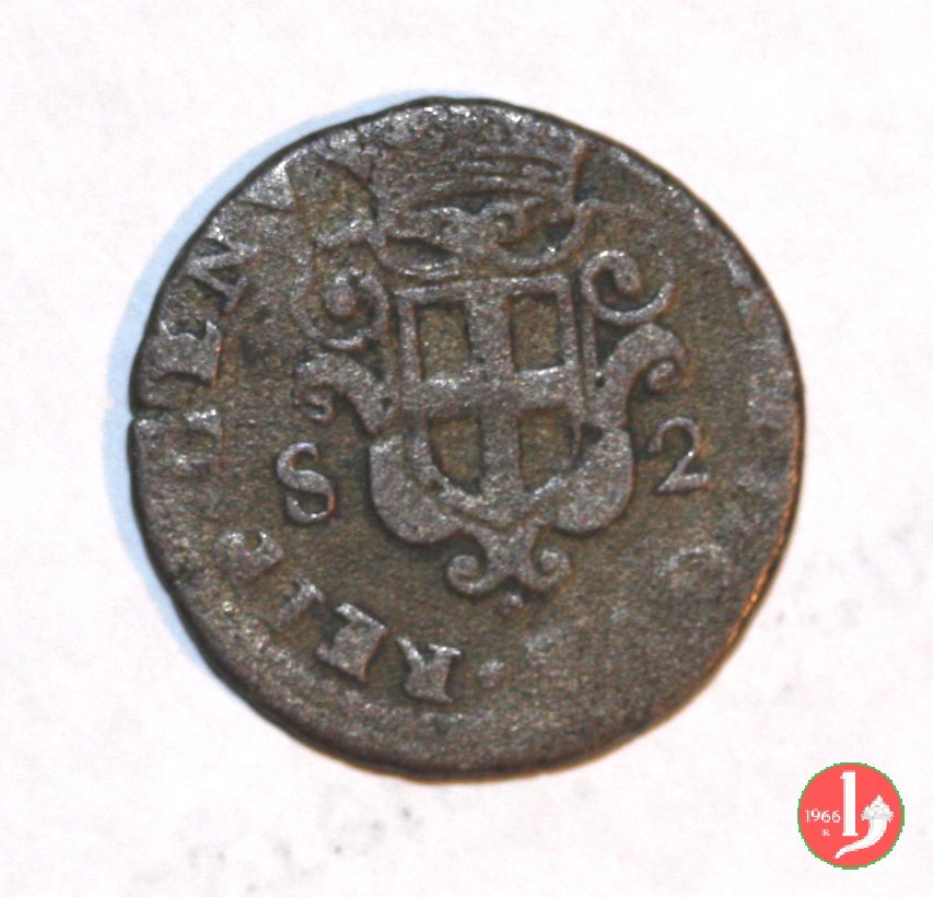 | Esiste una variante con il valore "S 2" ai lati dello scudo. Questa moneta in gergo veniva chiamata "parpagliola" e cosí è riportata in alcuni documenti dell'epoca. Il C.N.I. ne descrive 17 date con 35 varianti ma se ne conoscono altre. Si racconta di numerosi falsi d'epoca di cui uno noto datato 1714. | ||||||||||||||