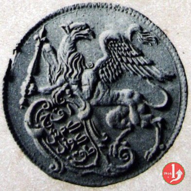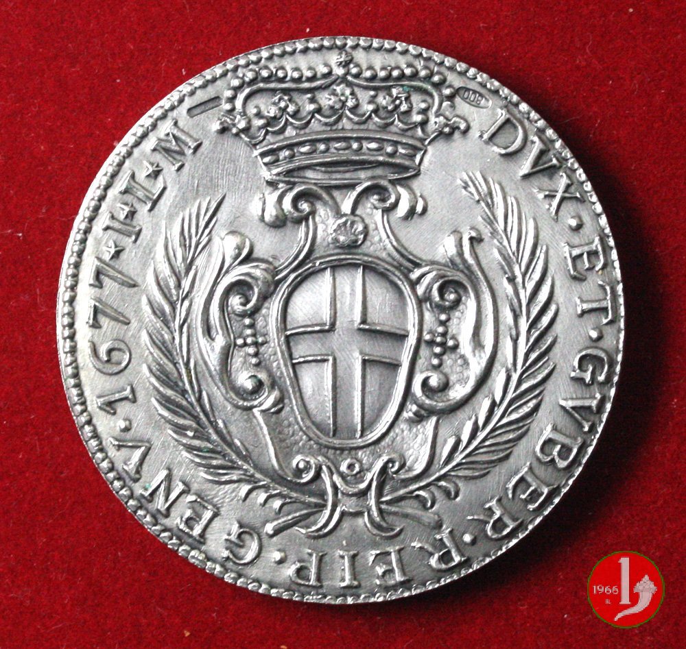 | Moneta emessa per il Levante battuto nell'anno 1677. Se ne conoscono 3 esemplari (uno al Museo Hermitage, uno nella Collezione della Banca Carige, e uno in collezione privata) dei quali 2 sono identici e il terzo con lievi differenze nel disegno e di diametro e peso inferiori, il che fa pensare sia stato battuto da un altro conio o dal ritocco delle matrici originali. | |||||