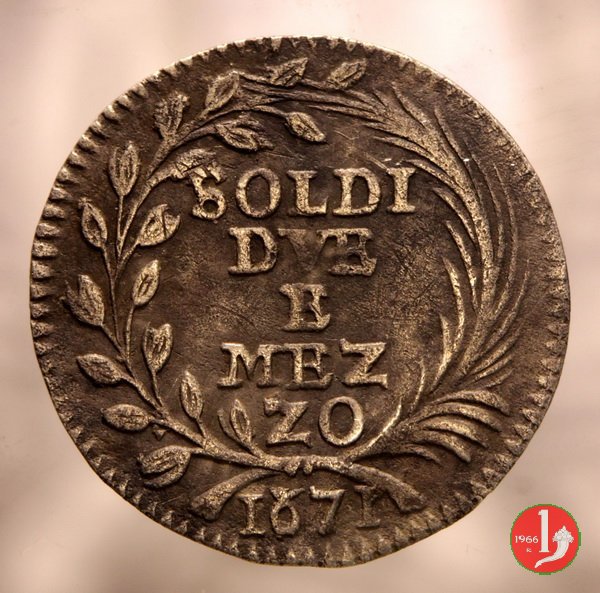 Al centro: SOLDI / DVE / E / MEZZO (scritto su 4 righe) attorniato da un ramo di alloro e uno di palma. All'esergo: 1671