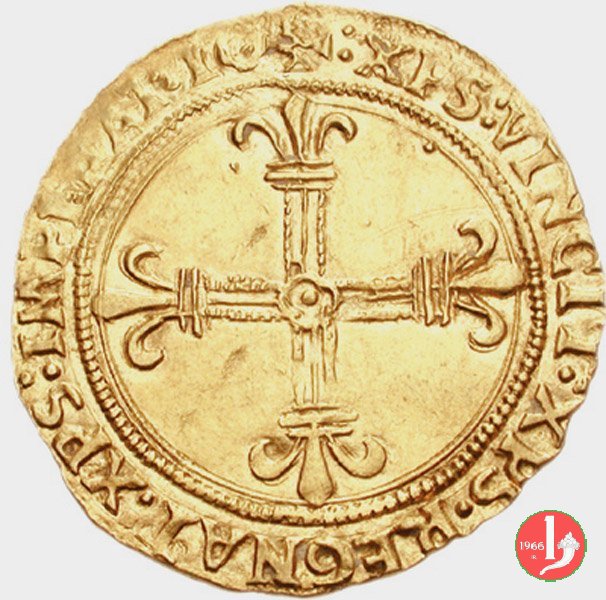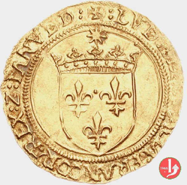 | Questo tipo di moneta rappresenta l'edizione genovese di quella battuta in Francia da Luigi XII e posta in circolazione già dal 1470 dal suo predecessore. Questa moneta sostituirà il ducato di cui che sarà descritto per il doge Antoniotto Adorno dal 1522 al 1527. Lo scudo del sole di Luigi XII è assai raro anche se molte sono le varianti: il C.N.I. ne descrive 19 fra cui esemplari con Z dopo REX, con punti sul cerchio lineare, con leggenda del R/ preceduta da giglio con corona e seguita da foglia e un esemplare contromarcato con un castello sul R/. | ||||||||||||