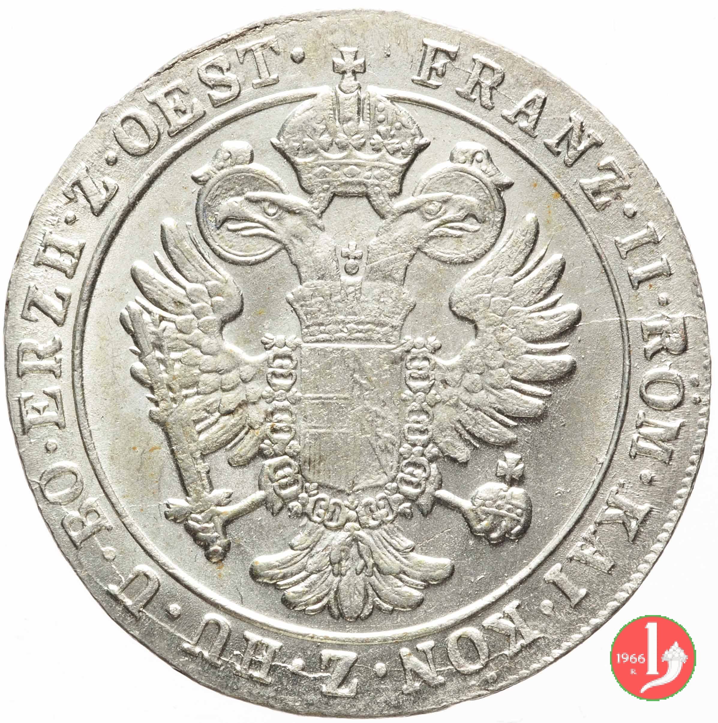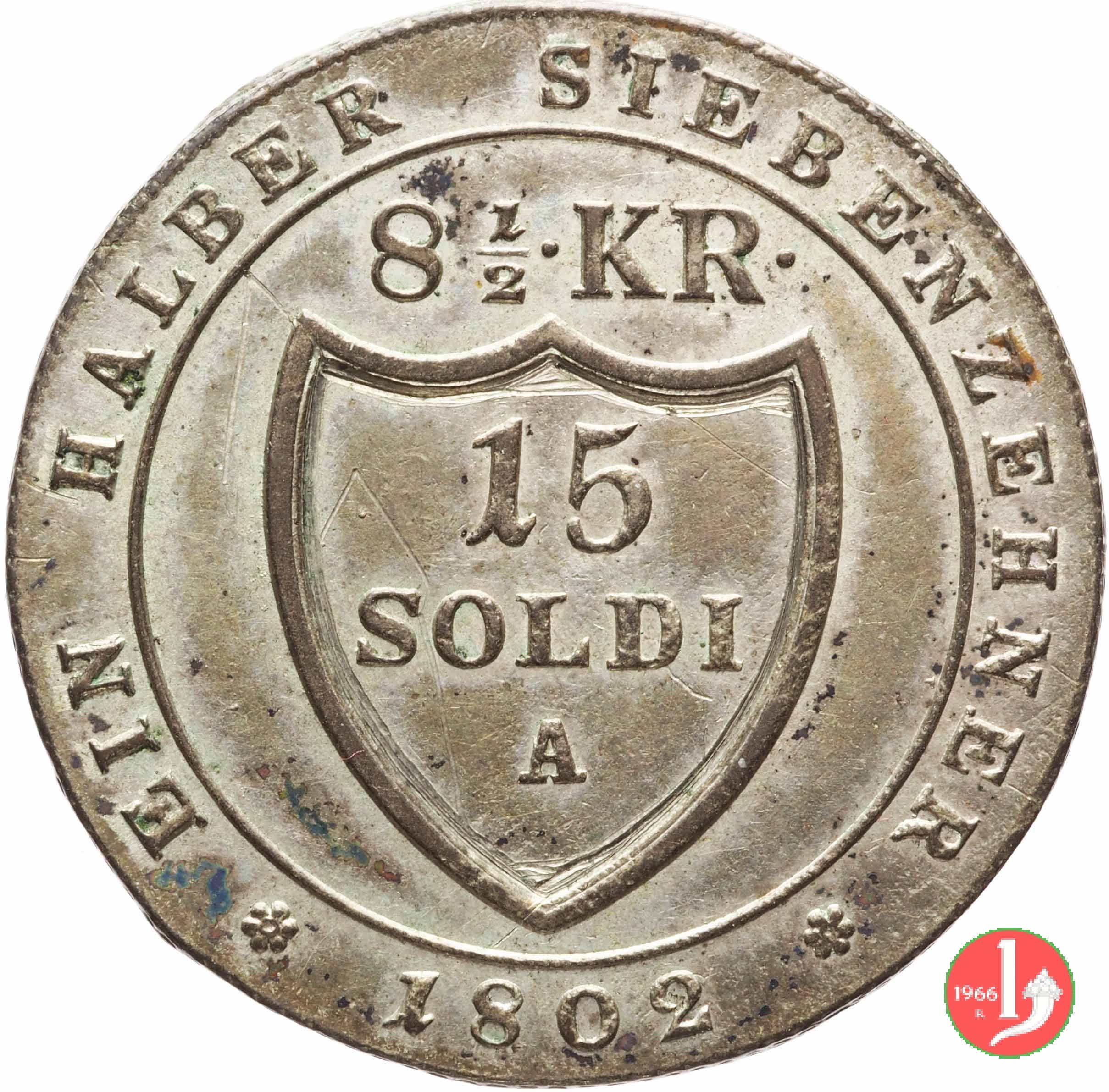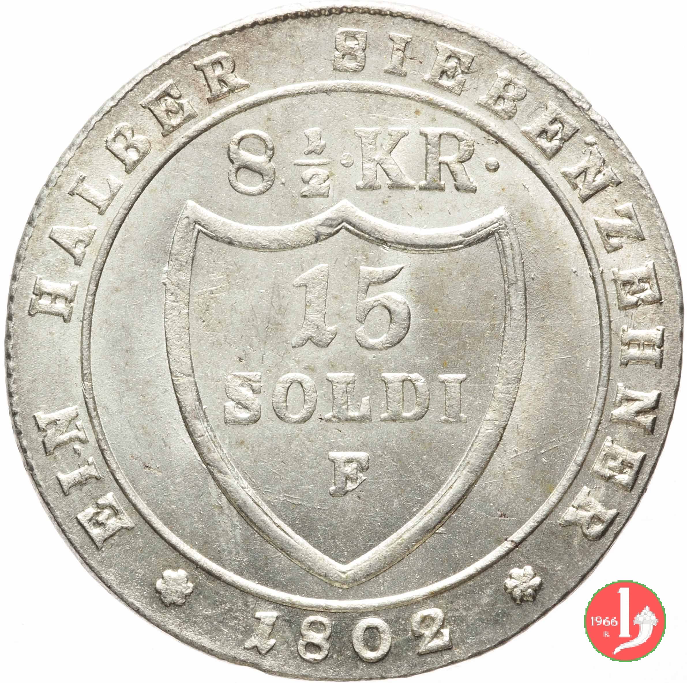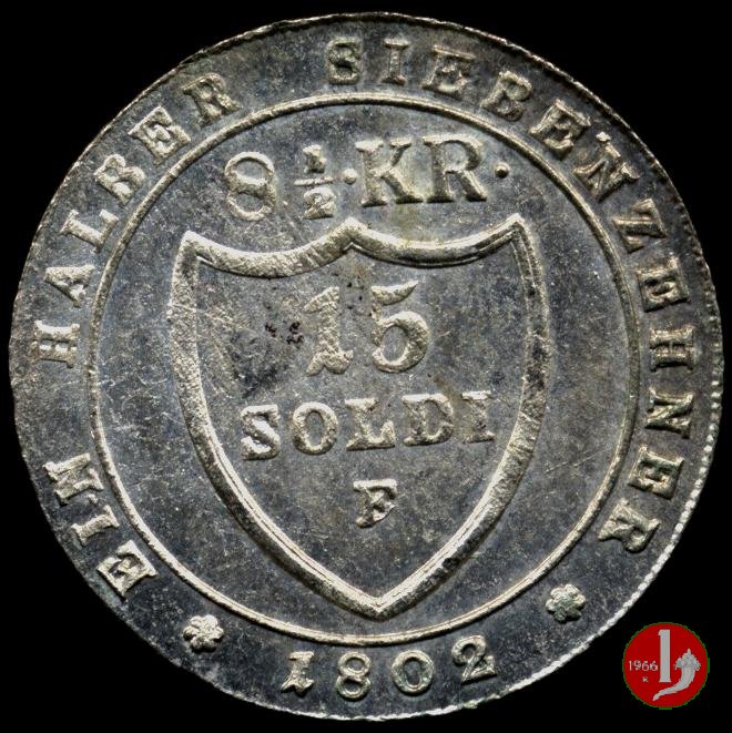 Moneta da 15 soldi di Gorizia pari a 8 kreuzer e mezzo imperiali. Segni di zecca: A per Vienna, F per Hall e H per Günzburg. | ||||