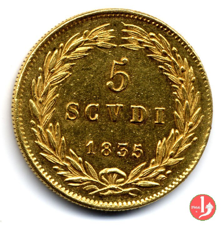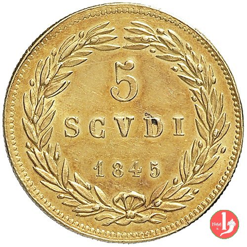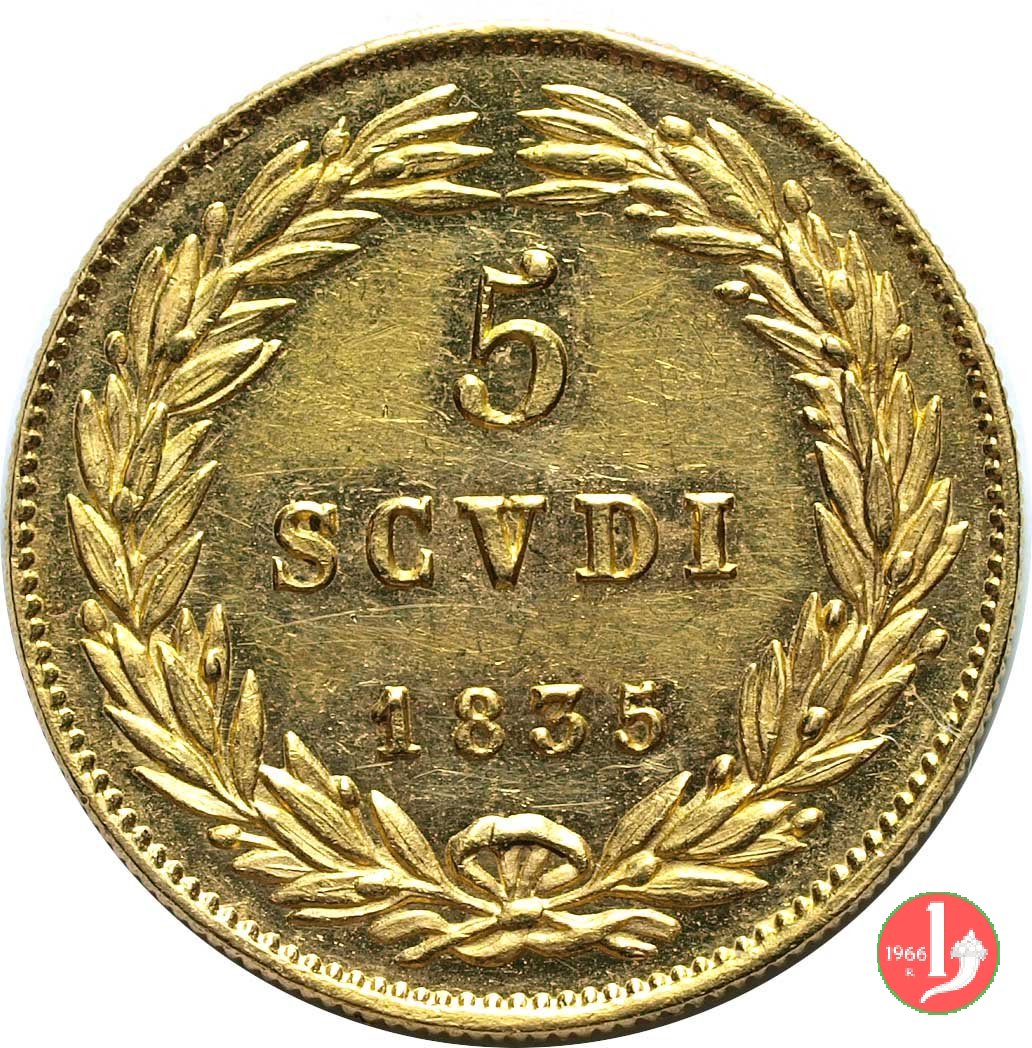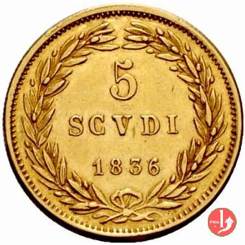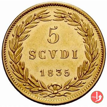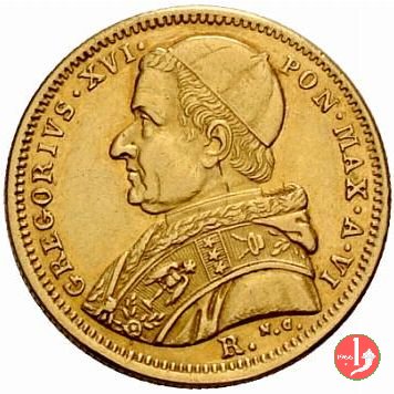 Busto a sinistra con zucchetto, mozzetta e stola; attorno, da sinistra in b.: GREGORIVS • XVI • - PON • MAX • A • e l'anno di pontificato; sotto, il segno di zecca e le iniziali N.C. Entro rami d'ulivo, in tre righe: 5 // SCVDI // data.