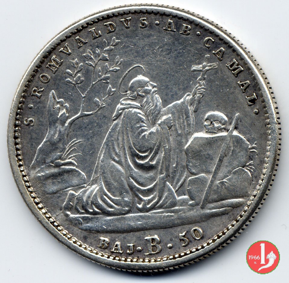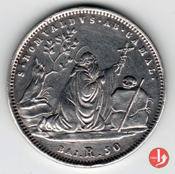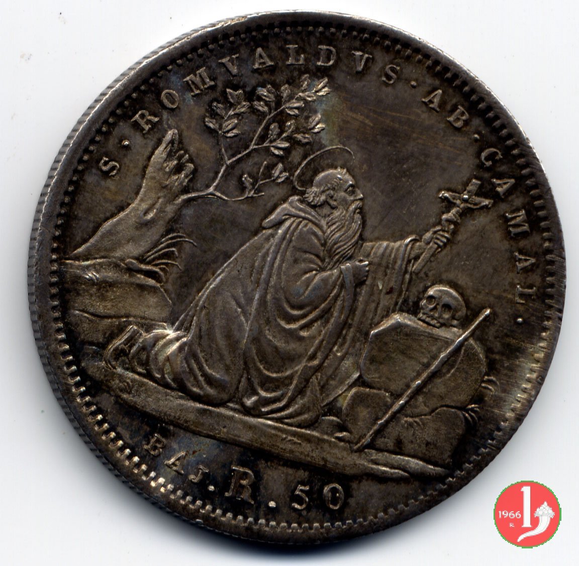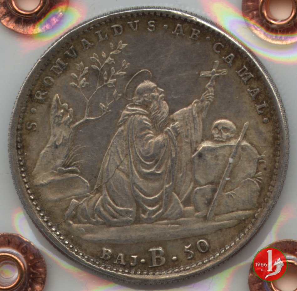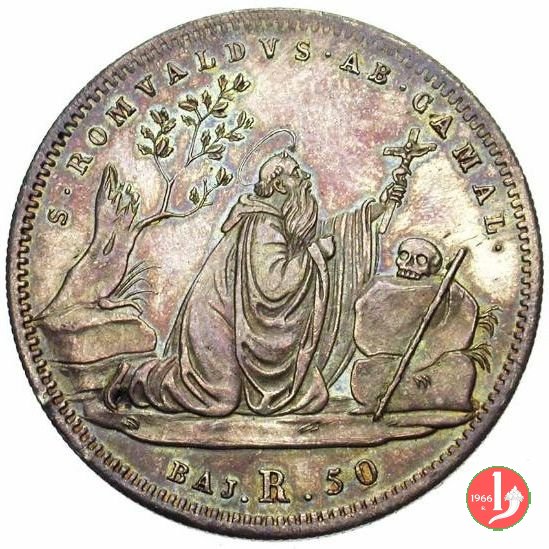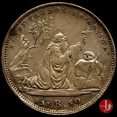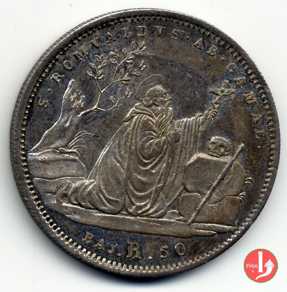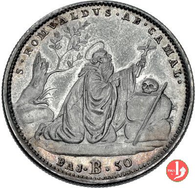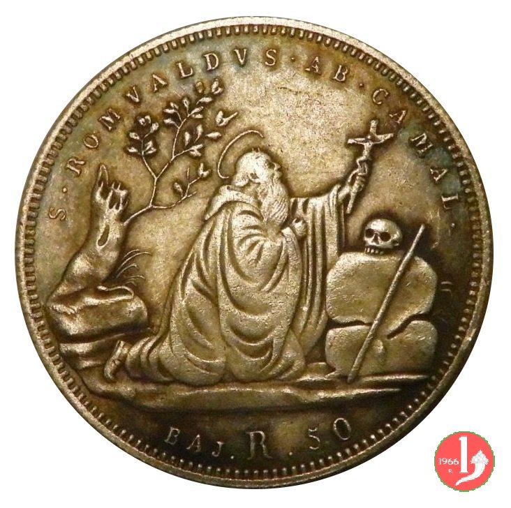 GREGORIVS • XVI - PON • MAX • A • (anno di pontificato) busto a destra con zucchetto, mozzetta e stola; sotto, data e N • CERBARA(incisore). S • ROMVALDVS • AB • CAMAL •, San Romualdo con crocifisso, genuflesso a destra, innanzi ad una roccia con teschio e bastone; alle sue spalle un albero; all'esergo il segno di zecca tra BAJ. e 50.