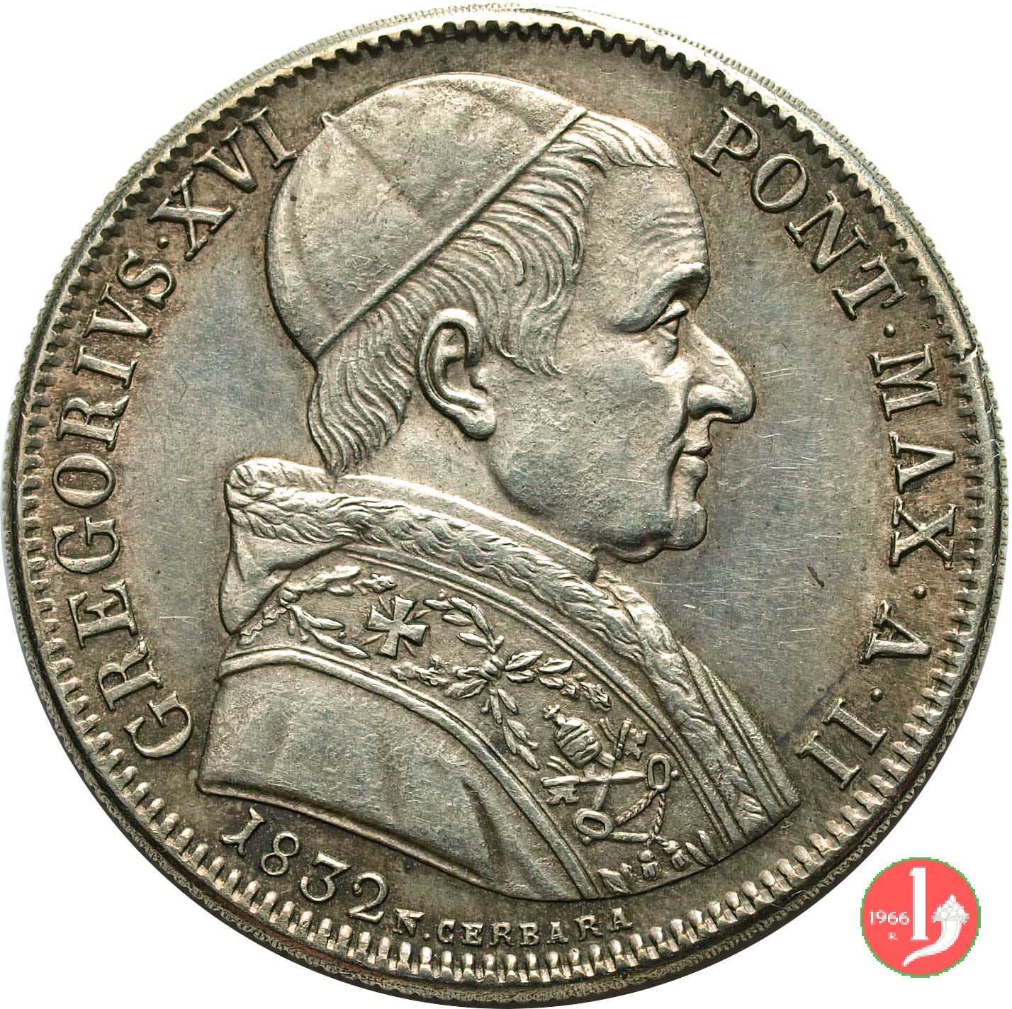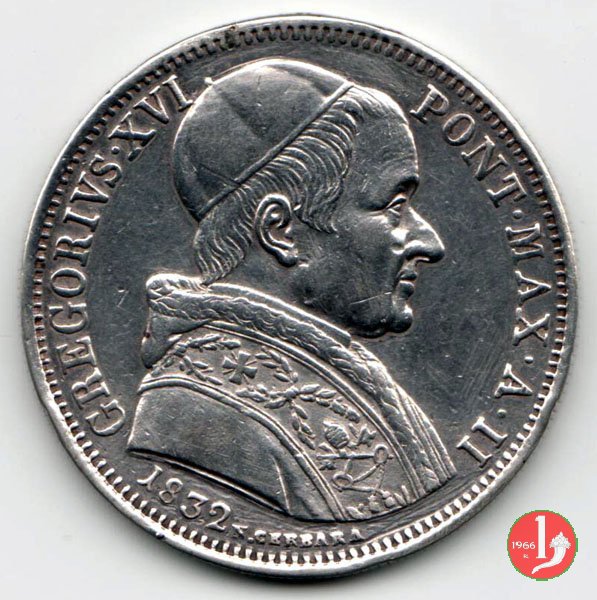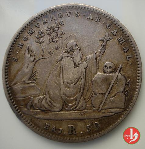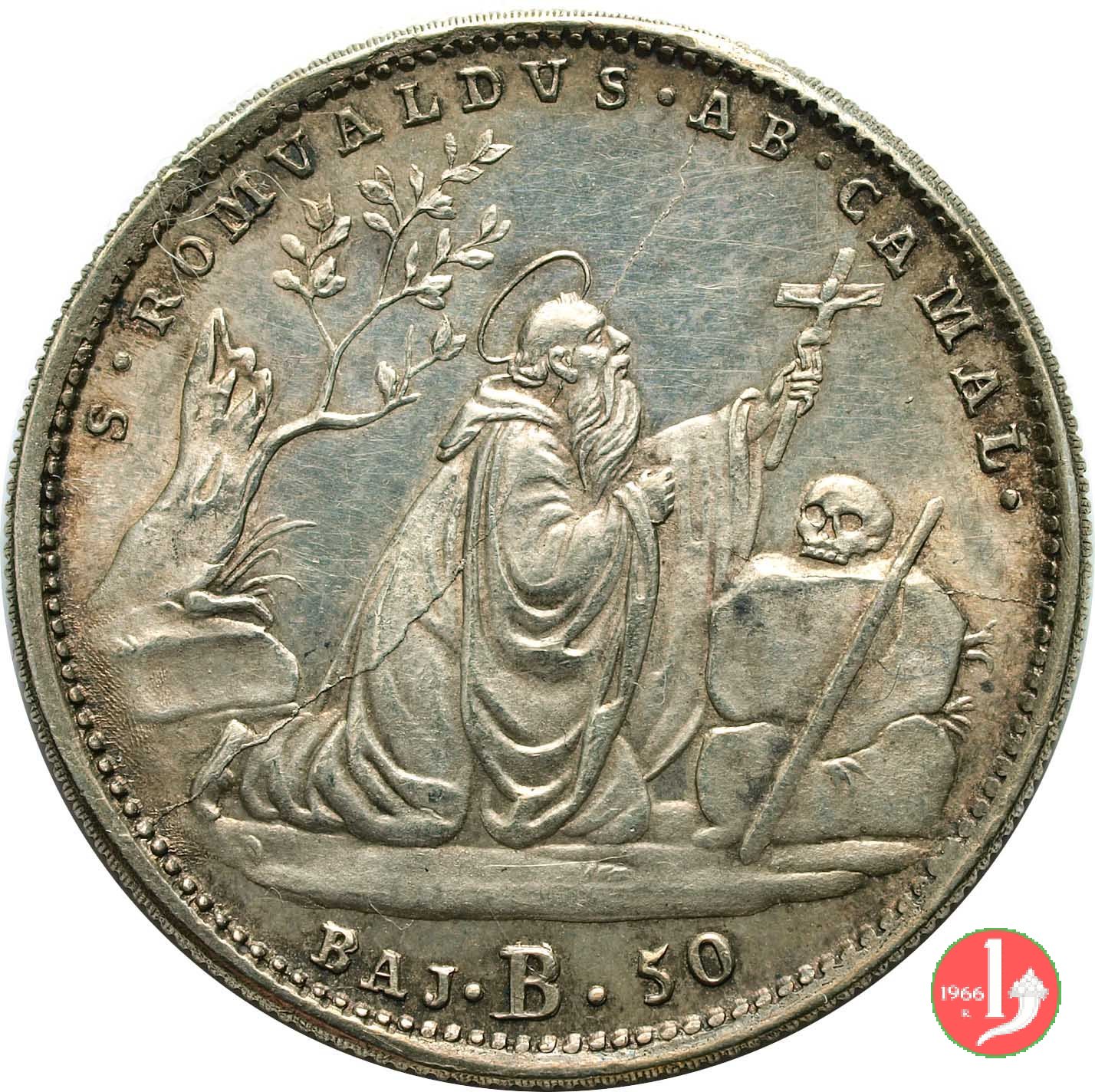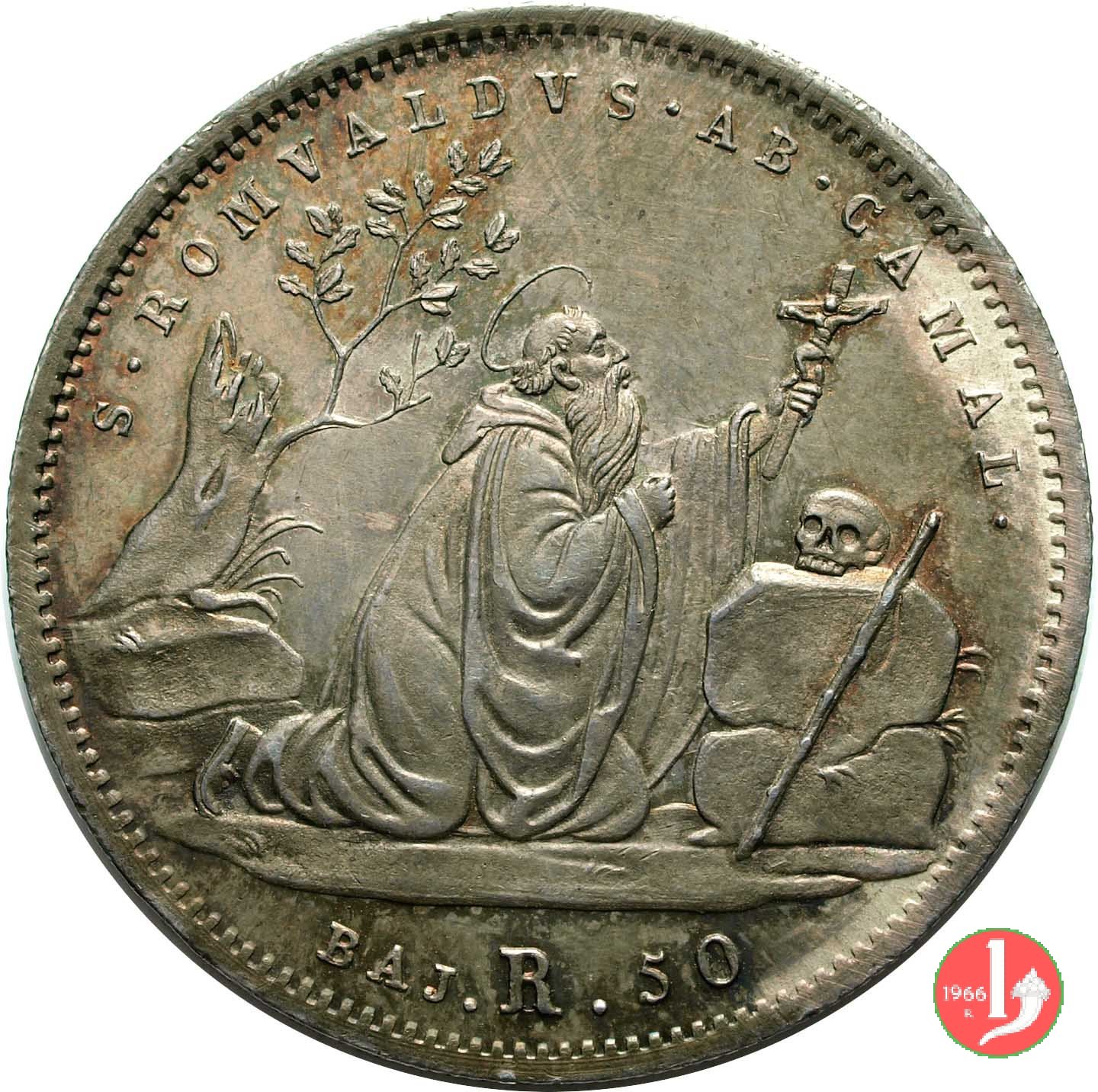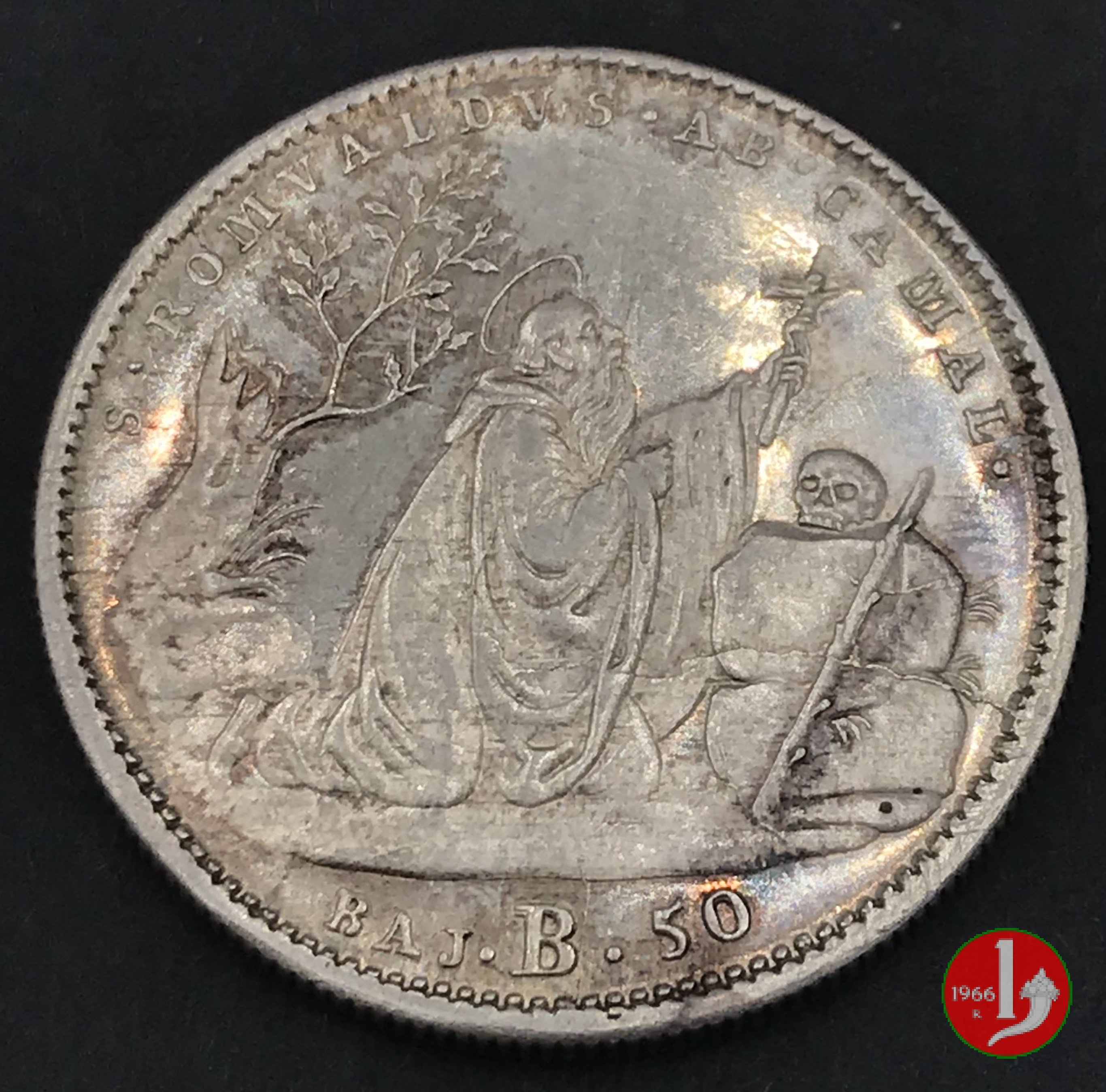 GREGORIVS • XVI - PON • MAX • A • (anno di pontificato) busto a destra con zucchetto, mozzetta e stola; sotto, data e N • CERBARA(incisore). S • ROMVALDVS • AB • CAMAL •, San Romualdo con crocifisso, genuflesso a destra, innanzi ad una roccia con teschio e bastone; alle sue spalle un albero; all'esergo il segno di zecca tra BAJ. e 50.