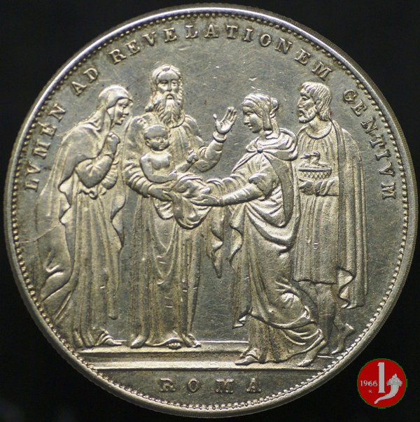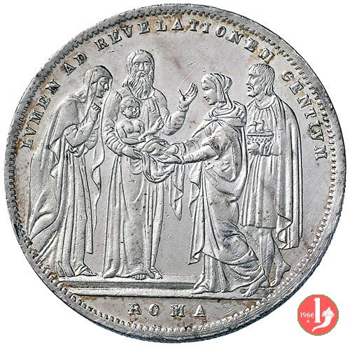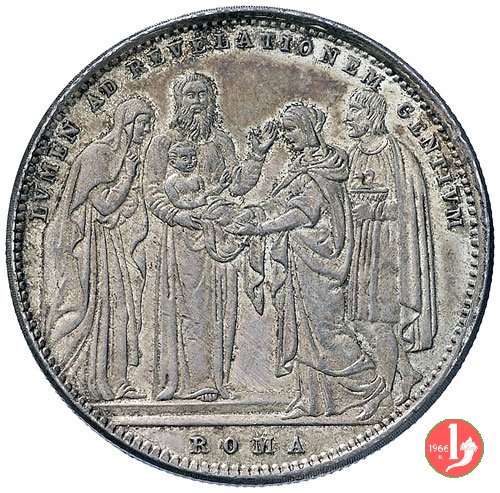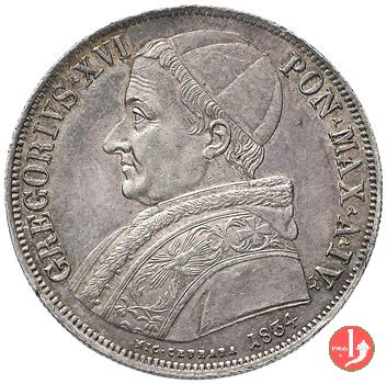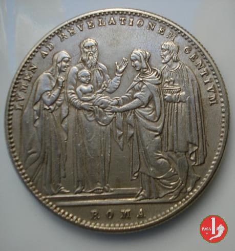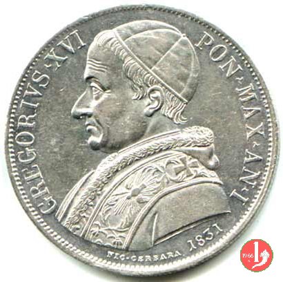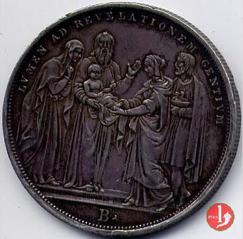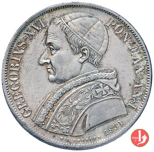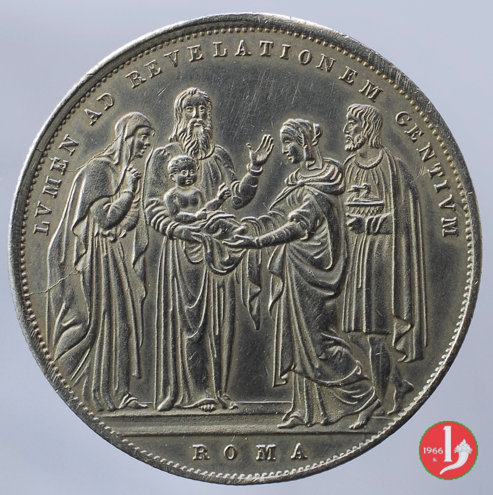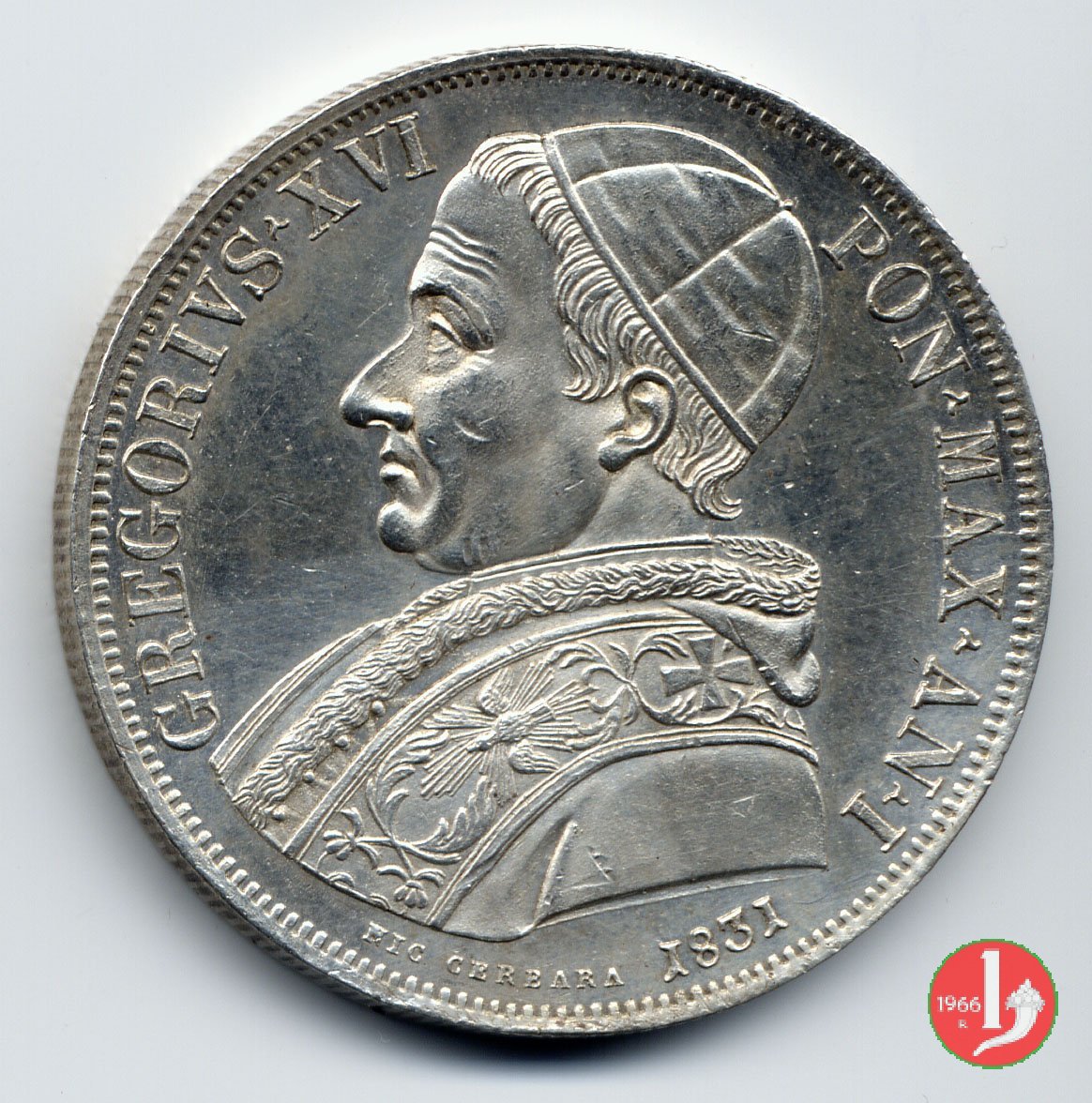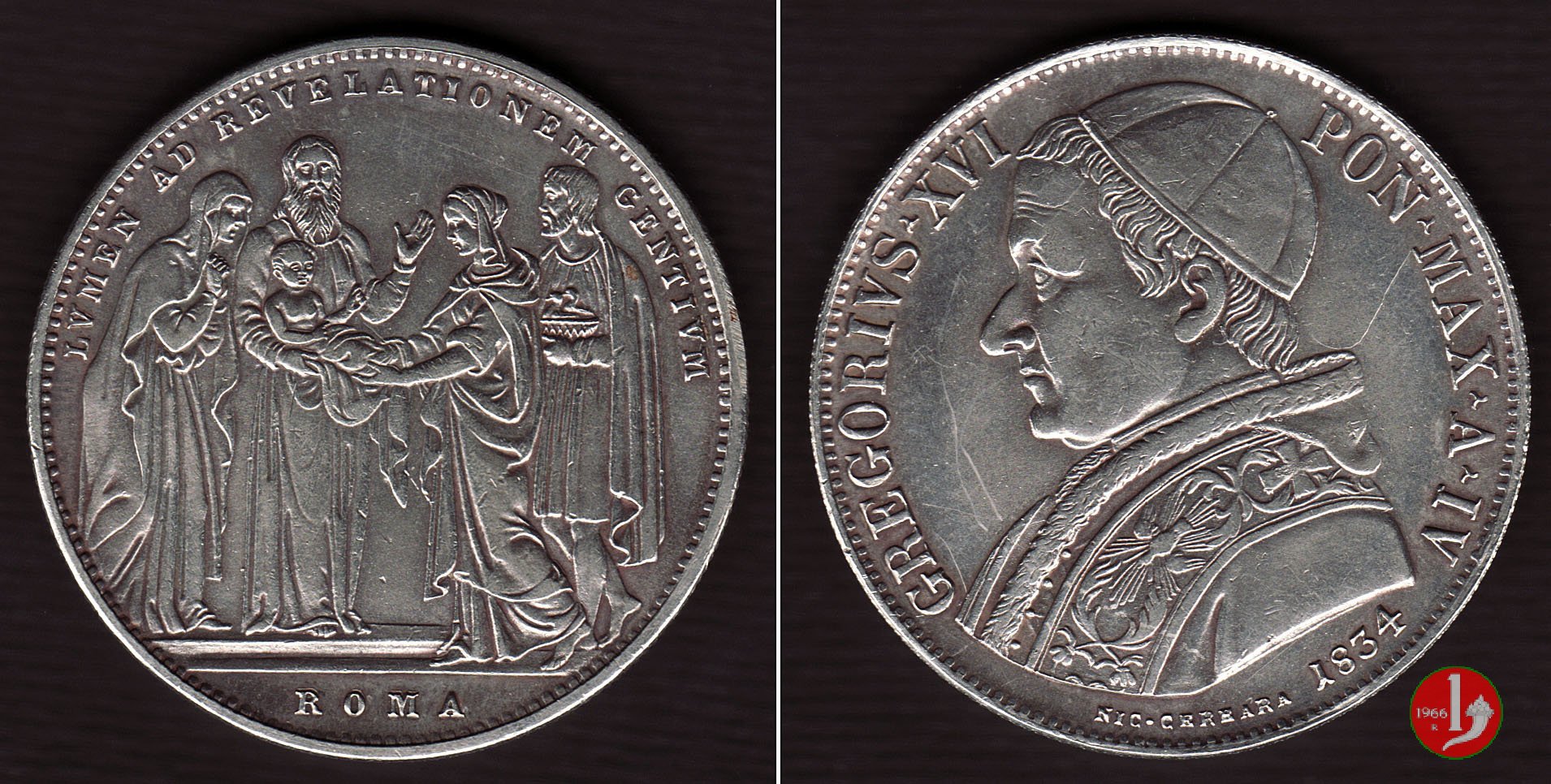 (s) GREGORIVS • XVI - PON • MAX • A • (anno di pontificato) busto a sinistra con zucchetto, mozzetta, stola con croce e colomba radiante; sotto, NIC. CERBARA (data). (s) LVMEN AD REVELATIONEM GENTIVM Presentazione di Gesú al tempio; all'esergo, segno di zecca.