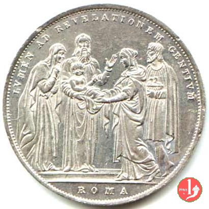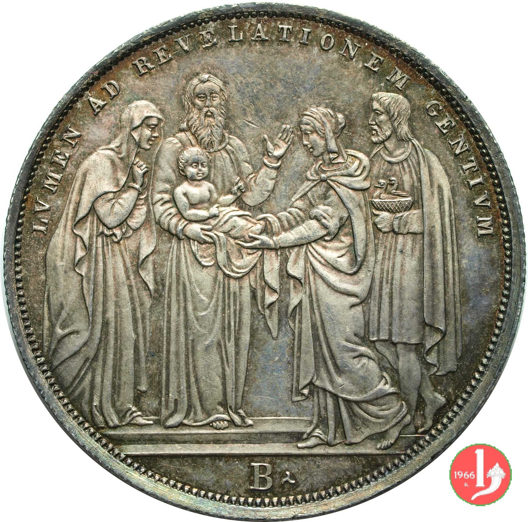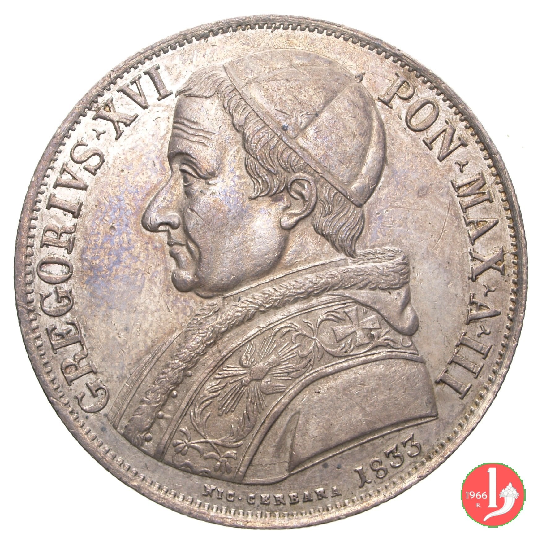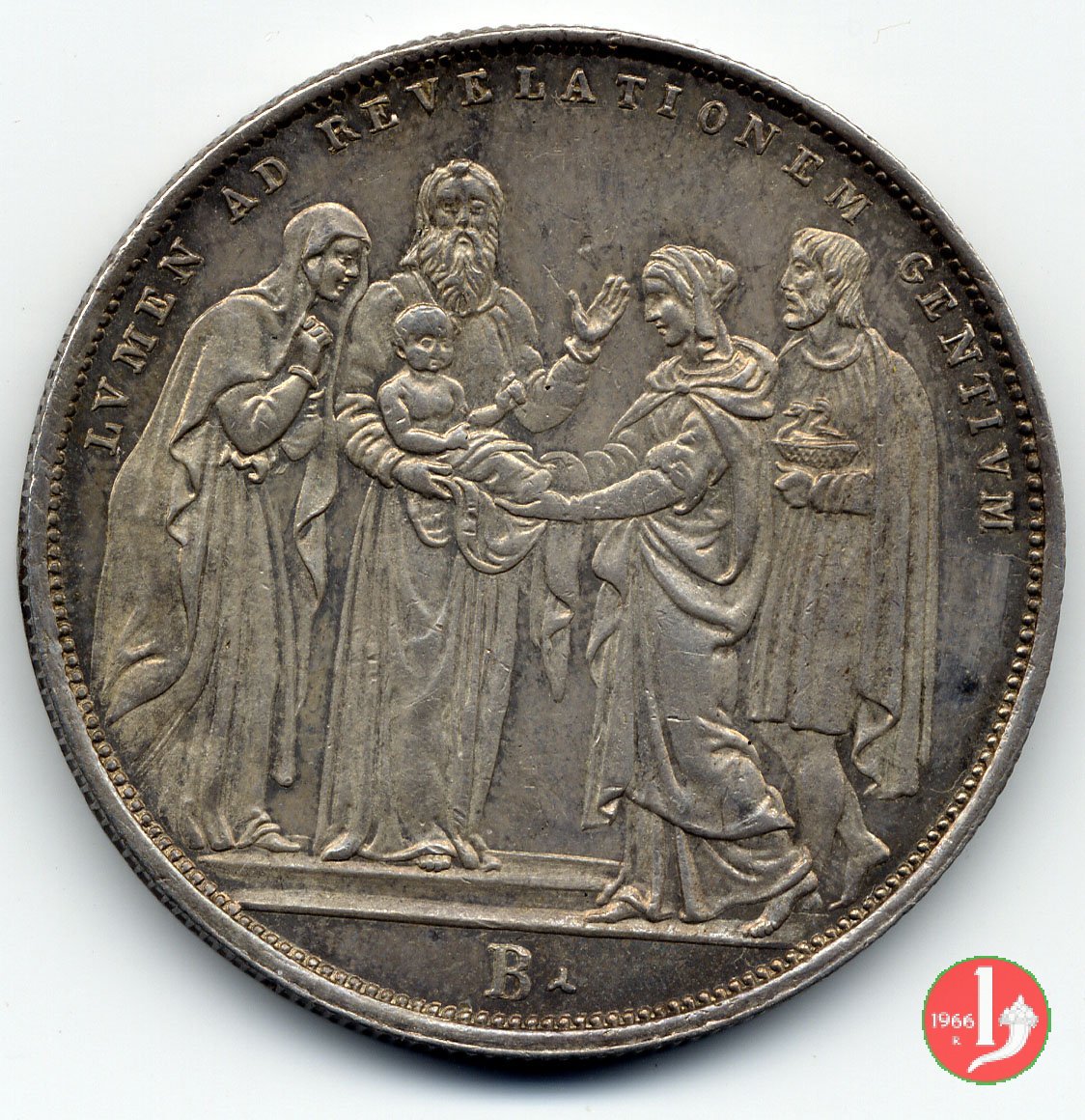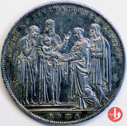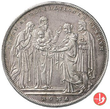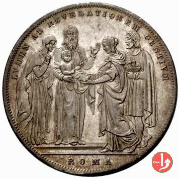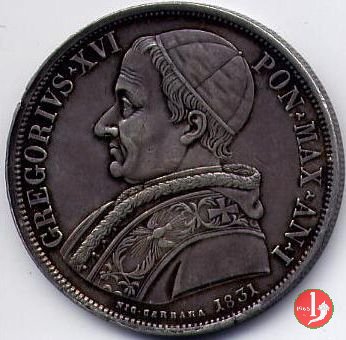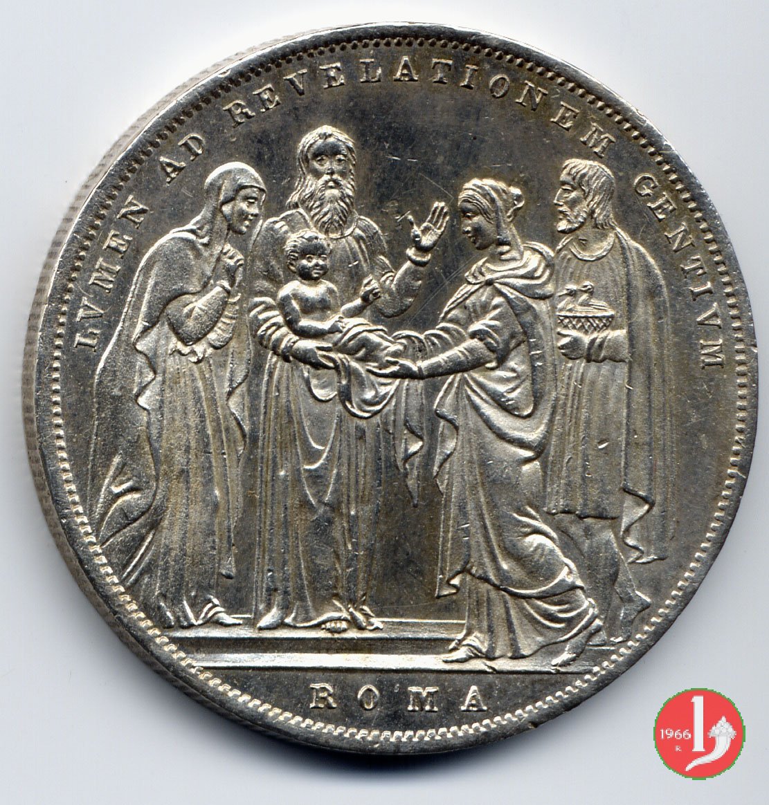 (s) GREGORIVS • XVI - PON • MAX • A • (anno di pontificato) busto a sinistra con zucchetto, mozzetta, stola con croce e colomba radiante; sotto, NIC. CERBARA (data). (s) LVMEN AD REVELATIONEM GENTIVM Presentazione di Gesú al tempio; all'esergo, segno di zecca.
