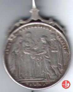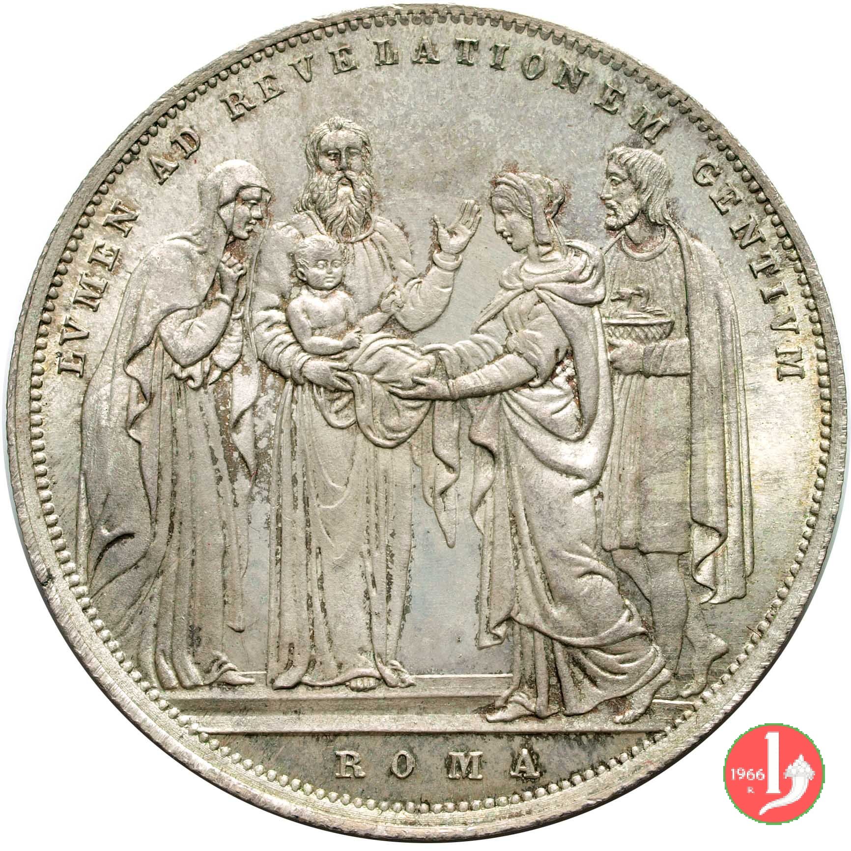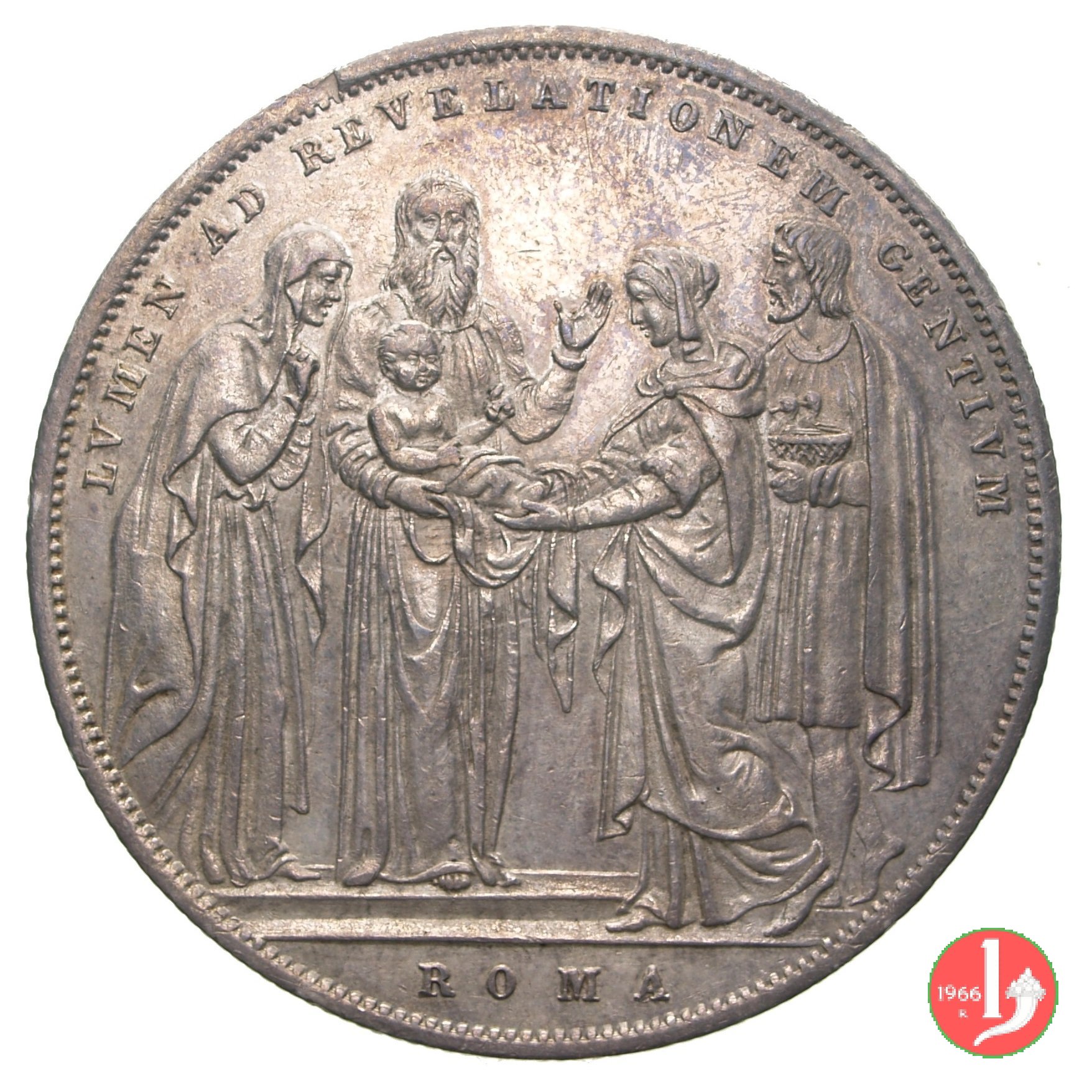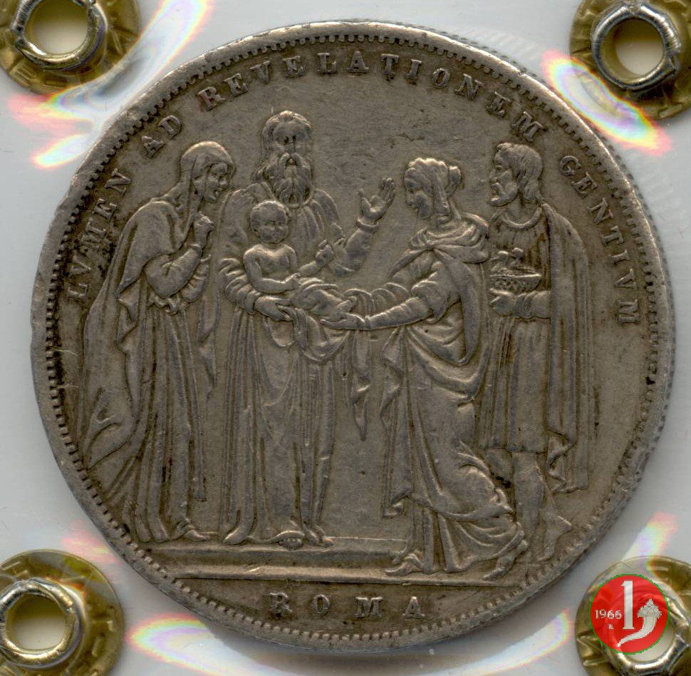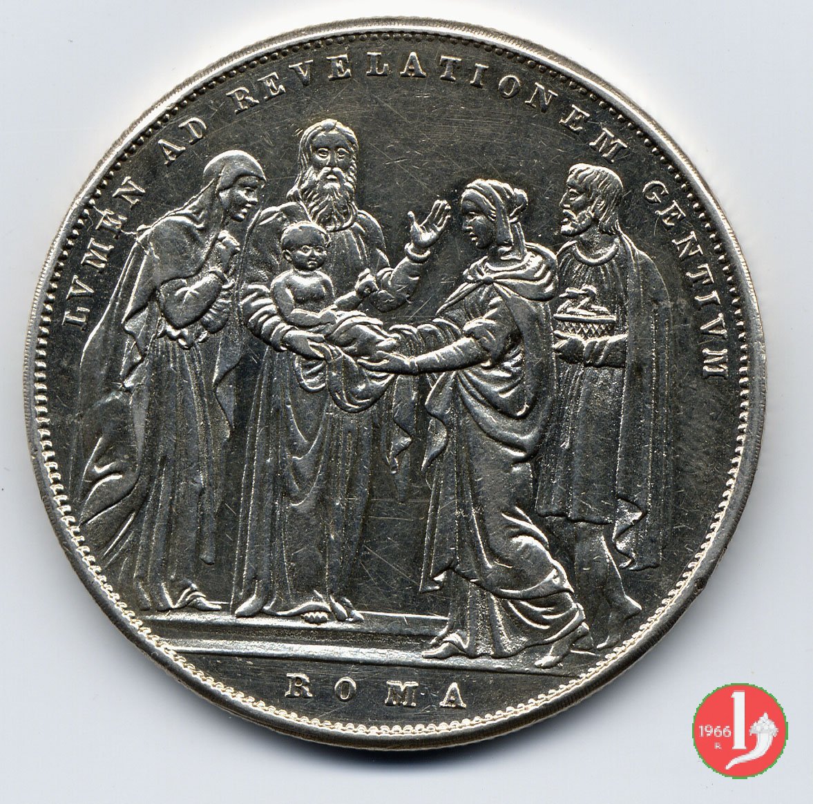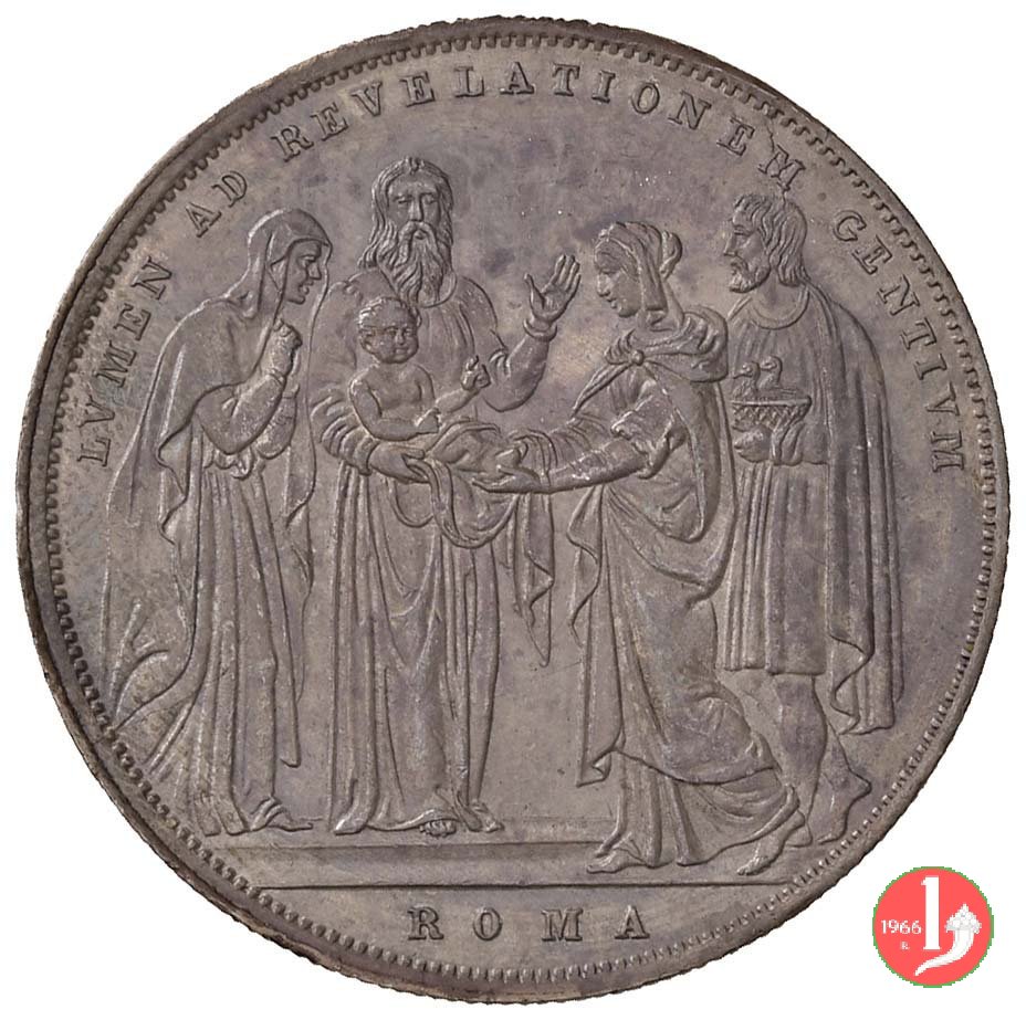 (s) GREGORIVS • XVI - PON • MAX • A • (anno di pontificato) busto a sinistra con zucchetto, mozzetta, stola con croce e colomba radiante; sotto, NIC. CERBARA (data). (s) LVMEN AD REVELATIONEM GENTIVM Presentazione di Gesú al tempio; all'esergo, segno di zecca.