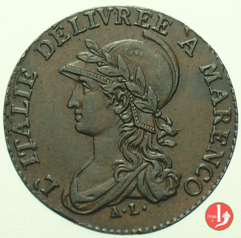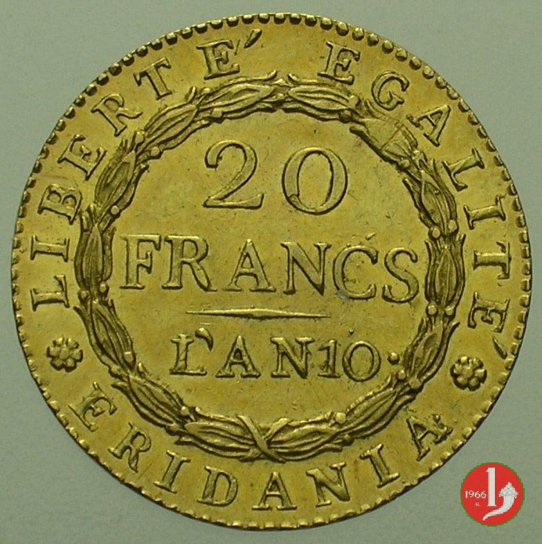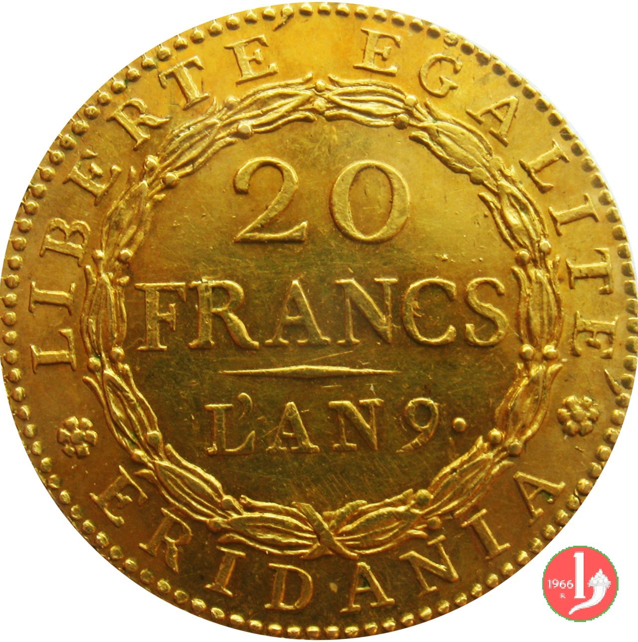 There are discussions about this coin on the forum: le 29 vendémiaire An 10, lettera storico-numismatica, 20 lire Rep. Subalpina, ... e Marengo divenne Marenco ....