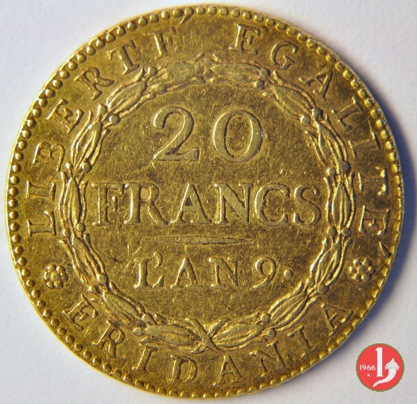 il 14 giugno del 1800 a Marengo sulle forze austro-russe. Questa moneta venne chiamata perlappunto Marengo nome poi esteso alle monete d'oro da 20 lire delle epoche successive. Dall'archivio della zecca di Torino si ricava che: dal 23 brumaio a tutto il 5° giorno dell'anno 9 (14 novembre 1800 al 22 settembre 1801) sotto l'amministrazione del direttore della zecca Paoletti, vengono coniate monete da 20 franchi per lire 266844 pari a 15813 pezzi, dal 1° vendemmiaio a tutto il 6 termidoro dell'anno 10 (dal 27 settembre 1801 al 25 luglio 1802) monete da 20 franchi per lire 89258 pari a 5287 pezzi coniati, dal 7 termidoro dell'anno 10 a tutto l'11 messidoro dell'anno 11 (dal 26 luglio 1802 al 30 giugno 1803) monete da 20 franchi pari a 64000 lire, pari a 3200 pezzi coniati; da tutto ciò si deduce che i pezzi coniati sono 15813 per l'anno 9 e 8487 per l'anno 10 coniati dalla zecca di Torino. Ad ulteriore conferma un decreto del 22 ventoso anno 9 dà l'ordine di coniazione di questa moneta con peso di grammi 6,45107 e titolo 900/1000; quindi si deduce che era da pochi giorni iniziata la coniazione dell'an 10, il che esclude solamente i 3200 coniati nella seconda tornata an 10. In contrapposizione, esiste una tesi che ipotizza che la moneta sia stata in realtà coniata a Parigi. Nella relazione del Ministero del Tesoro del 1902 figura una nota che dice I pezzi da 20 lire (marenghi) aventi il millesimo dal 1801 al 1804 furono battuti presso quest'ultima" • Sulla moneta manca effettivamente ogni segno di zecca e il cuore simbolo del maestro di zecca Paoletti. Ben curioso è anche l'errore di grafia per cui la G di Marengo diventa una C. A Torino si doveva ben conoscere il villaggio piemontese, a Parigi forse un po' meno. Lo stesso CNI, pur attribuendo il marengo alla zecca di Torino, segnala che la battitura è stata eseguita a Parigi. | |||||||||||||||
