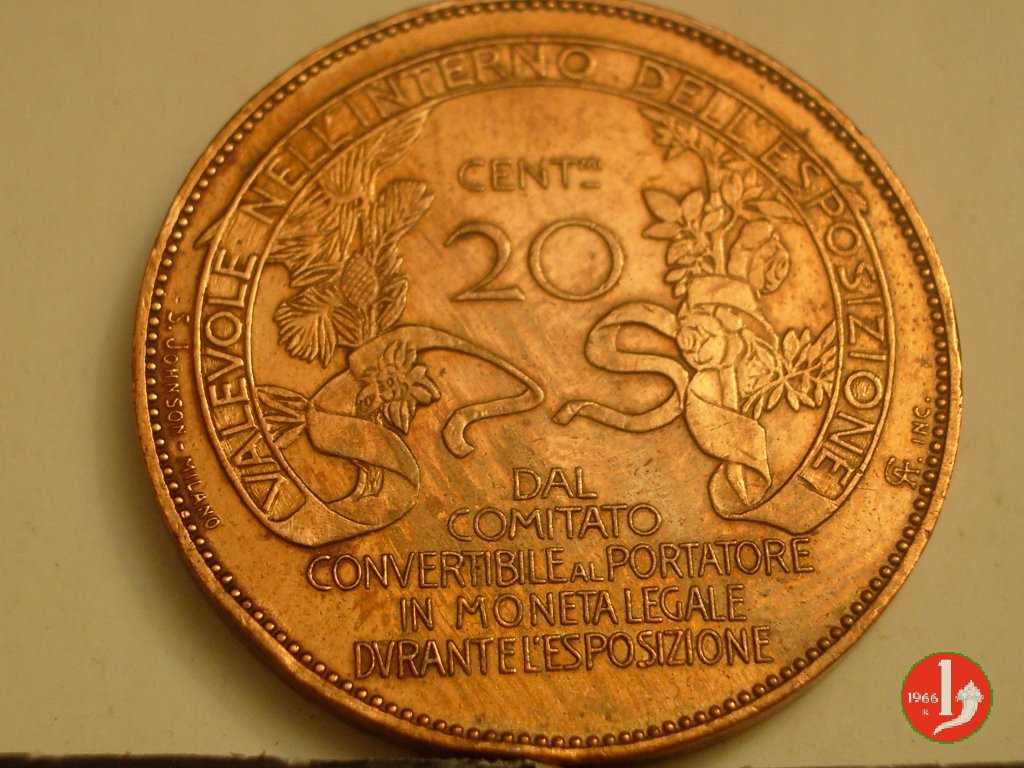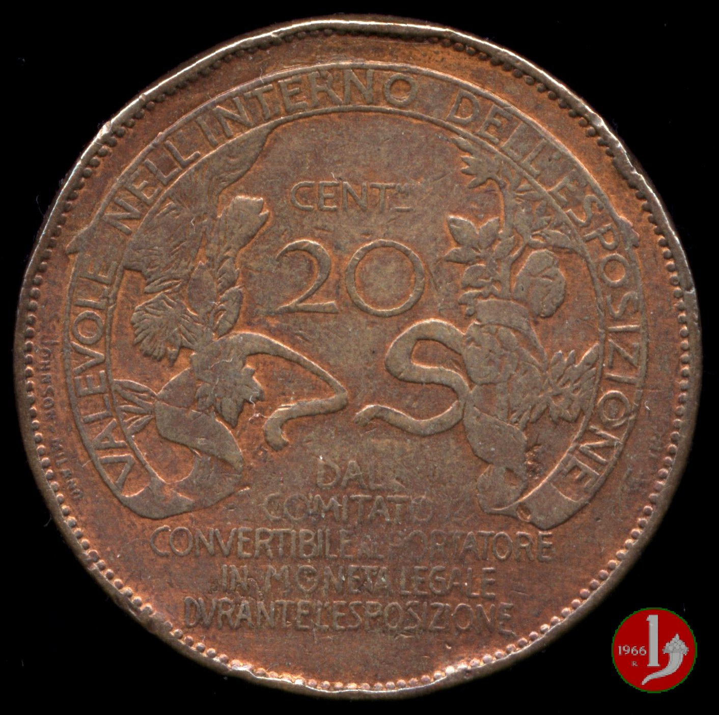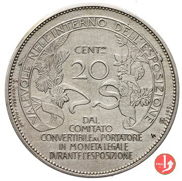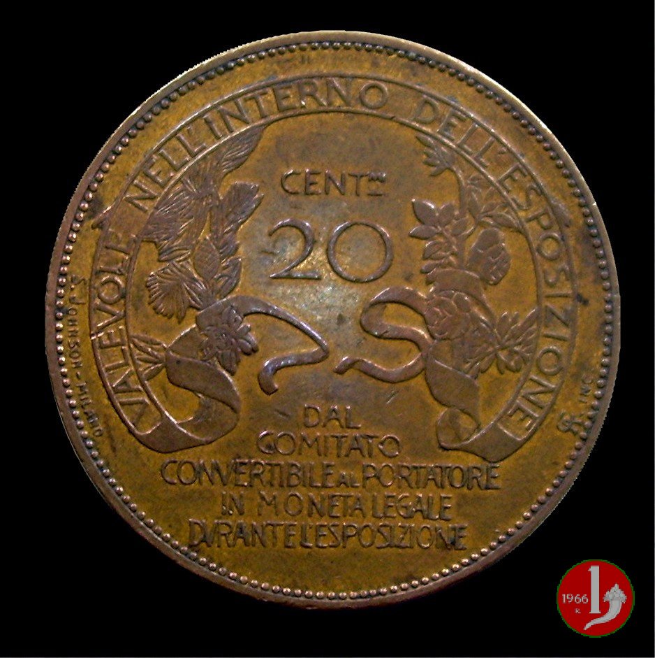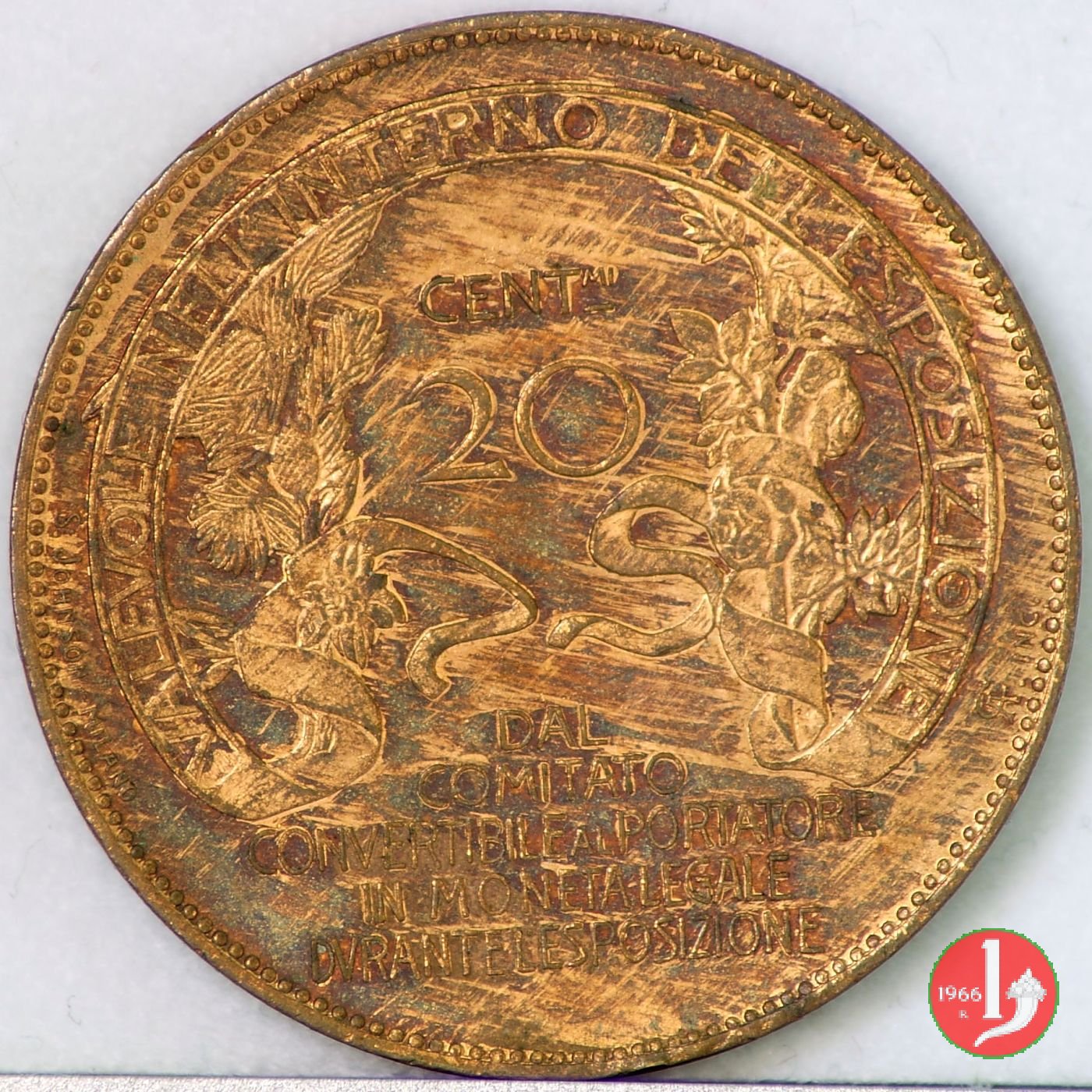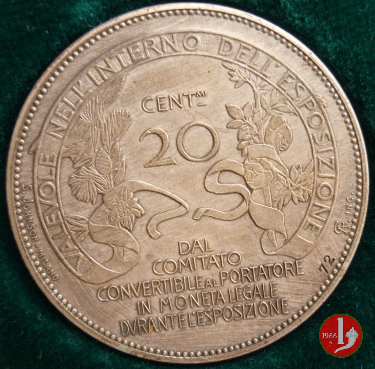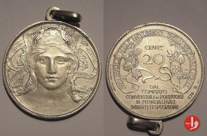 Testa di Minerva (o -secondo alcuni autori- dell'Italia oppure allegoria dell'esposizione) posta di fronte. Intorno un nastro con, in incuso, ESPOSIZIONE INTERNAZIONALE MILANO 1906. Un diadema formato da due figure che si tengono per mano corona la testa; secondo alcuni autori le due figure rappresentano l'arte e l'industria, secondo altri rappresentano l'industria Italiana e Svizzera unite dal traforo del Sempione. A sinistra indicazione dell'autore EB • (monogramma) MOD • (Egidio Boninsegna). Nastro che si avvolge circolarmente attorno a delle fronde, al suo interno VALEVOLE NELL'INTERNO DELL'ESPOSIZIONE. Nel campo indicazione del valore CENT M 20 su due righe. In basso, in orizzontale, DAL/ COMITATO/ CONVERTIBILE AL PORTATORE/ IN MONETA LEGALE/ DVRANTE L'ESPOSIZIONE su cinque righe. Lungo il bordo, a sinistra, S • JOHNSON • MILANO, a destra, monogramma CA dell'autore (Angelo Cappuccio) e INC •.