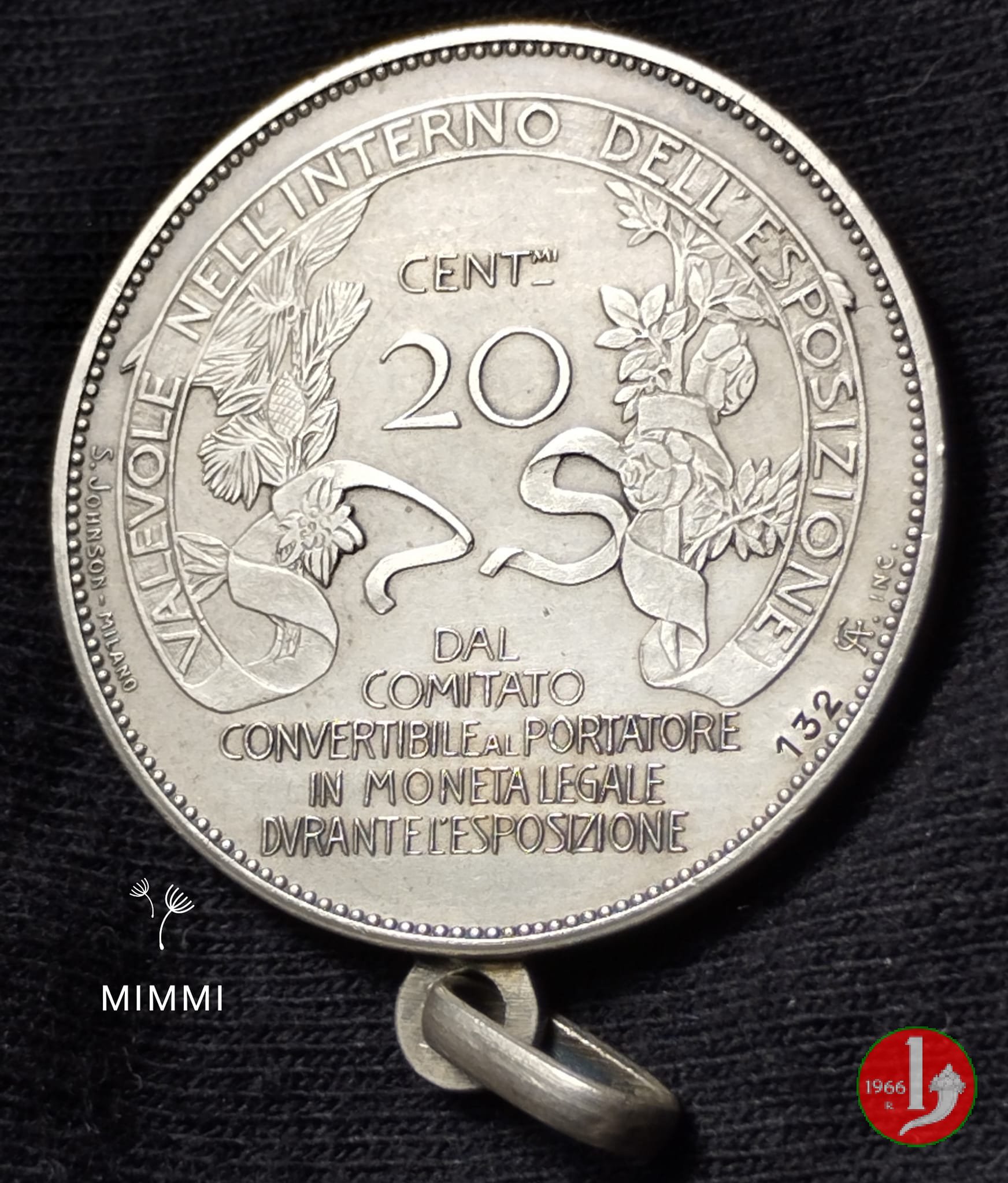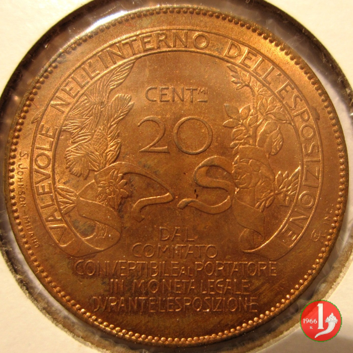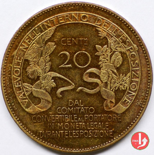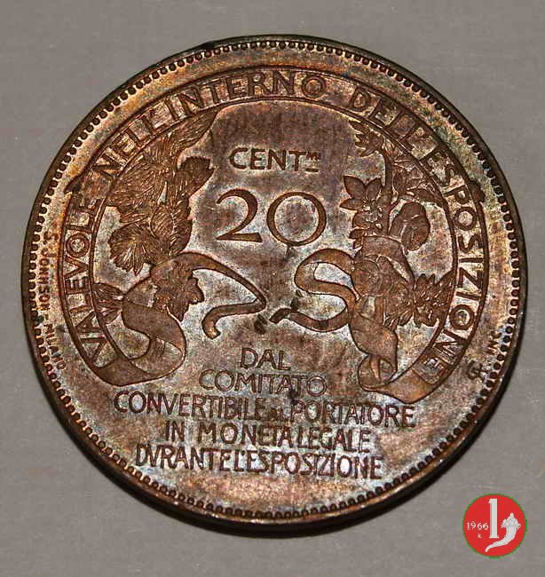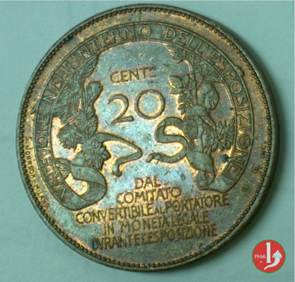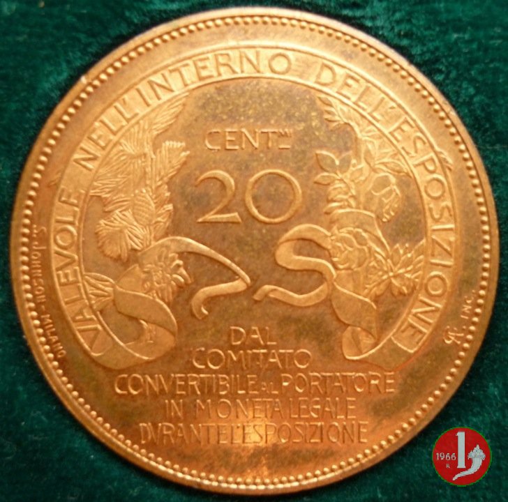 Testa di Minerva (o -secondo alcuni autori- dell'Italia oppure allegoria dell'esposizione) posta di fronte. Intorno un nastro con, in incuso, ESPOSIZIONE INTERNAZIONALE MILANO 1906. Un diadema formato da due figure che si tengono per mano corona la testa; secondo alcuni autori le due figure rappresentano l'arte e l'industria, secondo altri rappresentano l'industria Italiana e Svizzera unite dal traforo del Sempione. A sinistra indicazione dell'autore EB • (monogramma) MOD • (Egidio Boninsegna). Nastro che si avvolge circolarmente attorno a delle fronde, al suo interno VALEVOLE NELL'INTERNO DELL'ESPOSIZIONE. Nel campo indicazione del valore CENT M 20 su due righe. In basso, in orizzontale, DAL/ COMITATO/ CONVERTIBILE AL PORTATORE/ IN MONETA LEGALE/ DVRANTE L'ESPOSIZIONE su cinque righe. Lungo il bordo, a sinistra, S • JOHNSON • MILANO, a destra, monogramma CA dell'autore (Angelo Cappuccio) e INC •.