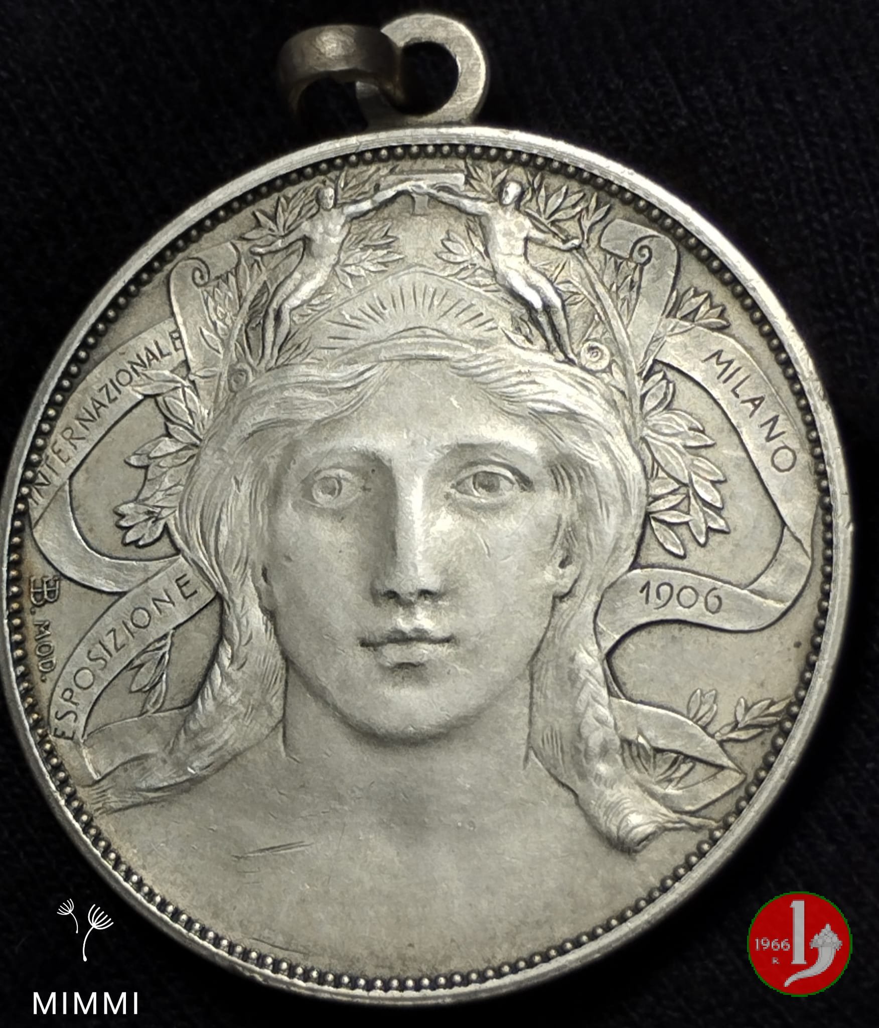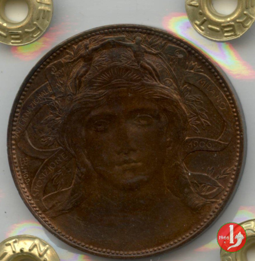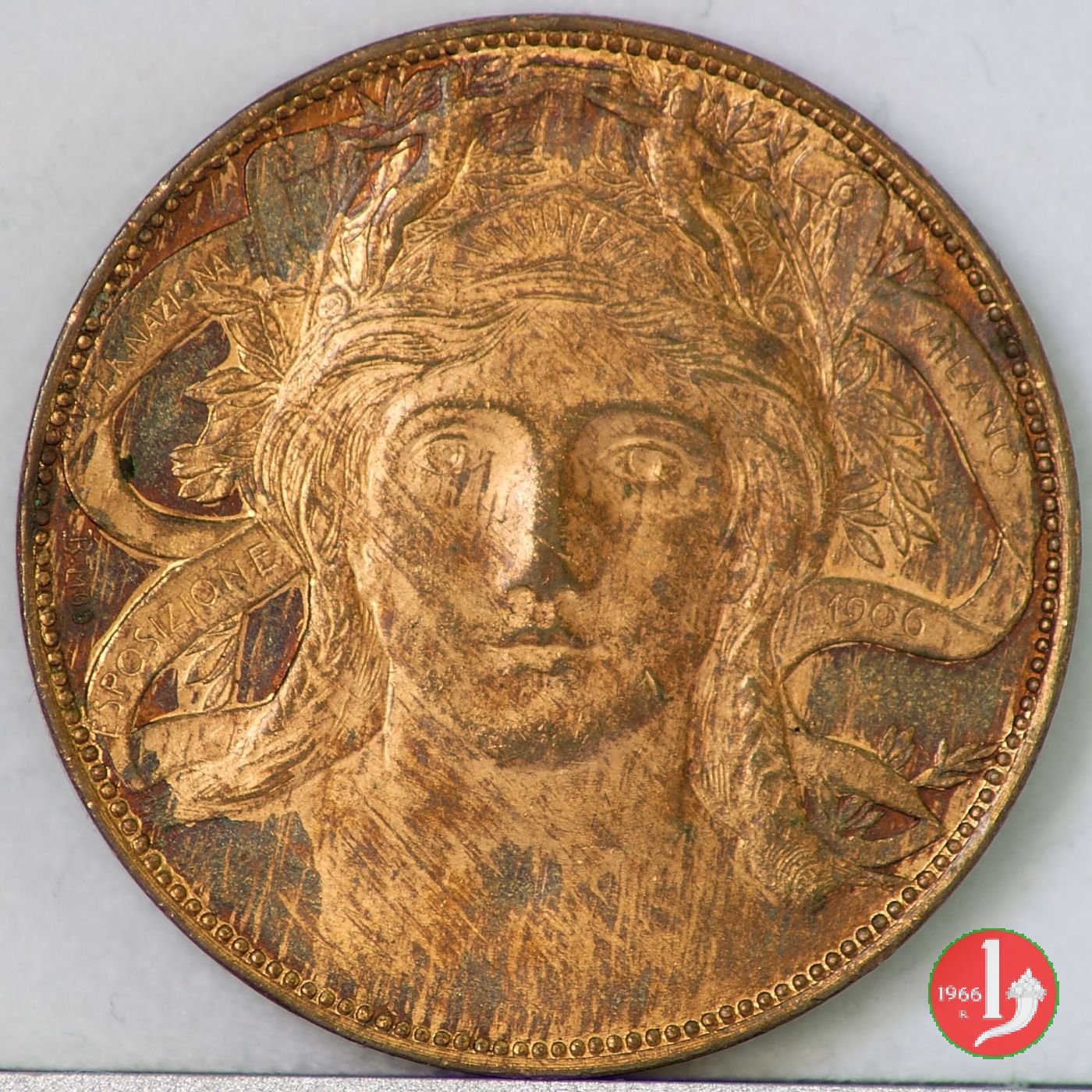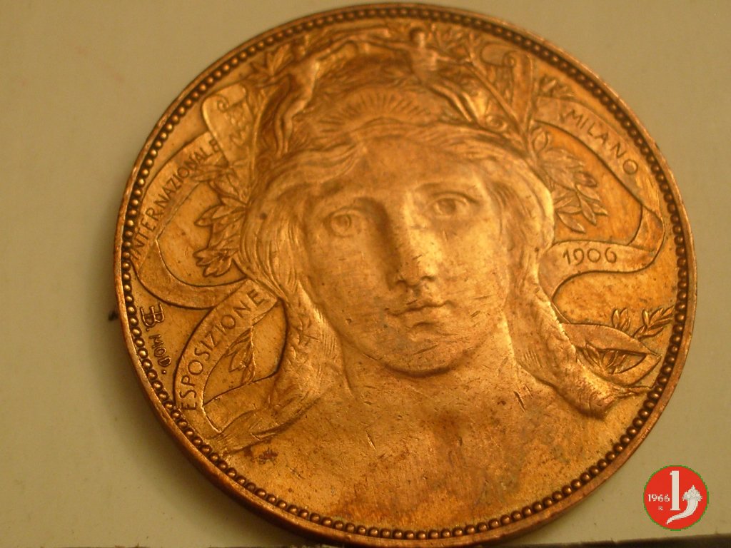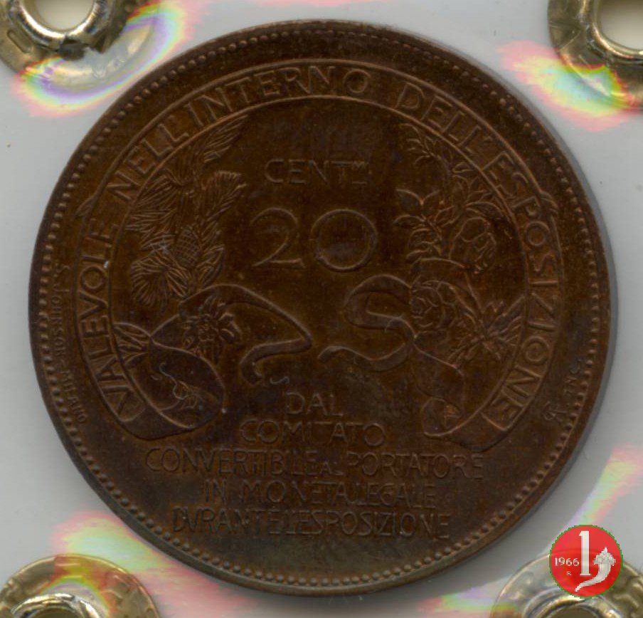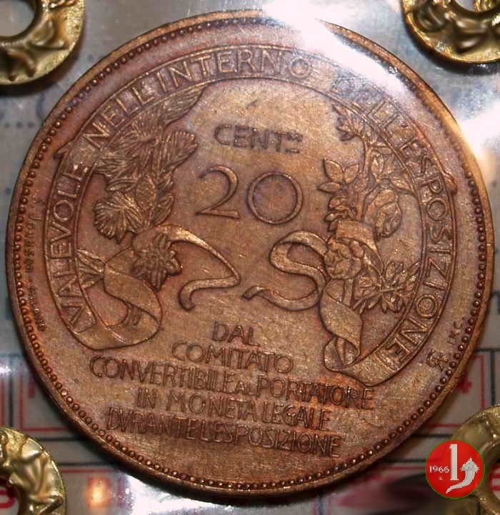 Testa di Minerva (o -secondo alcuni autori- dell'Italia oppure allegoria dell'esposizione) posta di fronte. Intorno un nastro con, in incuso, ESPOSIZIONE INTERNAZIONALE MILANO 1906. Un diadema formato da due figure che si tengono per mano corona la testa; secondo alcuni autori le due figure rappresentano l'arte e l'industria, secondo altri rappresentano l'industria Italiana e Svizzera unite dal traforo del Sempione. A sinistra indicazione dell'autore EB • (monogramma) MOD • (Egidio Boninsegna). Nastro che si avvolge circolarmente attorno a delle fronde, al suo interno VALEVOLE NELL'INTERNO DELL'ESPOSIZIONE. Nel campo indicazione del valore CENT M 20 su due righe. In basso, in orizzontale, DAL/ COMITATO/ CONVERTIBILE AL PORTATORE/ IN MONETA LEGALE/ DVRANTE L'ESPOSIZIONE su cinque righe. Lungo il bordo, a sinistra, S • JOHNSON • MILANO, a destra, monogramma CA dell'autore (Angelo Cappuccio) e INC •.