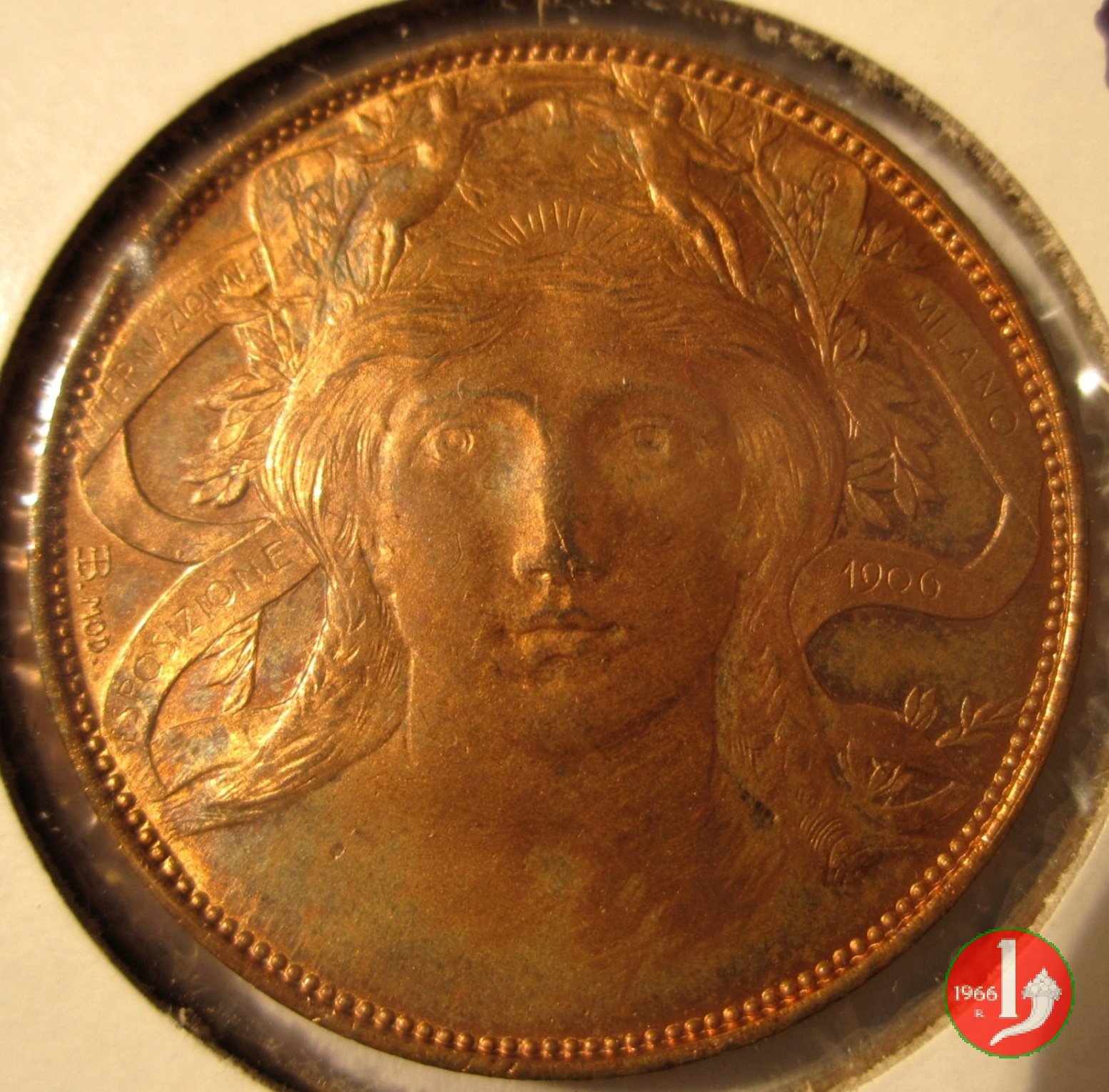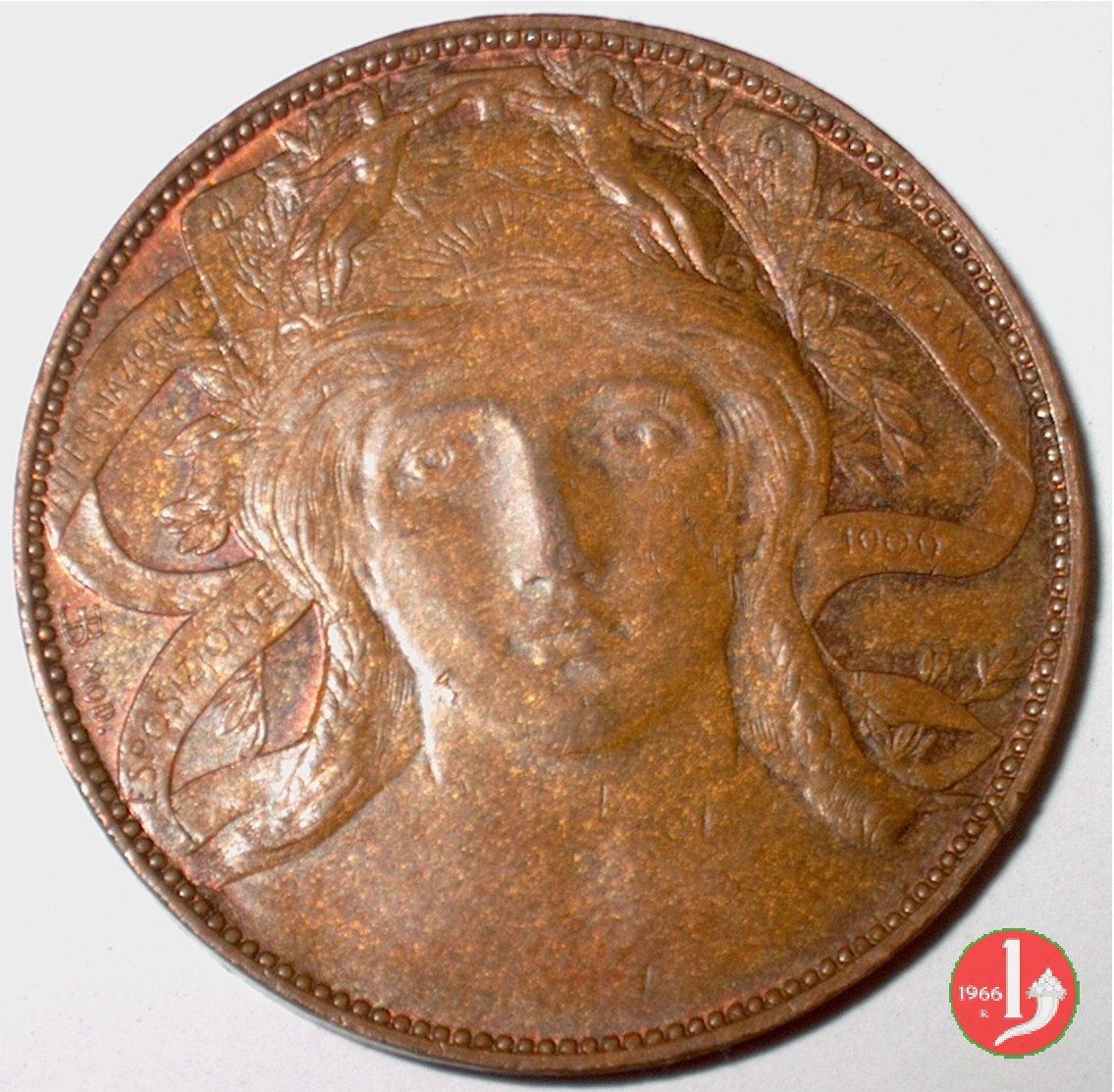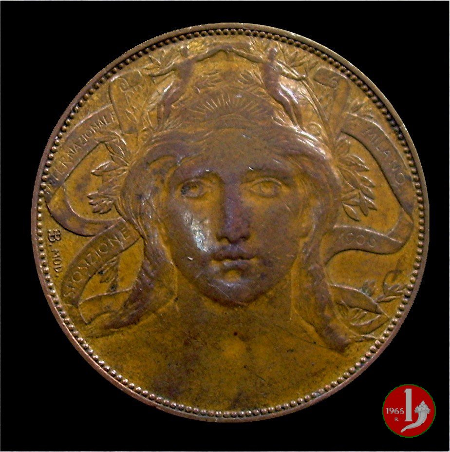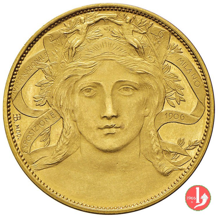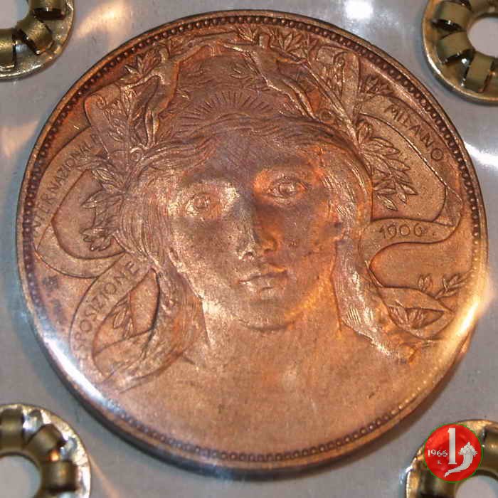 Testa di Minerva (o -secondo alcuni autori- dell'Italia oppure allegoria dell'esposizione) posta di fronte. Intorno un nastro con, in incuso, ESPOSIZIONE INTERNAZIONALE MILANO 1906. Un diadema formato da due figure che si tengono per mano corona la testa; secondo alcuni autori le due figure rappresentano l'arte e l'industria, secondo altri rappresentano l'industria Italiana e Svizzera unite dal traforo del Sempione. A sinistra indicazione dell'autore EB • (monogramma) MOD • (Egidio Boninsegna). Nastro che si avvolge circolarmente attorno a delle fronde, al suo interno VALEVOLE NELL'INTERNO DELL'ESPOSIZIONE. Nel campo indicazione del valore CENT M 20 su due righe. In basso, in orizzontale, DAL/ COMITATO/ CONVERTIBILE AL PORTATORE/ IN MONETA LEGALE/ DVRANTE L'ESPOSIZIONE su cinque righe. Lungo il bordo, a sinistra, S • JOHNSON • MILANO, a destra, monogramma CA dell'autore (Angelo Cappuccio) e INC •.
