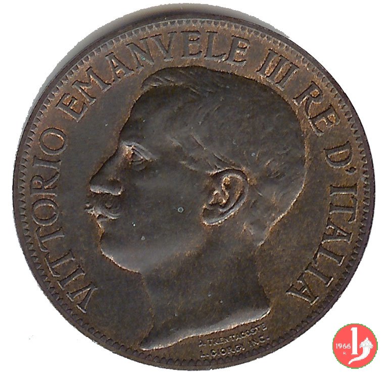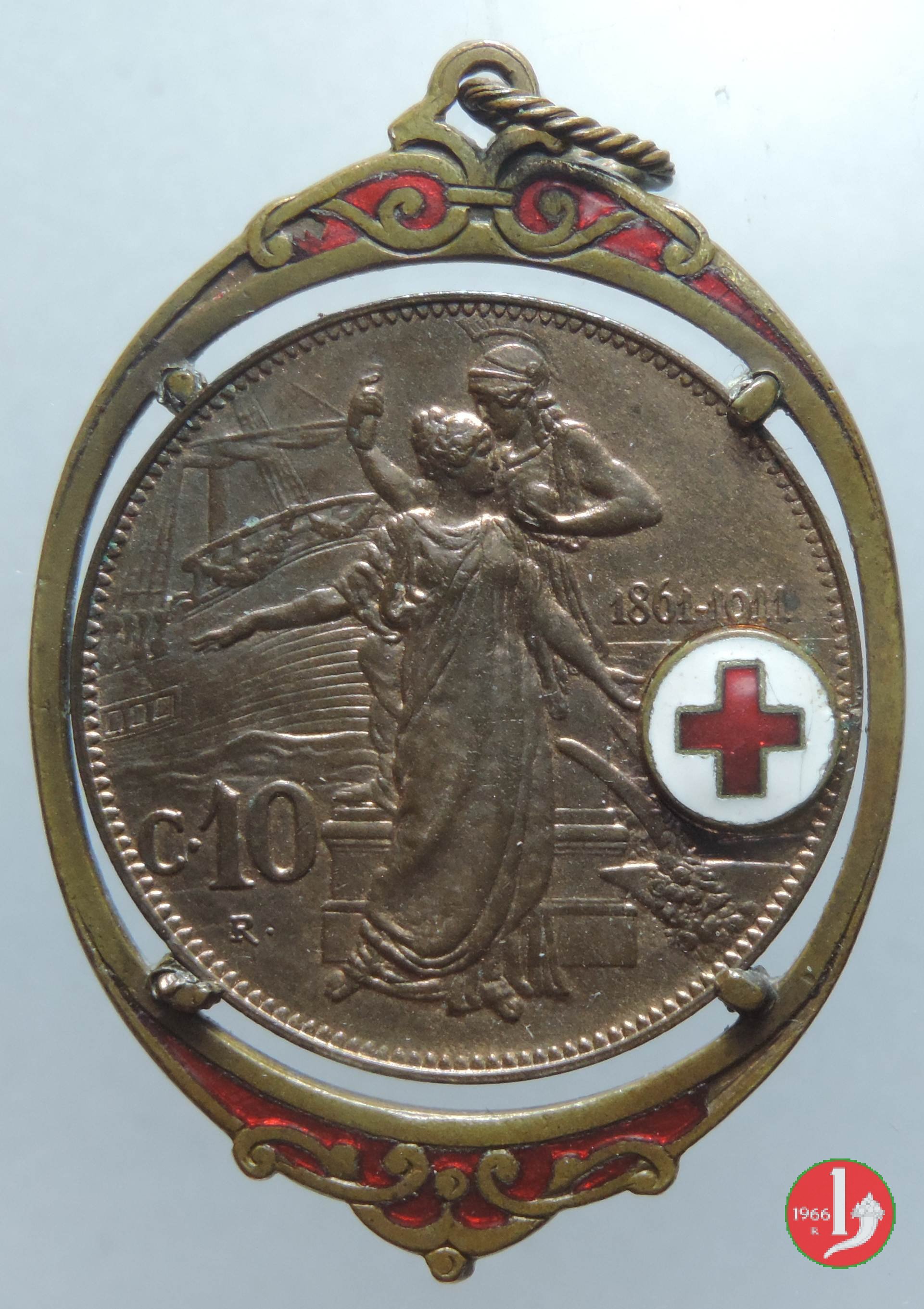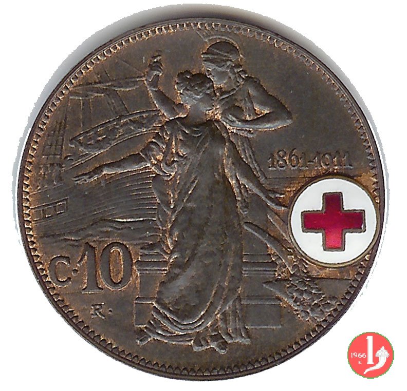Due figure allegoriche che simboleggiano l'Italia (la figura femminile) e la città di Roma (la figura maschile posta su di un piedistallo al cui lato si intravede un aratro). Sullo sfondo la prora di una nave mercantile. A destra le date 1861-1911. A sinistra l'indicazione del valore (C.10) e sotto il segno di zecca (R). Sotto le date applicazione di una croce rossa su sfondo bianco a smalto. Testa del Re volta a sinistra, attorno: VITTORIO EMANUELE III RE D'ITALIA. Sotto il collo del Re i nomi dell'autore (D. TRENTECOSTE) e dell'incisore (L. Giorgi Inc.).