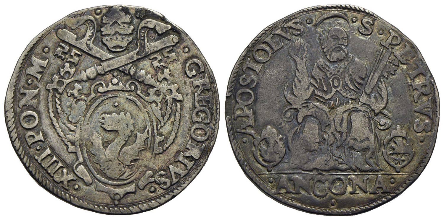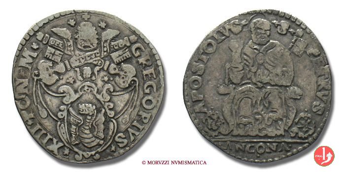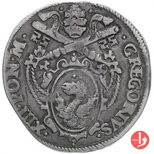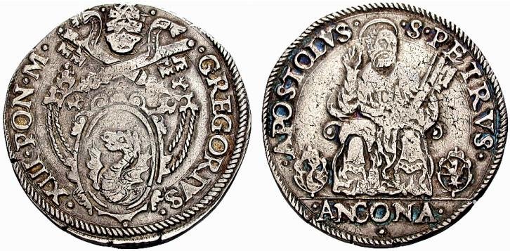 D/ • GREGORIVS •__ •XIII •PON •M •/Stemma piú piccolo e sopra la cimasa 3 stellette a raggi irregolari e chiavi a triplo cordone con fiocco