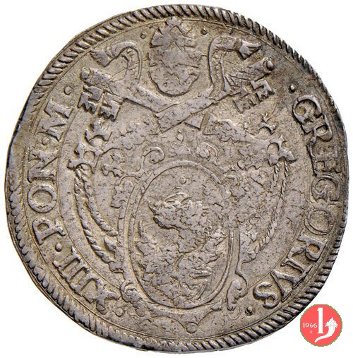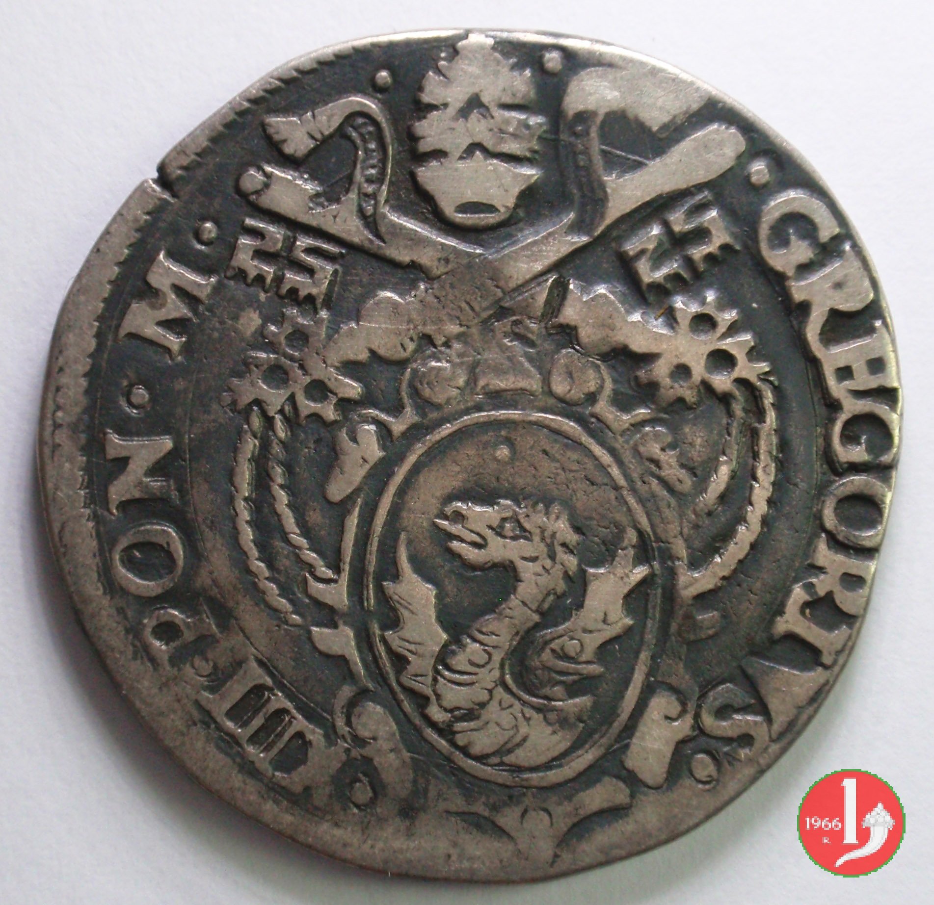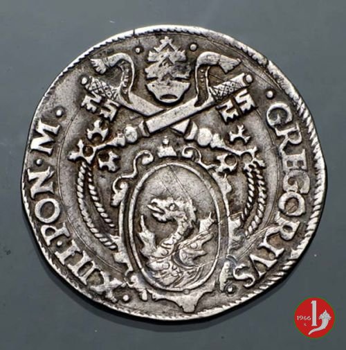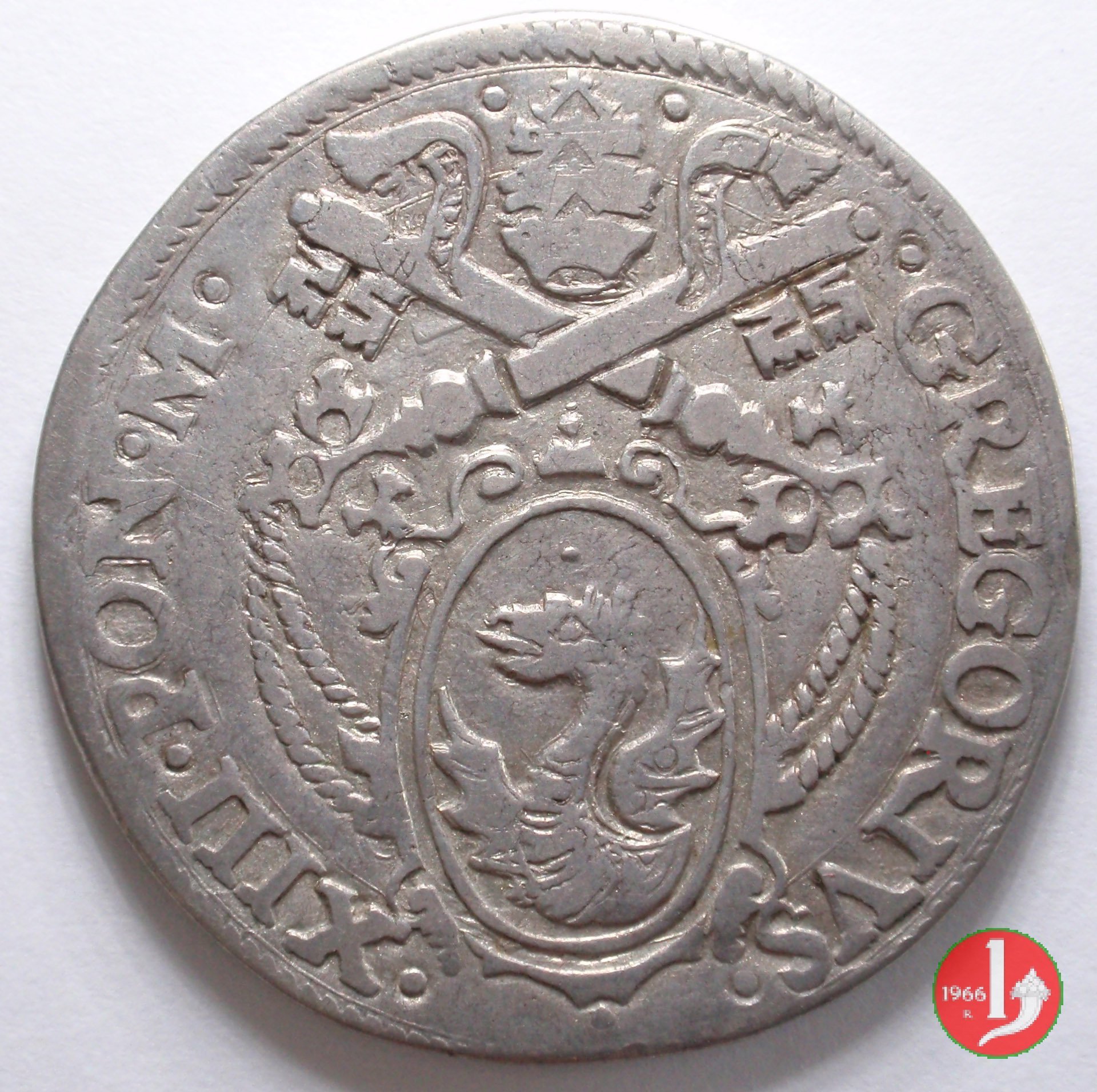 D/ • GREGORIVS •__ •XIII •PON •M •/Stemma piú piccolo e sopra la cimasa 3 stellette a 6 raggi; chiavi a triplo cordone con fiocco