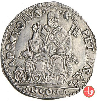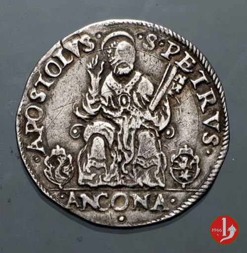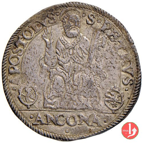 (da sinistra)S •PETRVS •AP__OSTOLVS • /S.Pietro nimbato seduto di fronte su trono con braccioli a volute, piviale con fibbia, con la destra benedice e con la sinistra regge 2 grosse chiavi oblique verso l'esterno; in b. ai lati del trono 2 armette, a sinistra di Cristoforo Boncompagni (Governatore di Ancona) e a destra di Alessandroi Casali (Commiss. Camera Apostolica); Esergo •ANCONA •