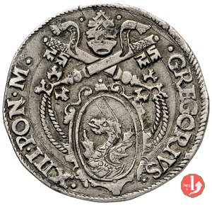 . •GREGORIVS •__ •XIII •PON •M • • /Stemma ovale a leggeri intagli e cimasa, sormontato da chiavi dec. a doppio cordone e da tiara (da sinistra)S •PETRVS •AP__OSTOLVS • /S.Pietro nimbato seduto di fronte su trono con braccioli a volute, piviale con fibbia, con la destra benedice e con la sinistra regge 2 grosse chiavi oblique verso l'esterno; in b. ai lati del trono 2 armette, a sinistra di Cristoforo Boncompagni (Governatore di Ancona) e a destra di Alessandroi Casali (Commiss. Camera Apostolica); Esergo •ANCONA •