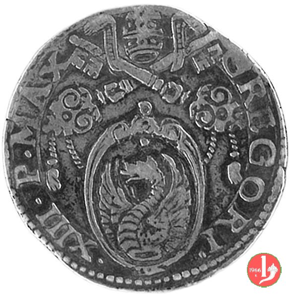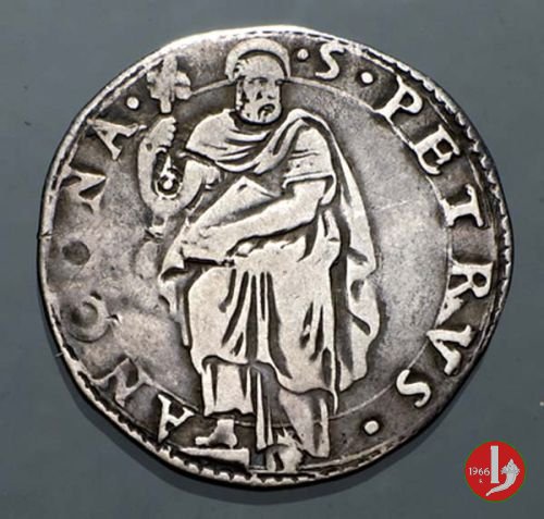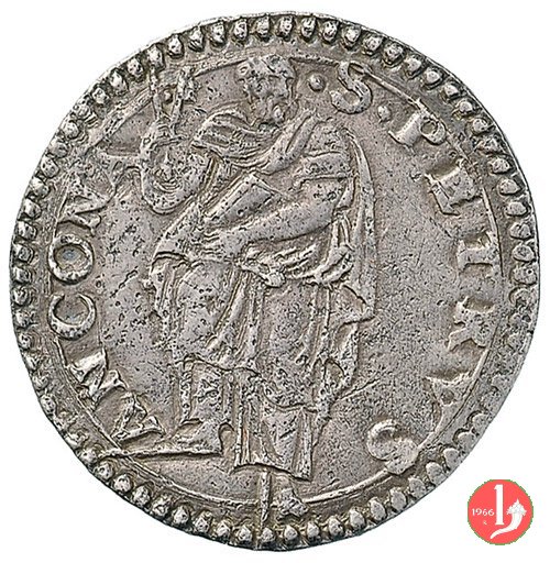 10 D/GREGORI •__XIII •PONT •MAX • /Cornice semplice con 2 volute e nulla sopra R/ •S •PETRVS__ANCONA •/S.Pietro nimbato, il piede su gradino, tiene con la destra le chiavi erette con cordone e fiocco