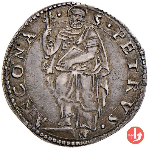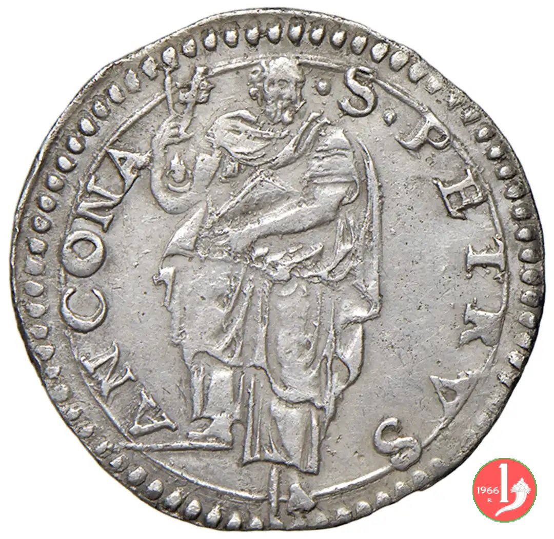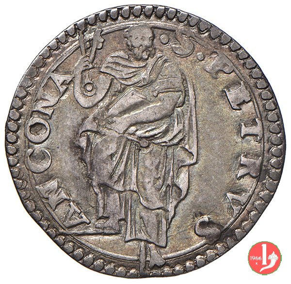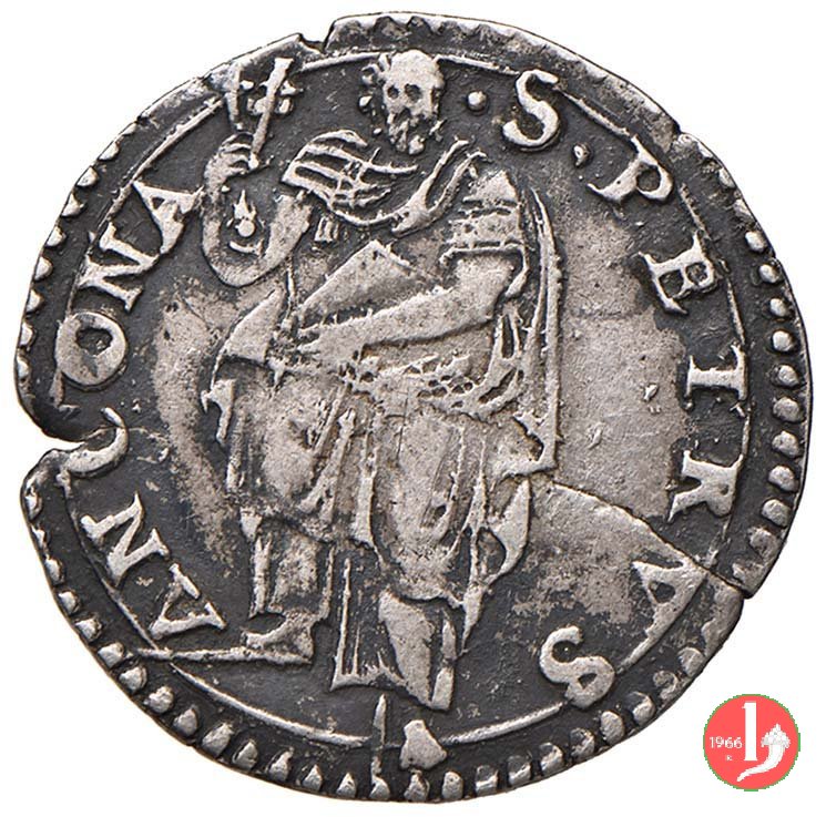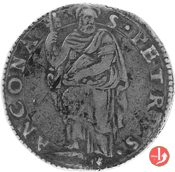 3 D/GREGORI •__XIII •P •MAX • /Stemma ovale in cartella semplice con anelletto sopra; chiavi a doppio cordone con fiocco R/S •PETRVS •__ANCONA • /S.Pietro nimbato, il piede su gradino, tiene con la destra le chiavi erette con cordone e fiocco