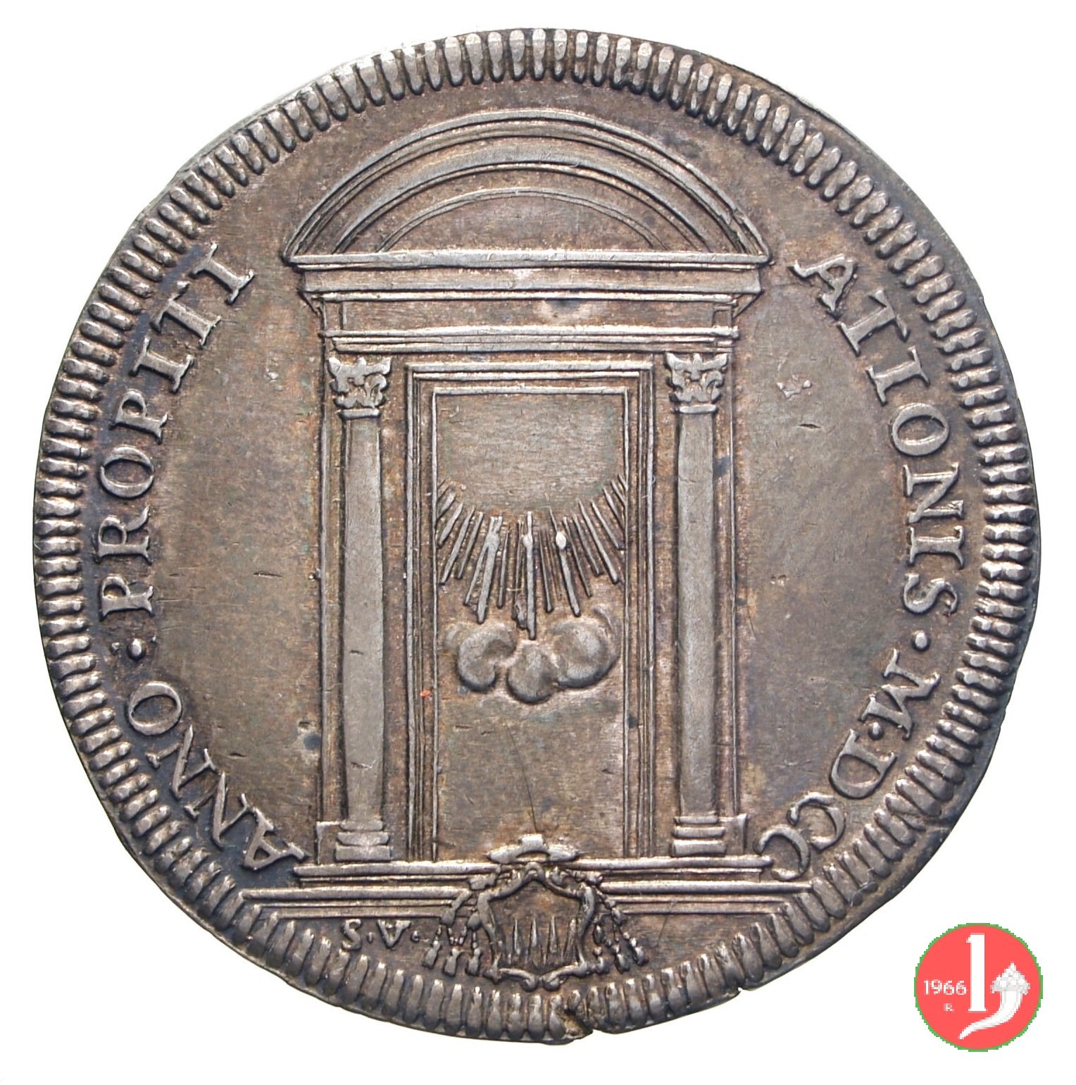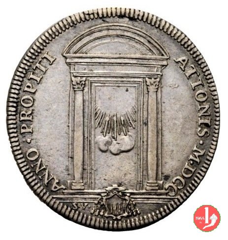 Porta Santa, nel vano: splendori. All'esergo armetta del Presidente delle Zecche, mons. Anguissola; sotto la linea d'esergo a sx, iniziali dell'incisore.