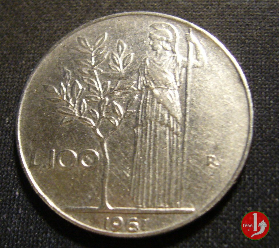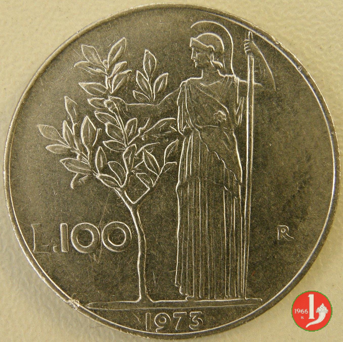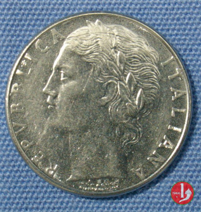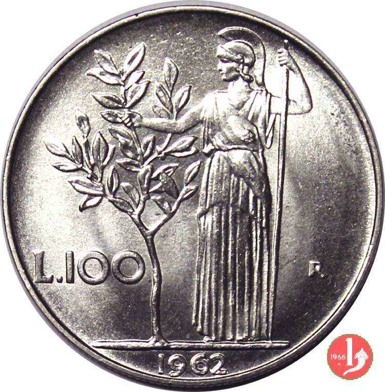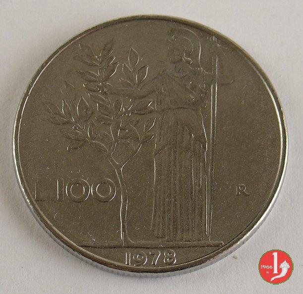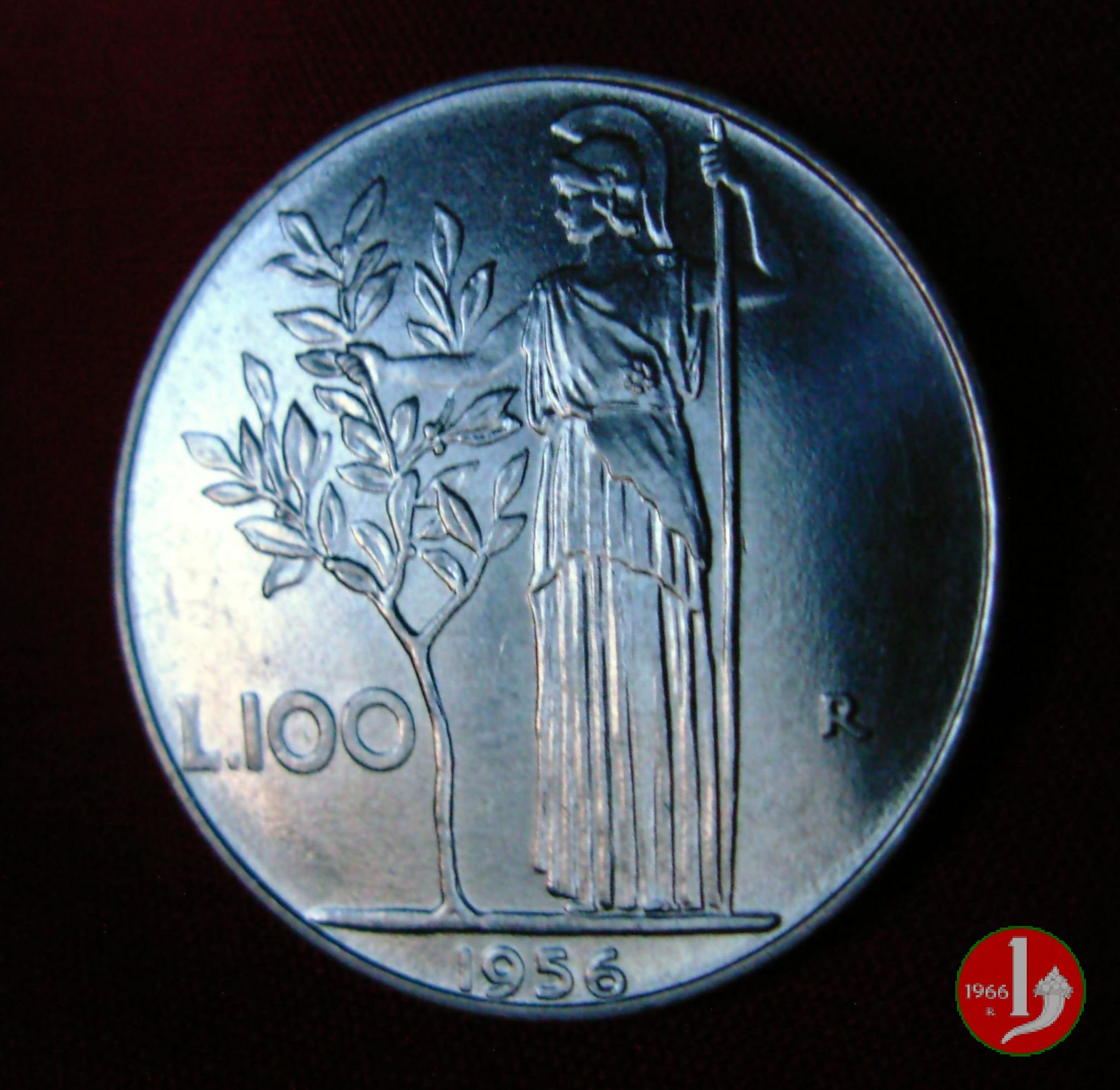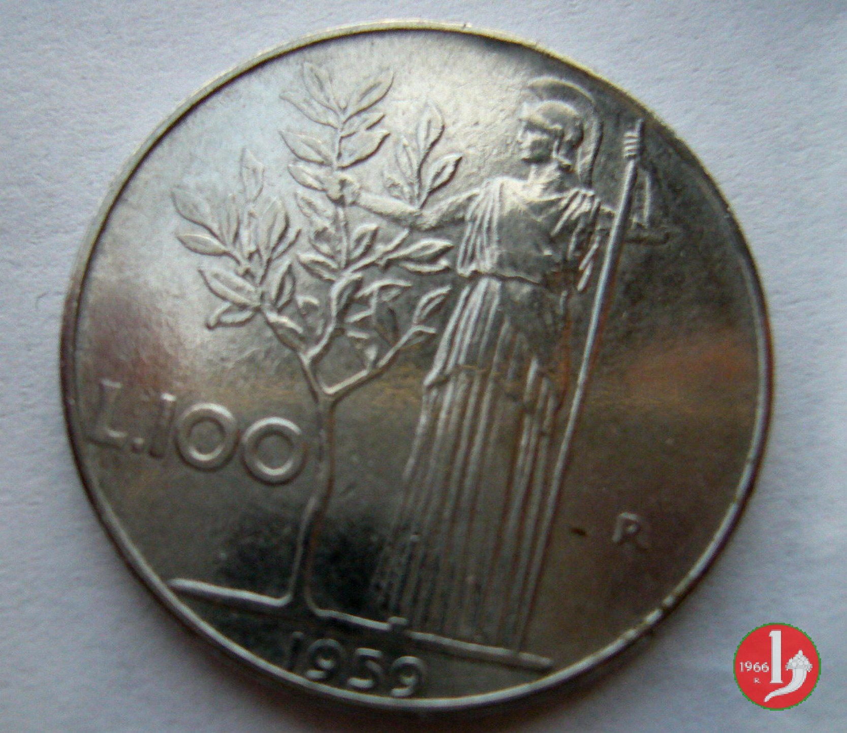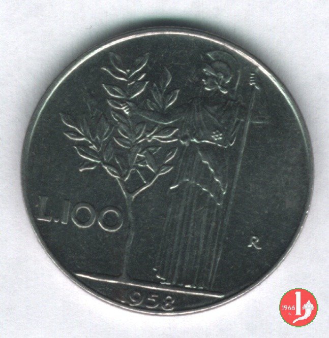 Testa di donna volta a sinistra con il capo cinto da una corona di alloro. Intorno REPVBBLICA ITALIANA. Sotto l'indicazione degli autori (ROMAGNOLI GIAMPAOLI INC •) su due righe. Minerva che protende la destra verso un albero di alloro e regge con la sinistra una lancia. A destra segno di zecca (R), a sinistra indicazione del valore (L. 100). In esergo il millesimo.
