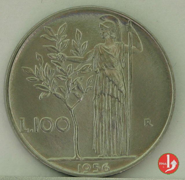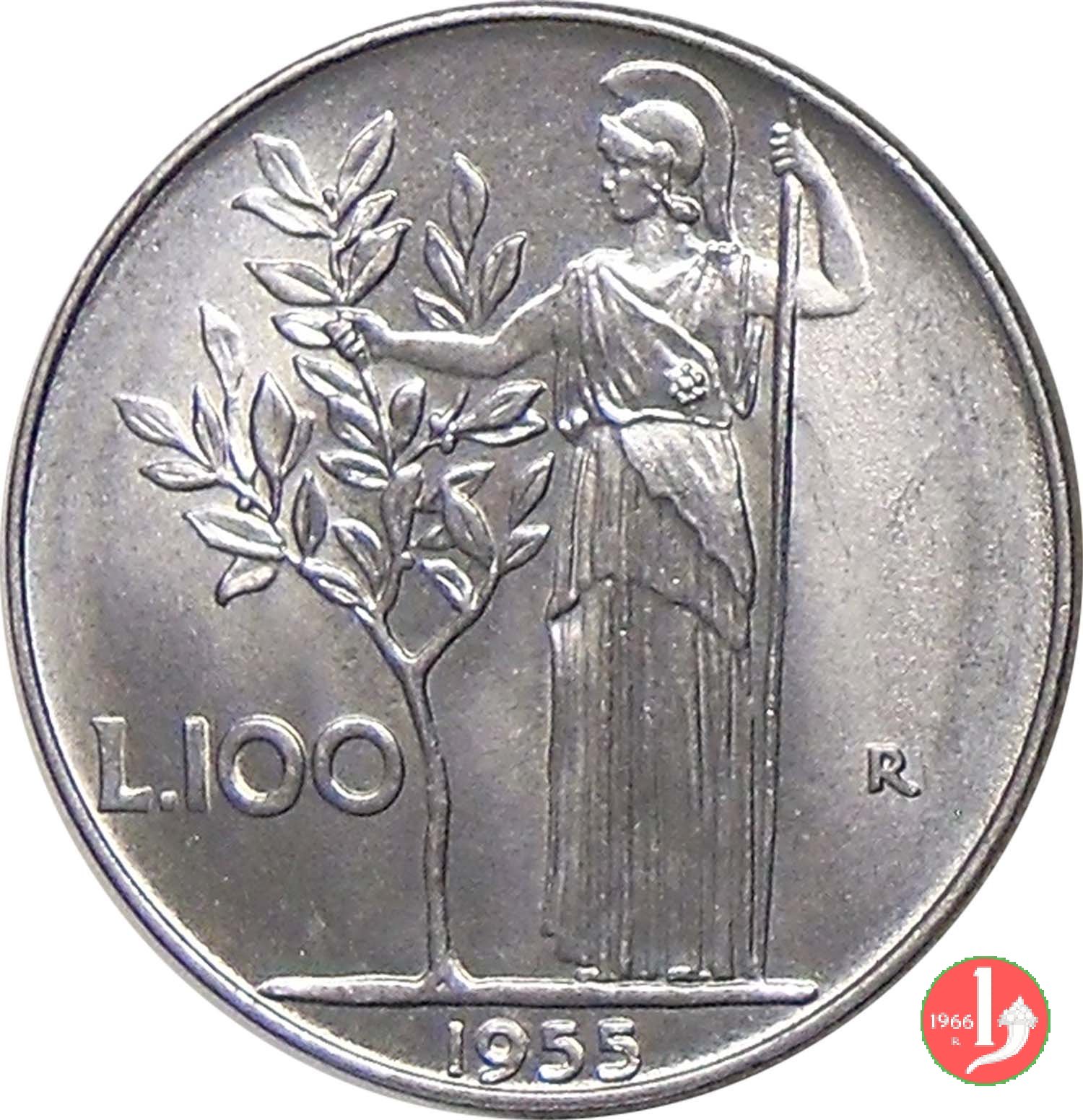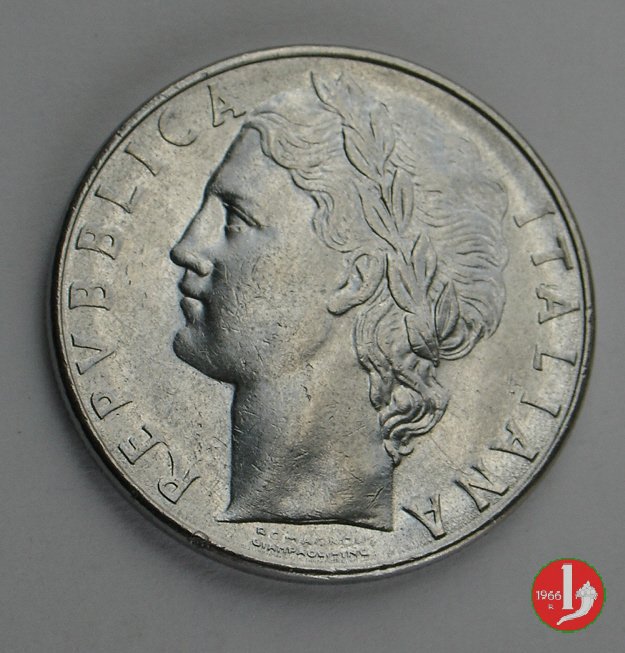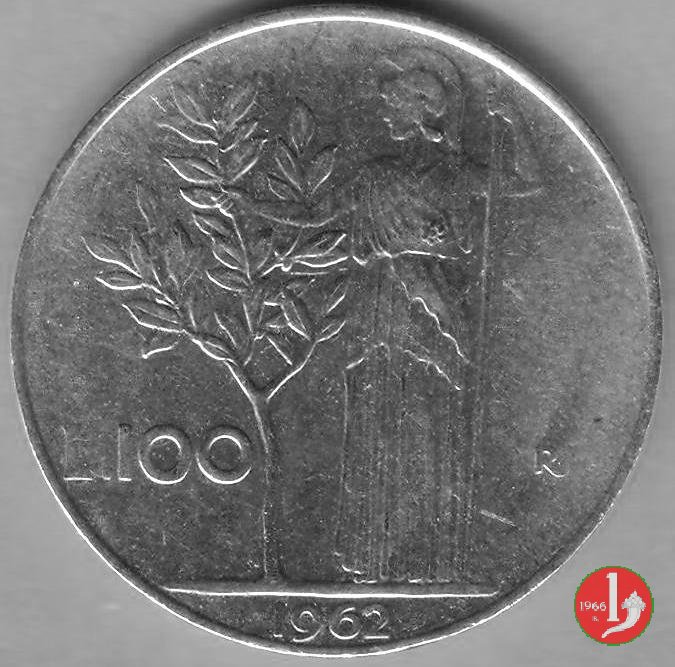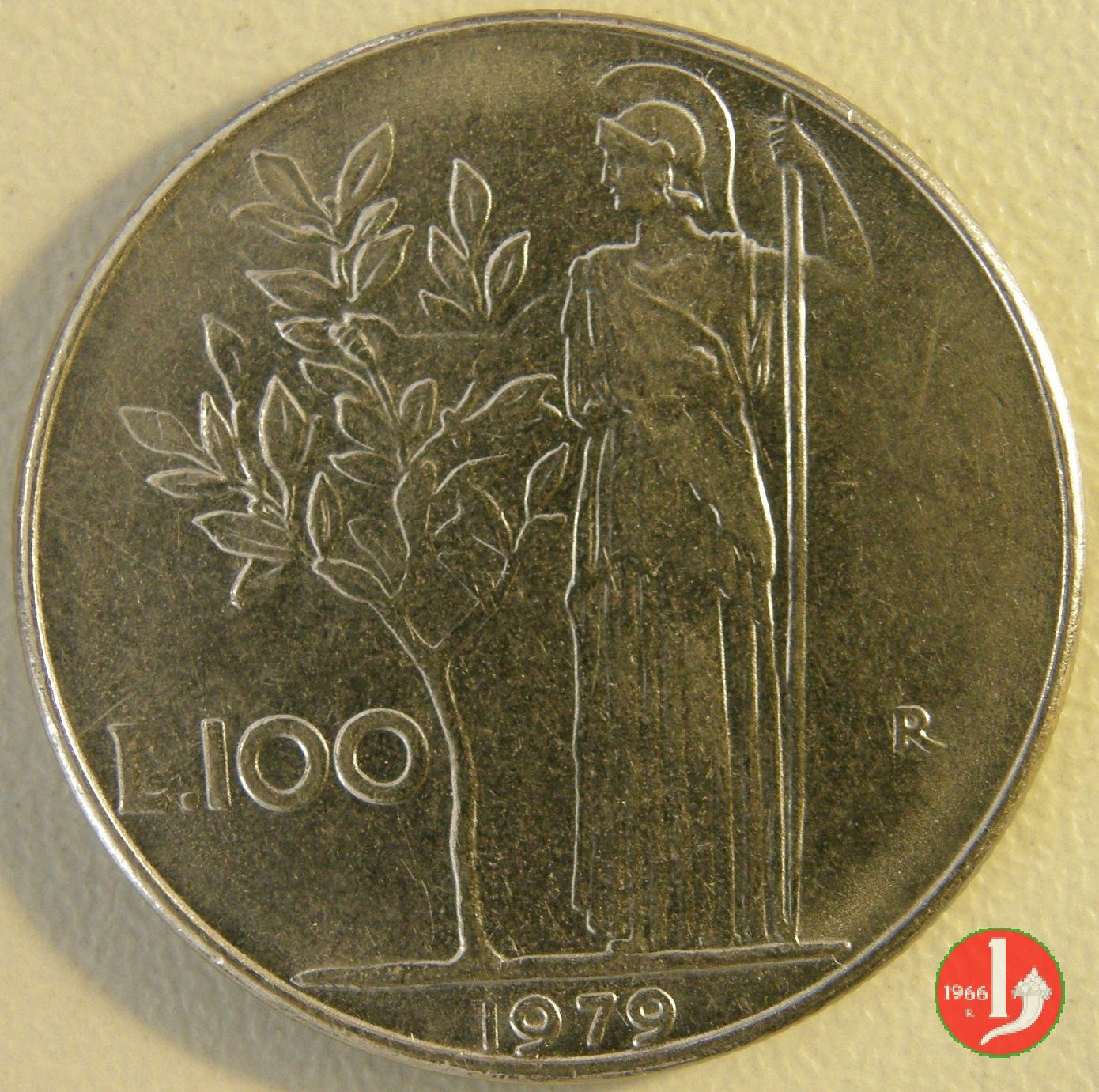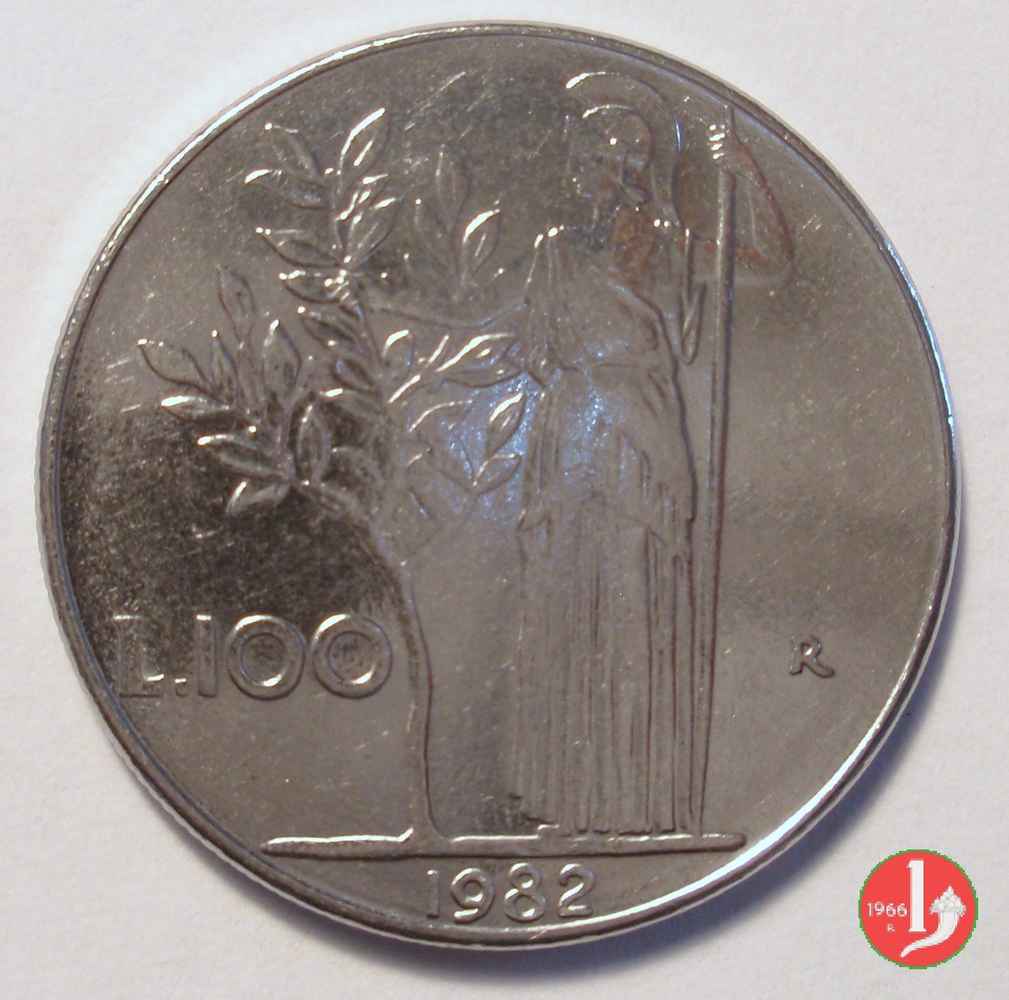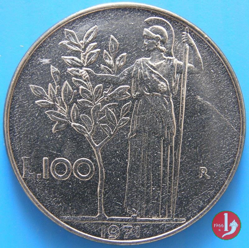 Testa di donna volta a sinistra con il capo cinto da una corona di alloro. Intorno REPVBBLICA ITALIANA. Sotto l'indicazione degli autori (ROMAGNOLI GIAMPAOLI INC •) su due righe. Minerva che protende la destra verso un albero di alloro e regge con la sinistra una lancia. A destra segno di zecca (R), a sinistra indicazione del valore (L. 100). In esergo il millesimo.