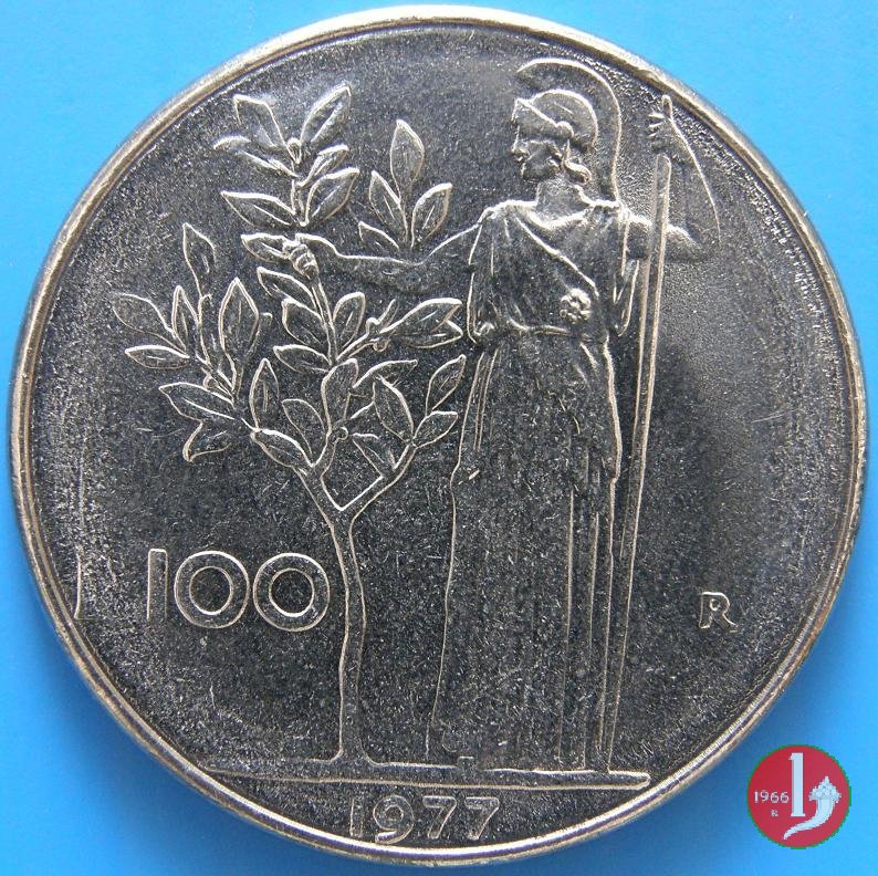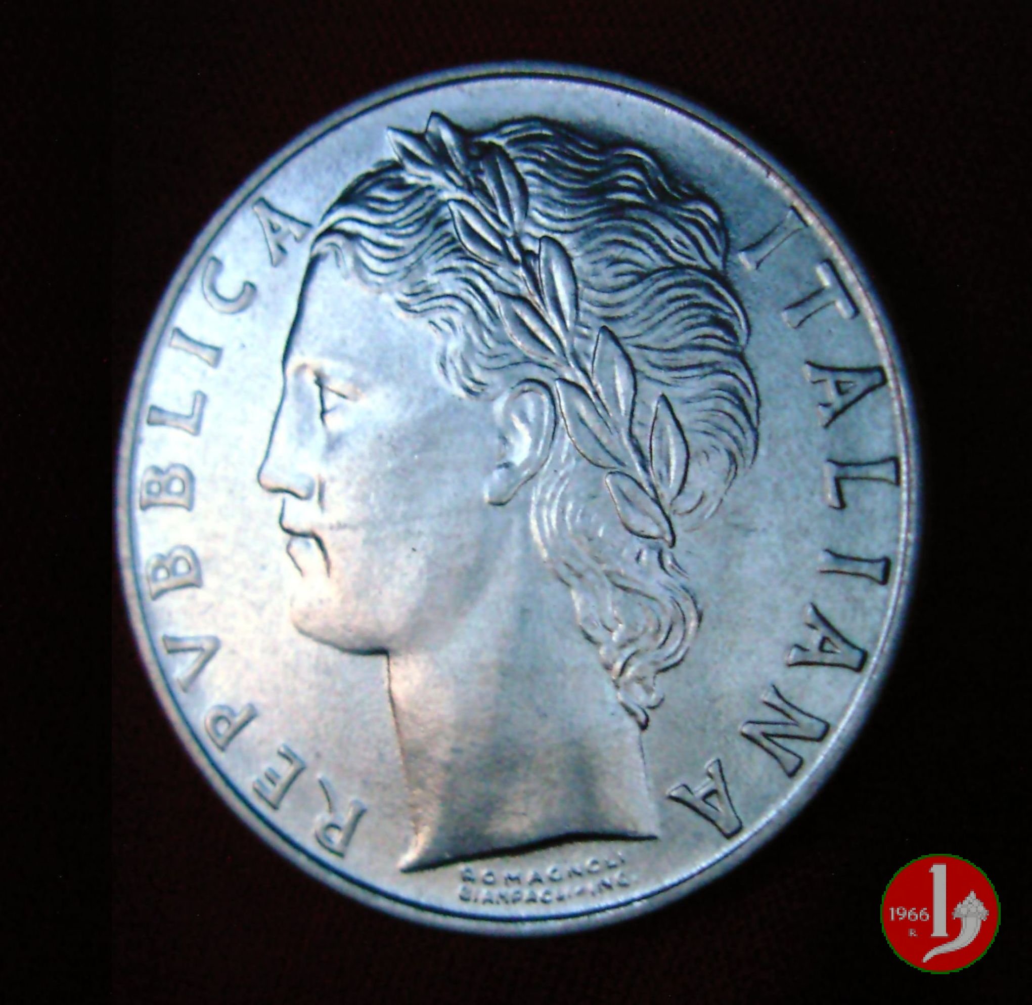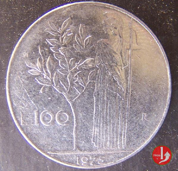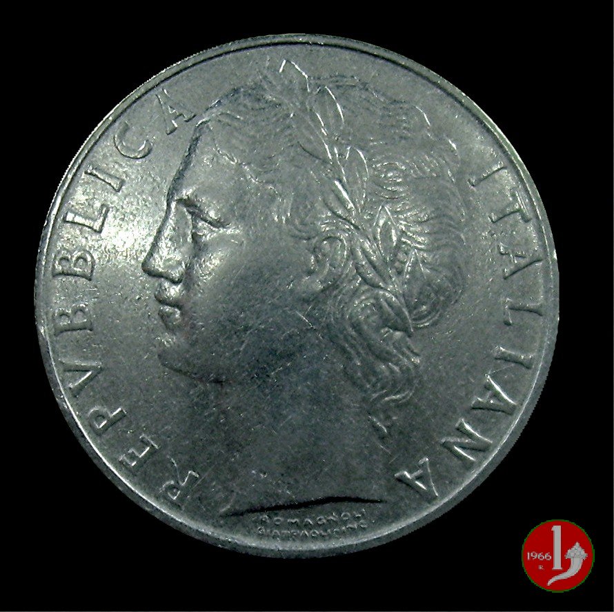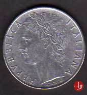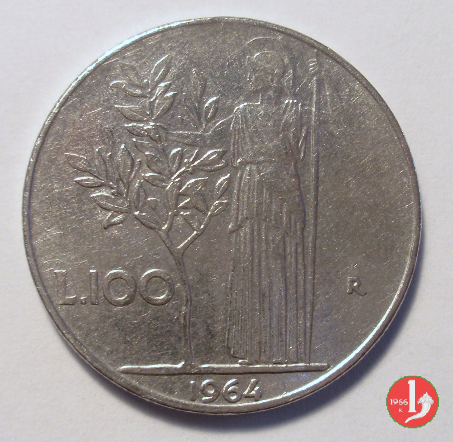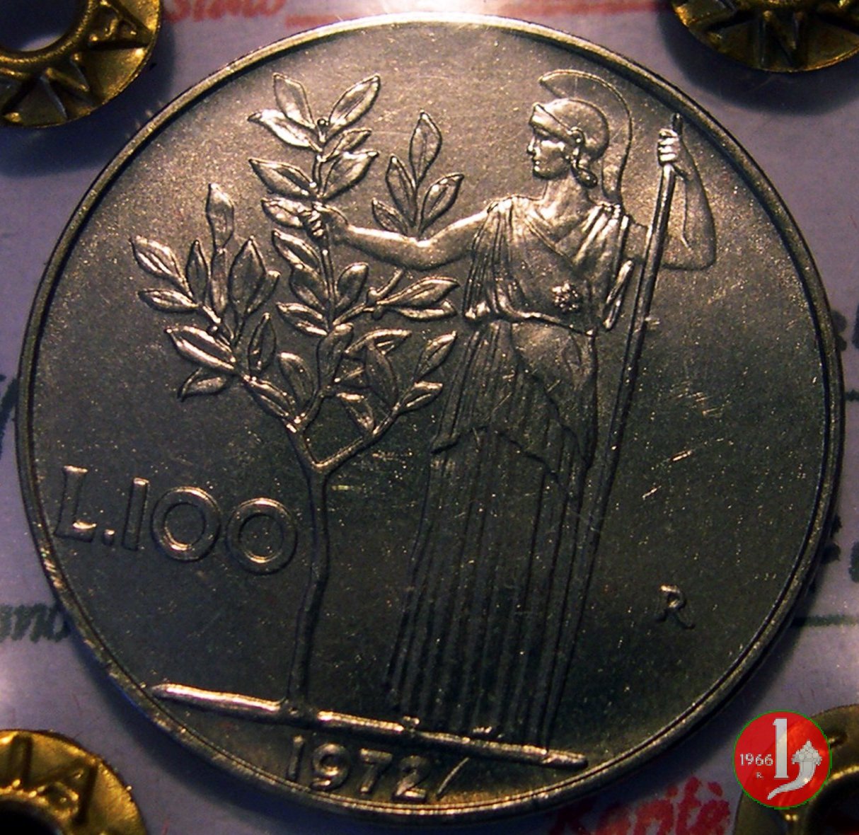 Testa di donna volta a sinistra con il capo cinto da una corona di alloro. Intorno REPVBBLICA ITALIANA. Sotto l'indicazione degli autori (ROMAGNOLI GIAMPAOLI INC •) su due righe. Minerva che protende la destra verso un albero di alloro e regge con la sinistra una lancia. A destra segno di zecca (R), a sinistra indicazione del valore (L. 100). In esergo il millesimo.