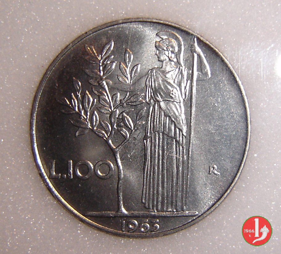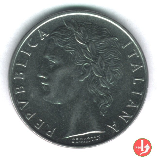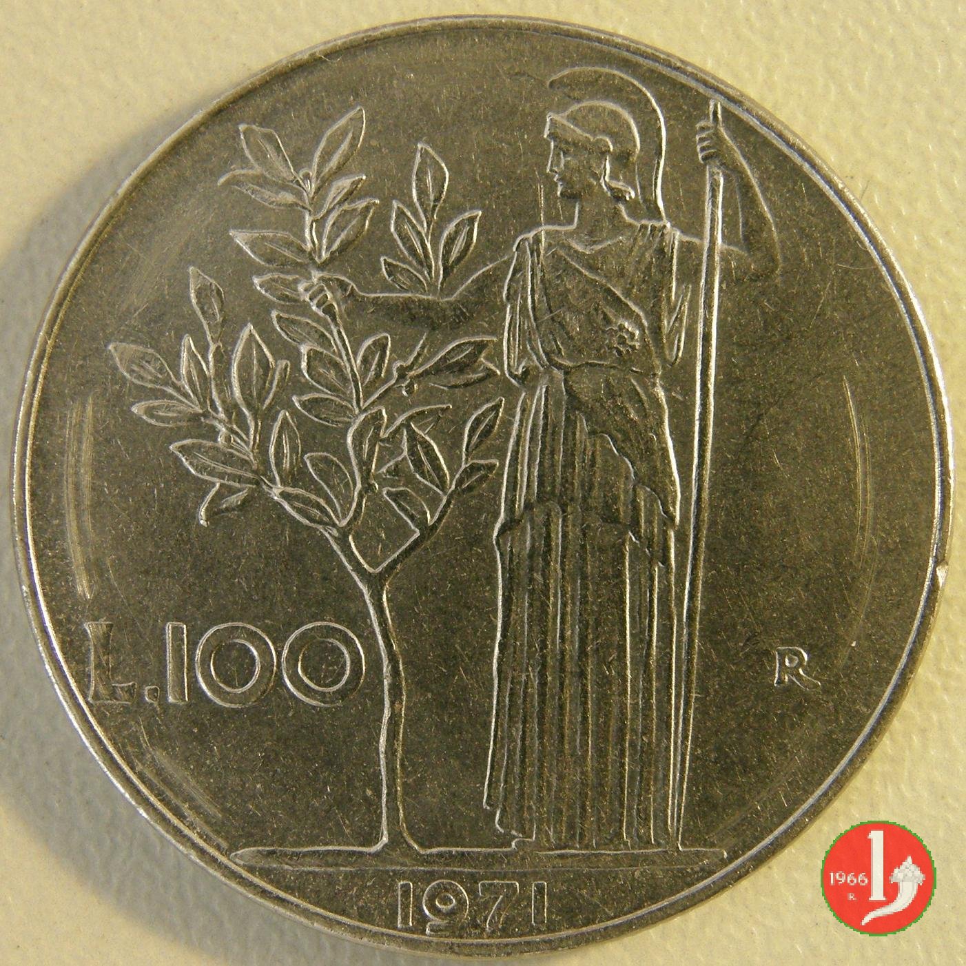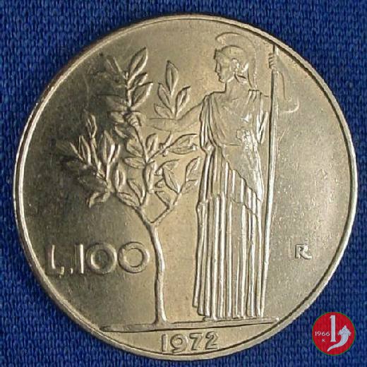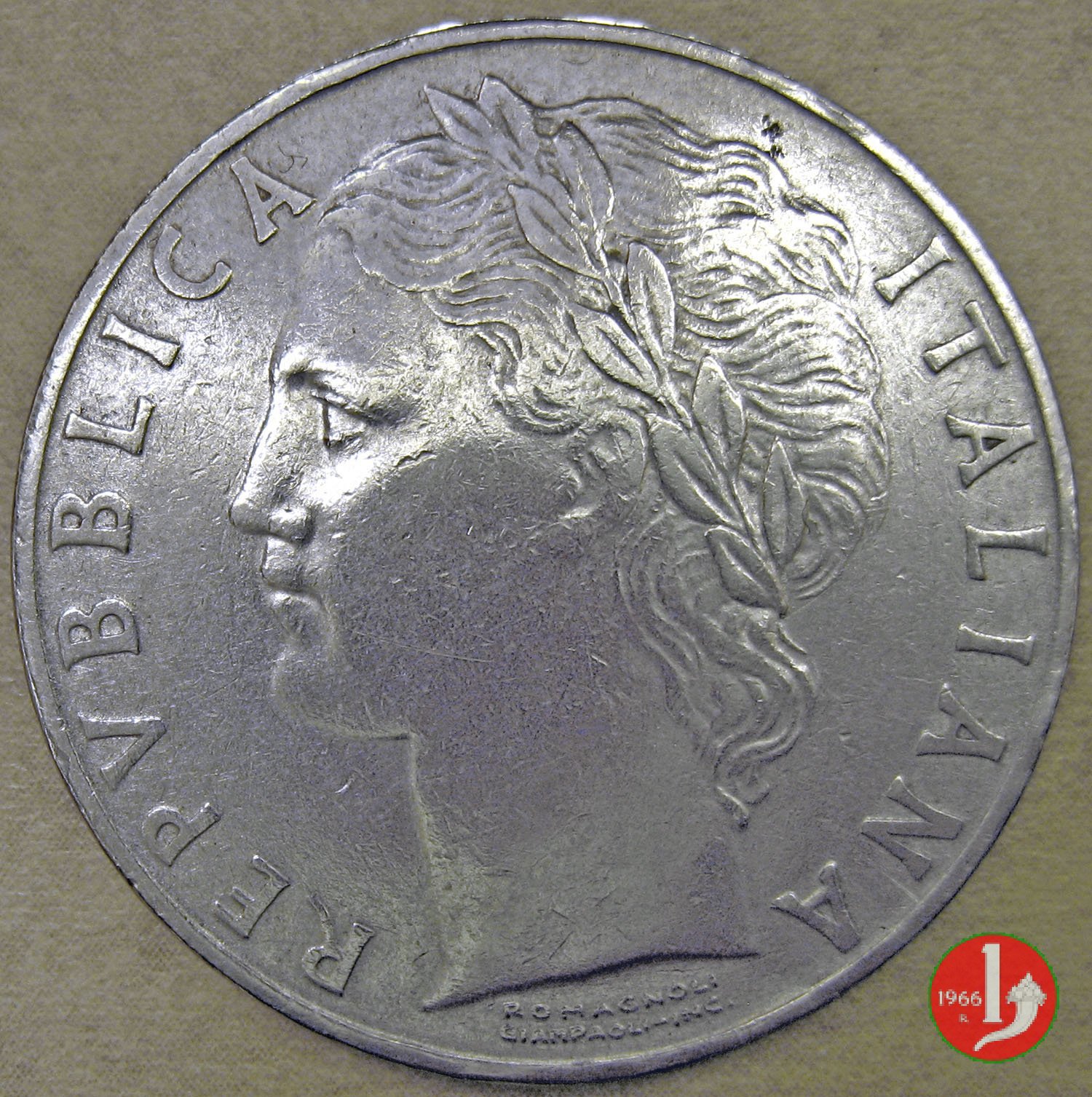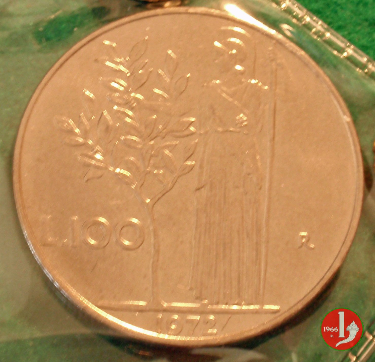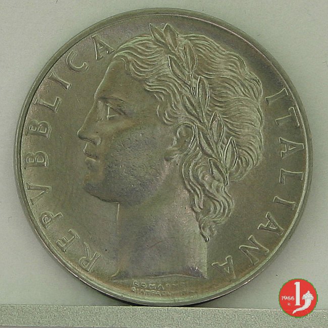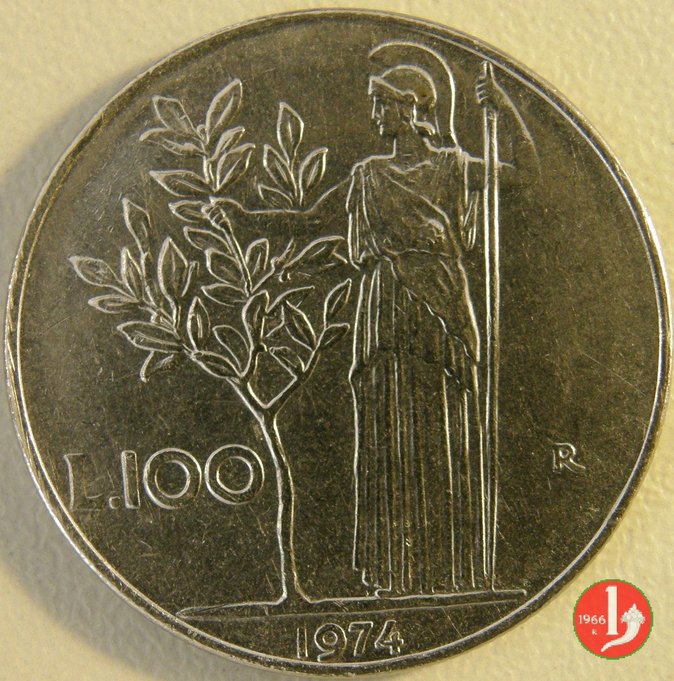 Testa di donna volta a sinistra con il capo cinto da una corona di alloro. Intorno REPVBBLICA ITALIANA. Sotto l'indicazione degli autori (ROMAGNOLI GIAMPAOLI INC •) su due righe. Minerva che protende la destra verso un albero di alloro e regge con la sinistra una lancia. A destra segno di zecca (R), a sinistra indicazione del valore (L. 100). In esergo il millesimo.
