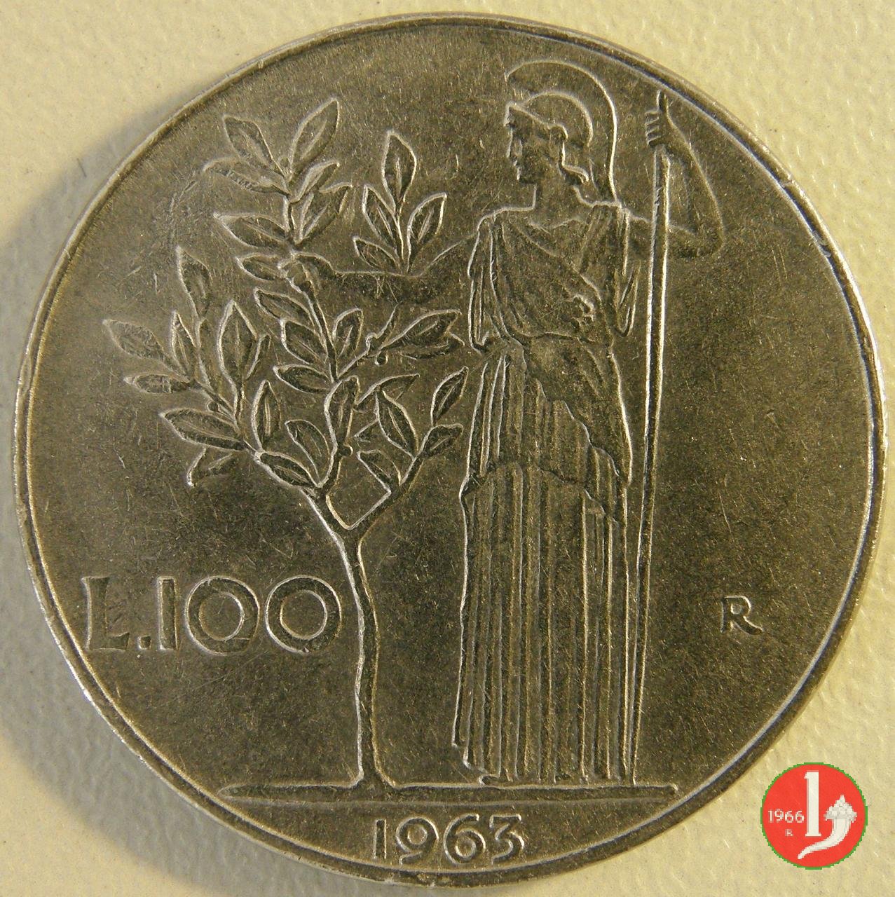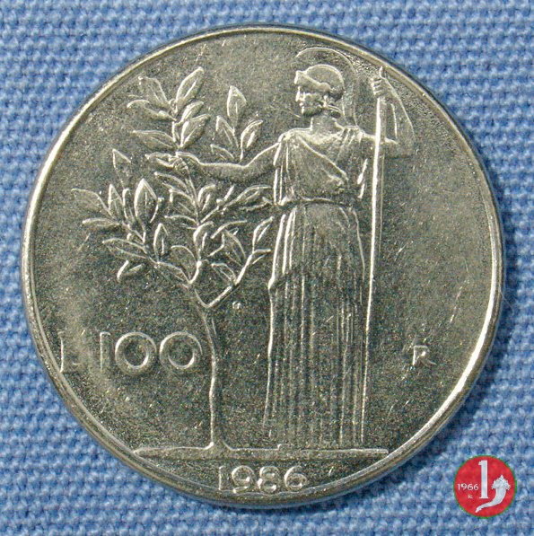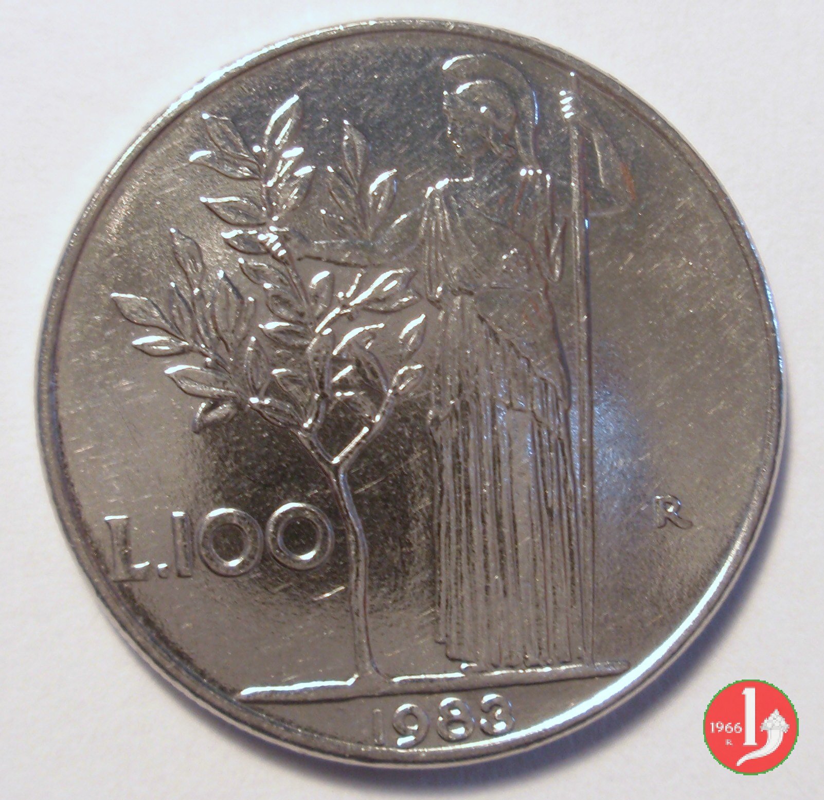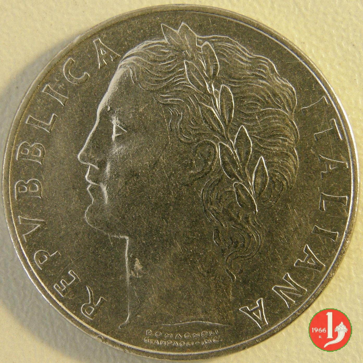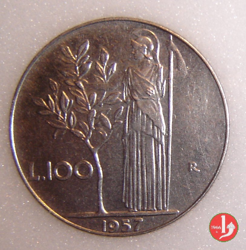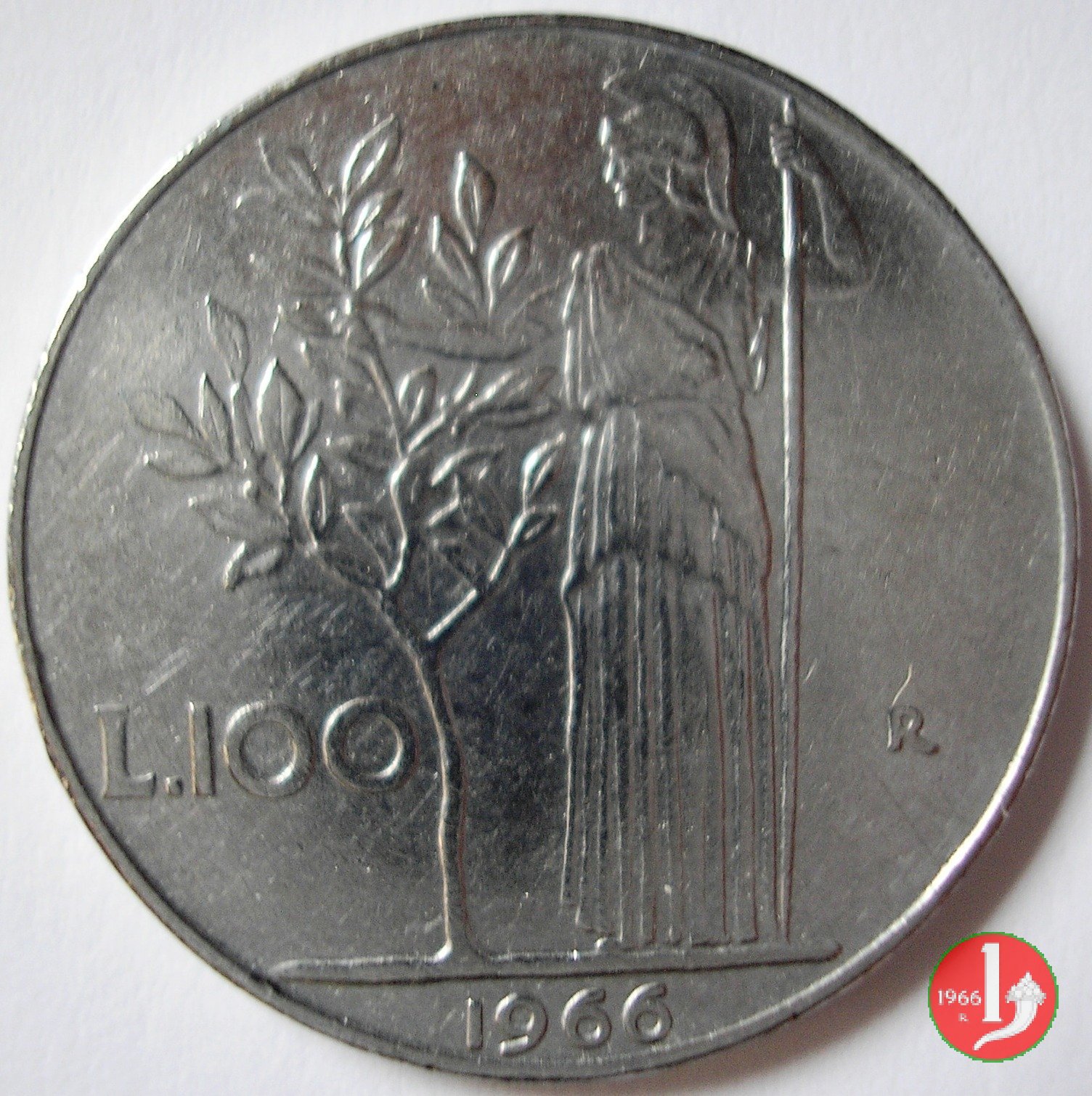 Testa di donna volta a sinistra con il capo cinto da una corona di alloro. Intorno REPVBBLICA ITALIANA. Sotto l'indicazione degli autori (ROMAGNOLI GIAMPAOLI INC •) su due righe. Minerva che protende la destra verso un albero di alloro e regge con la sinistra una lancia. A destra segno di zecca (R), a sinistra indicazione del valore (L. 100). In esergo il millesimo.