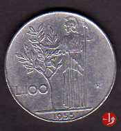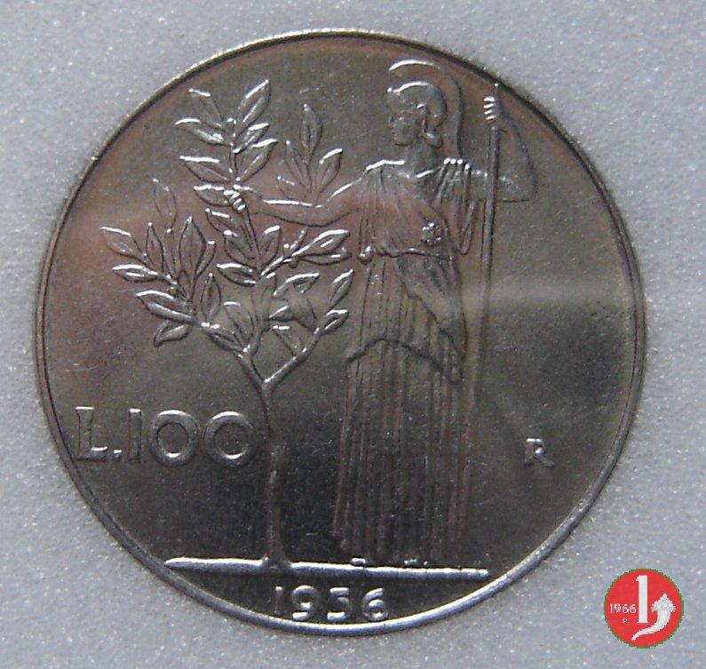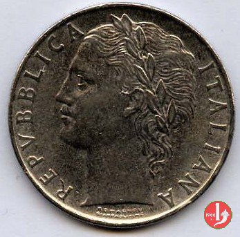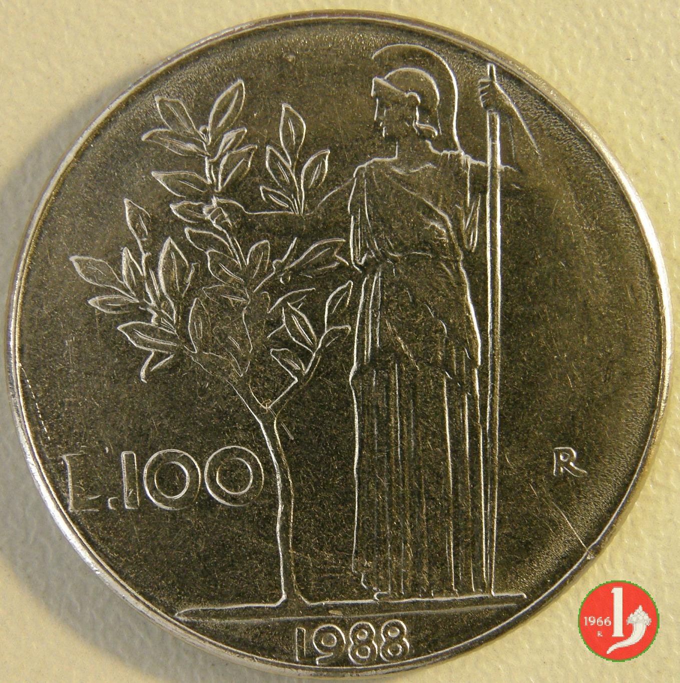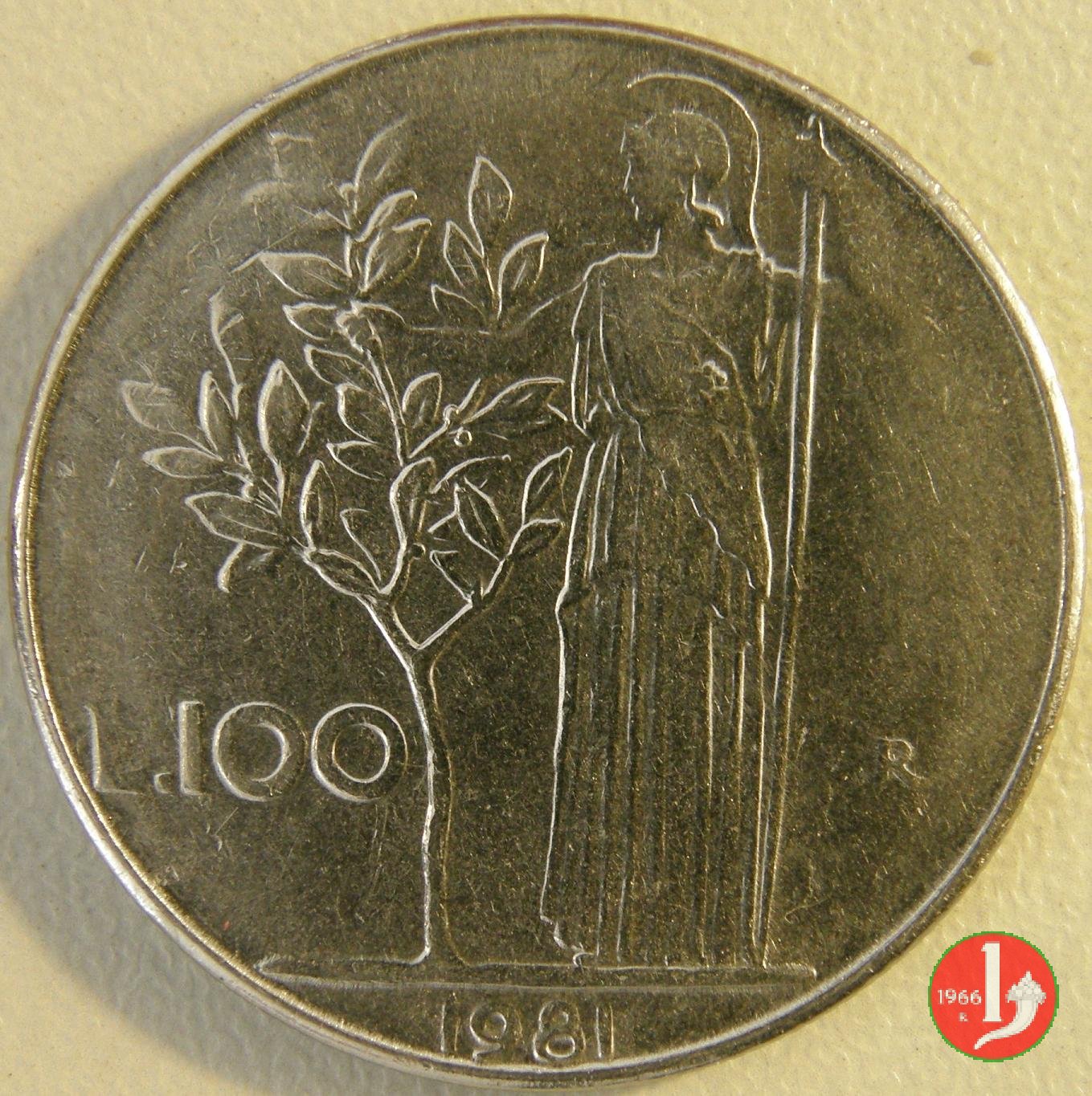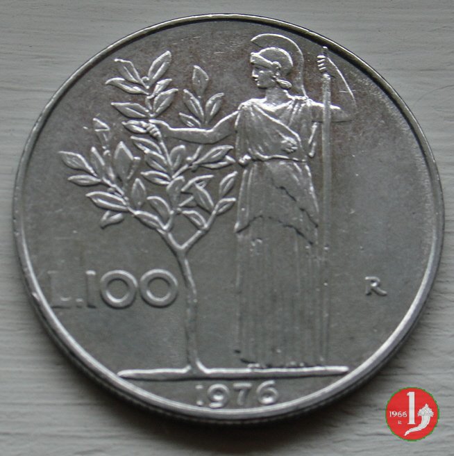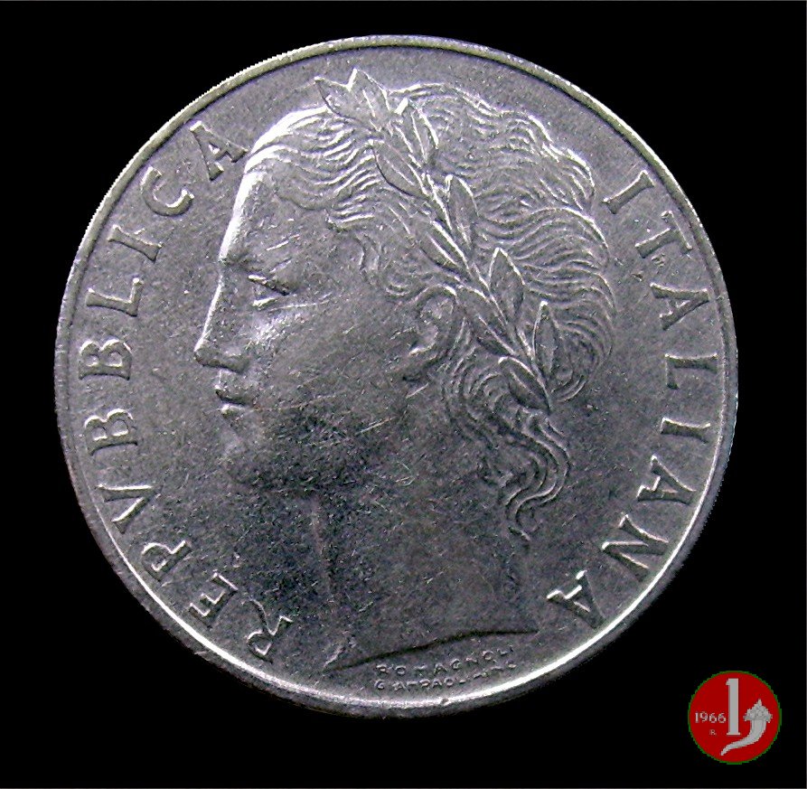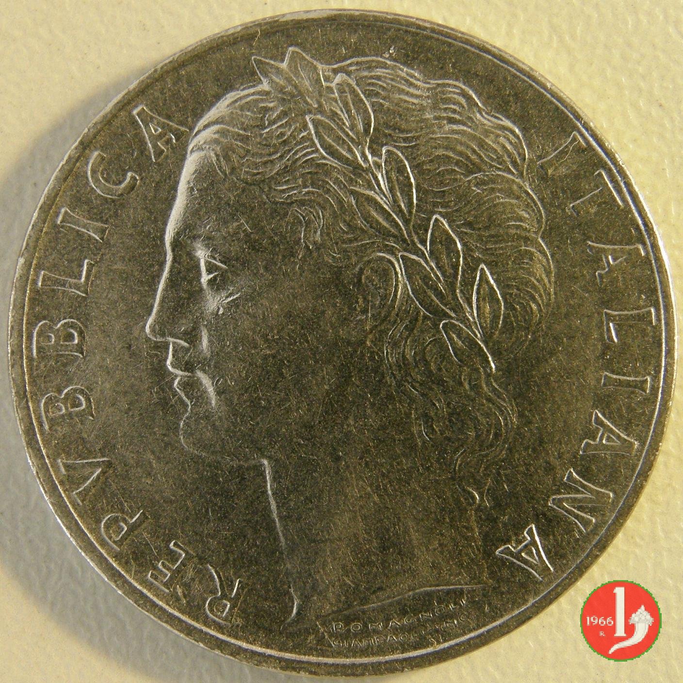 Testa di donna volta a sinistra con il capo cinto da una corona di alloro. Intorno REPVBBLICA ITALIANA. Sotto l'indicazione degli autori (ROMAGNOLI GIAMPAOLI INC •) su due righe. Minerva che protende la destra verso un albero di alloro e regge con la sinistra una lancia. A destra segno di zecca (R), a sinistra indicazione del valore (L. 100). In esergo il millesimo.