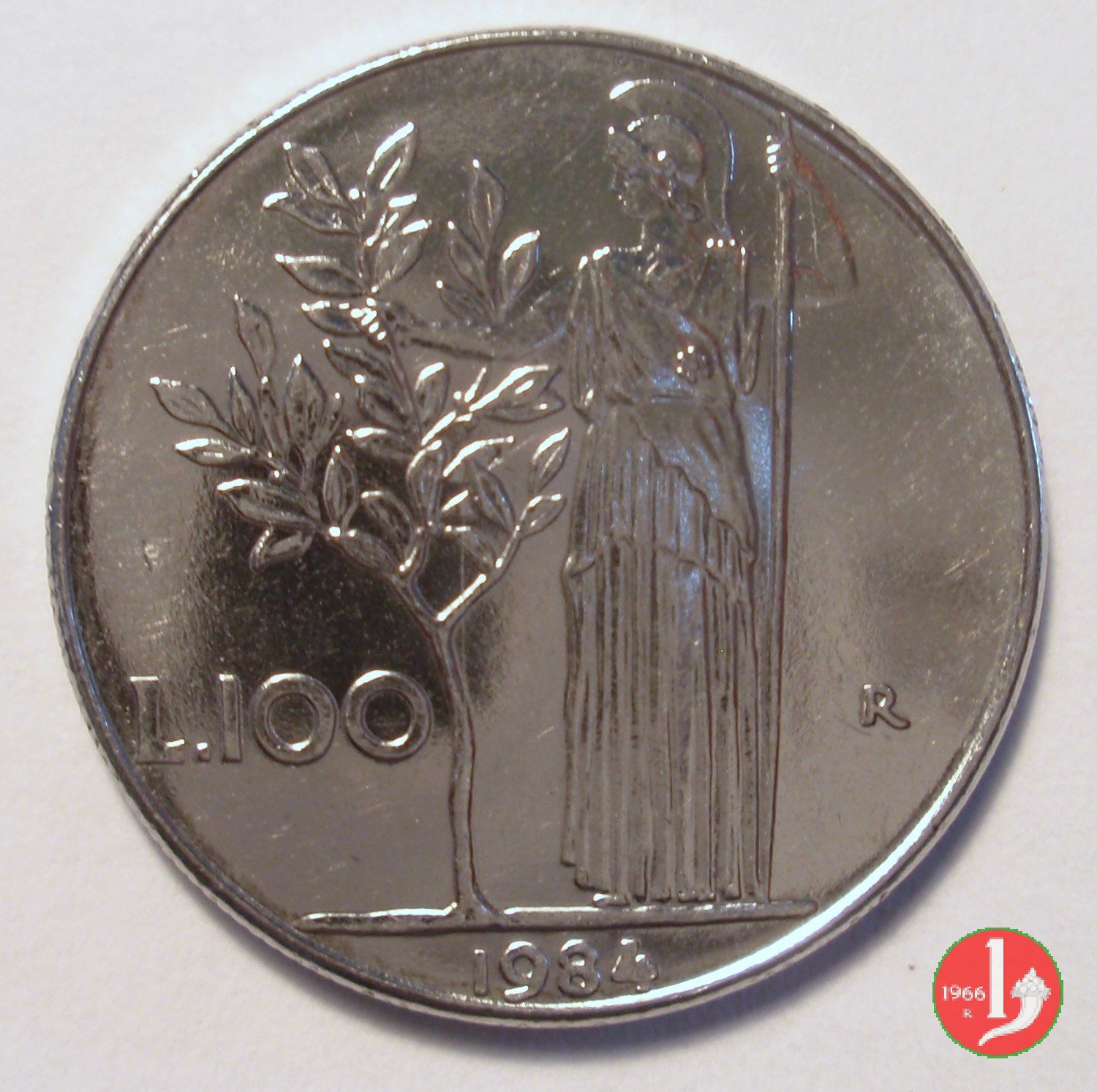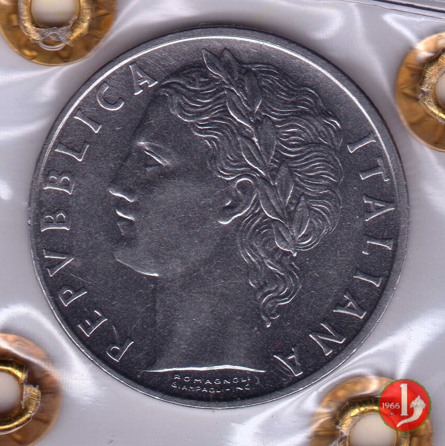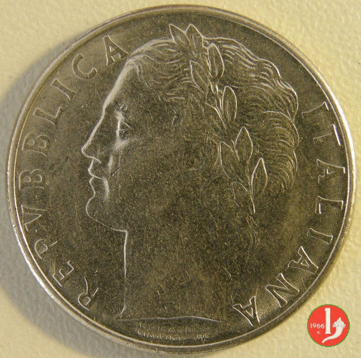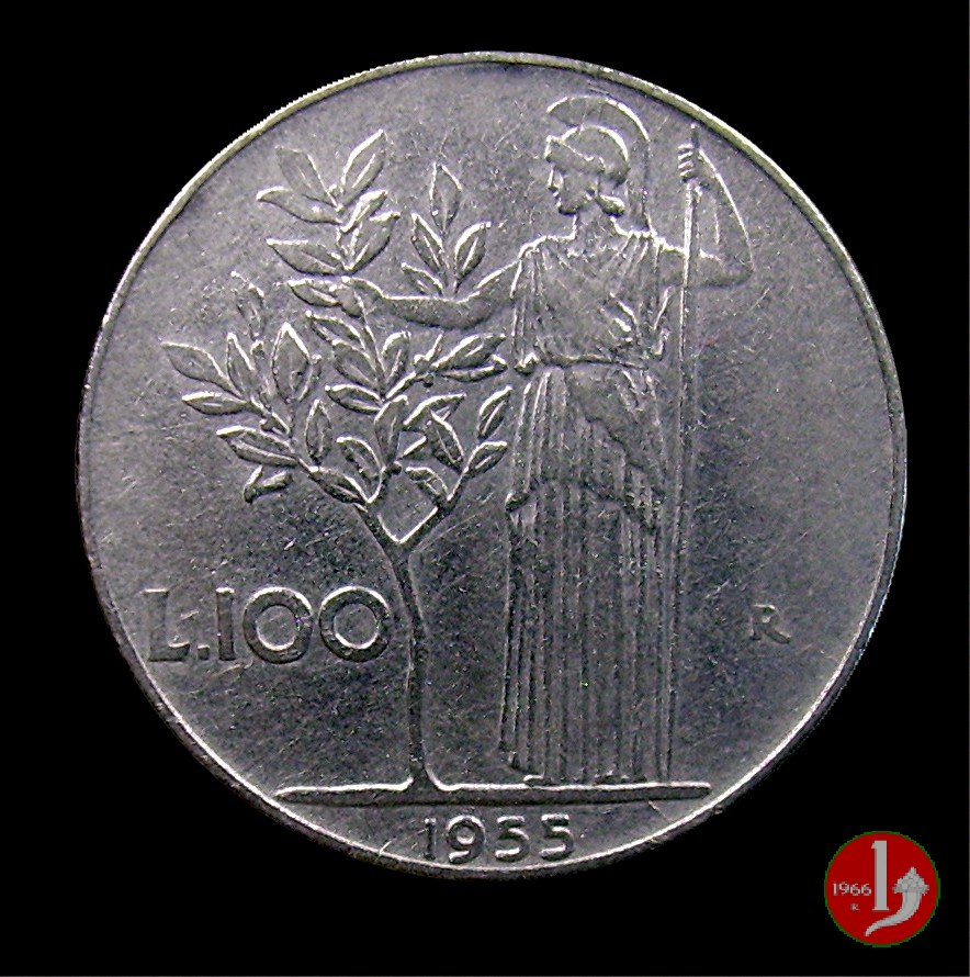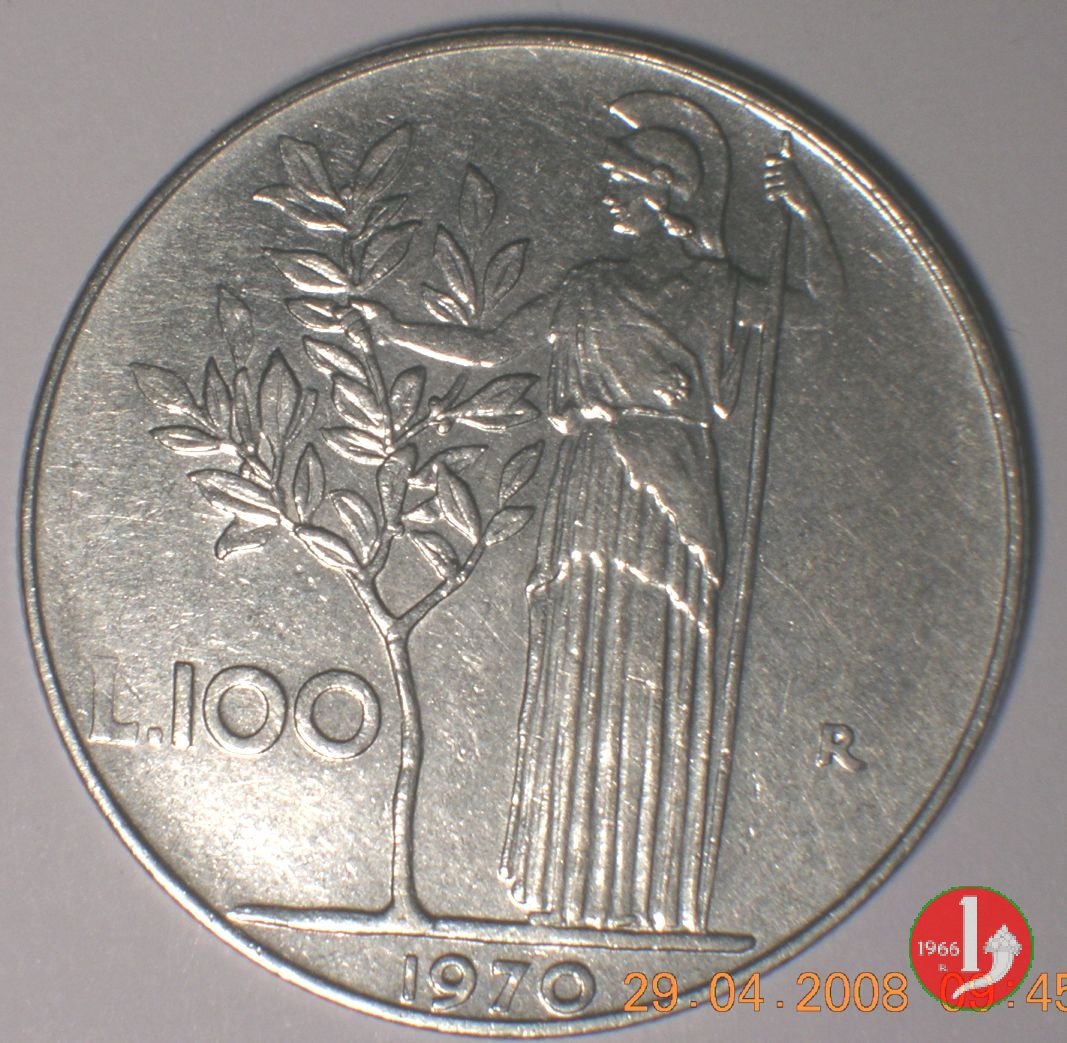 Testa di donna volta a sinistra con il capo cinto da una corona di alloro. Intorno REPVBBLICA ITALIANA. Sotto l'indicazione degli autori (ROMAGNOLI GIAMPAOLI INC •) su due righe. Minerva che protende la destra verso un albero di alloro e regge con la sinistra una lancia. A destra segno di zecca (R), a sinistra indicazione del valore (L. 100). In esergo il millesimo.