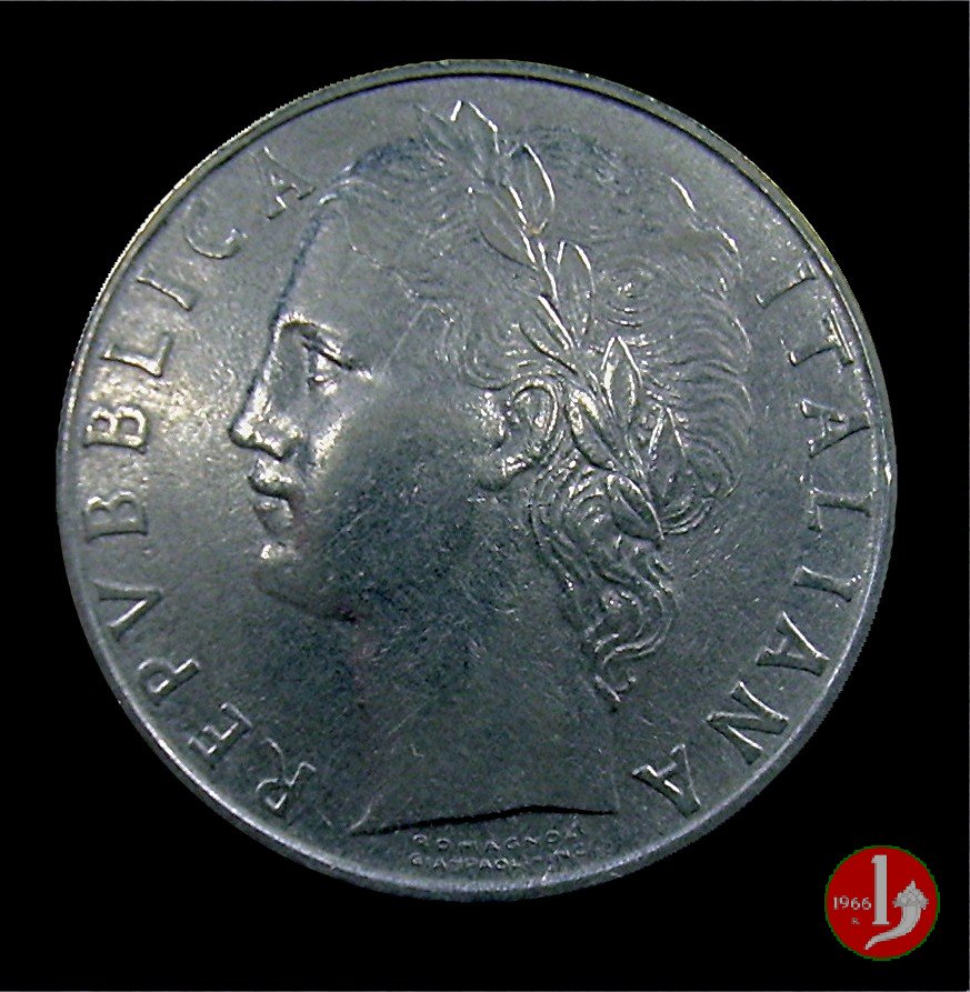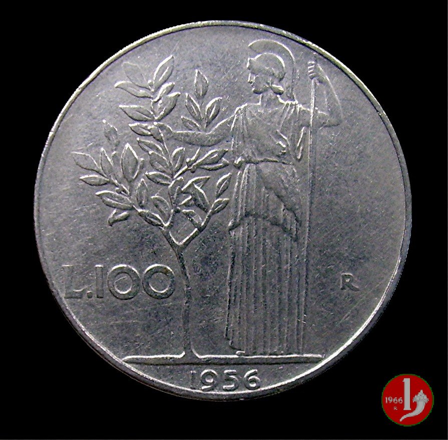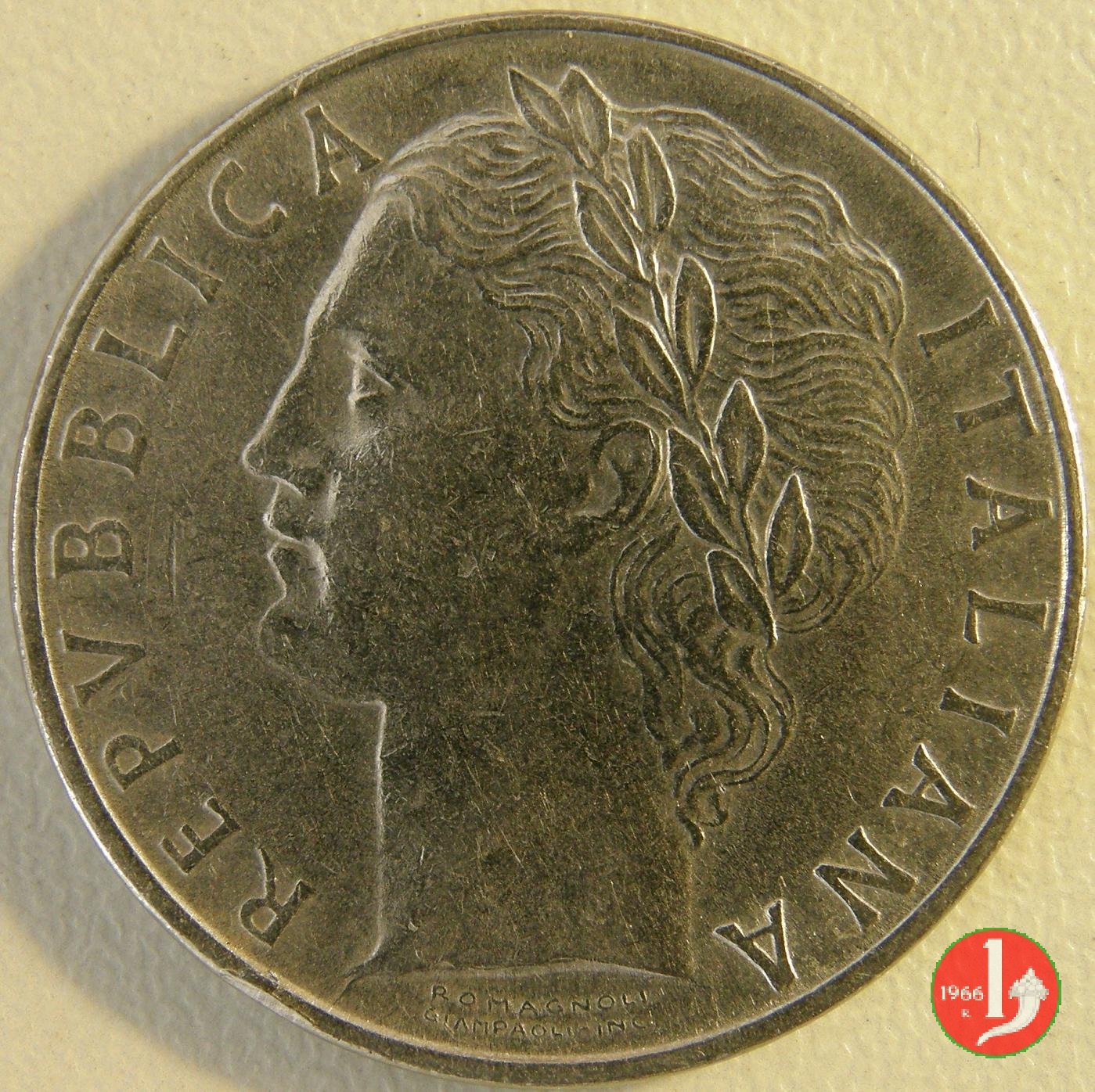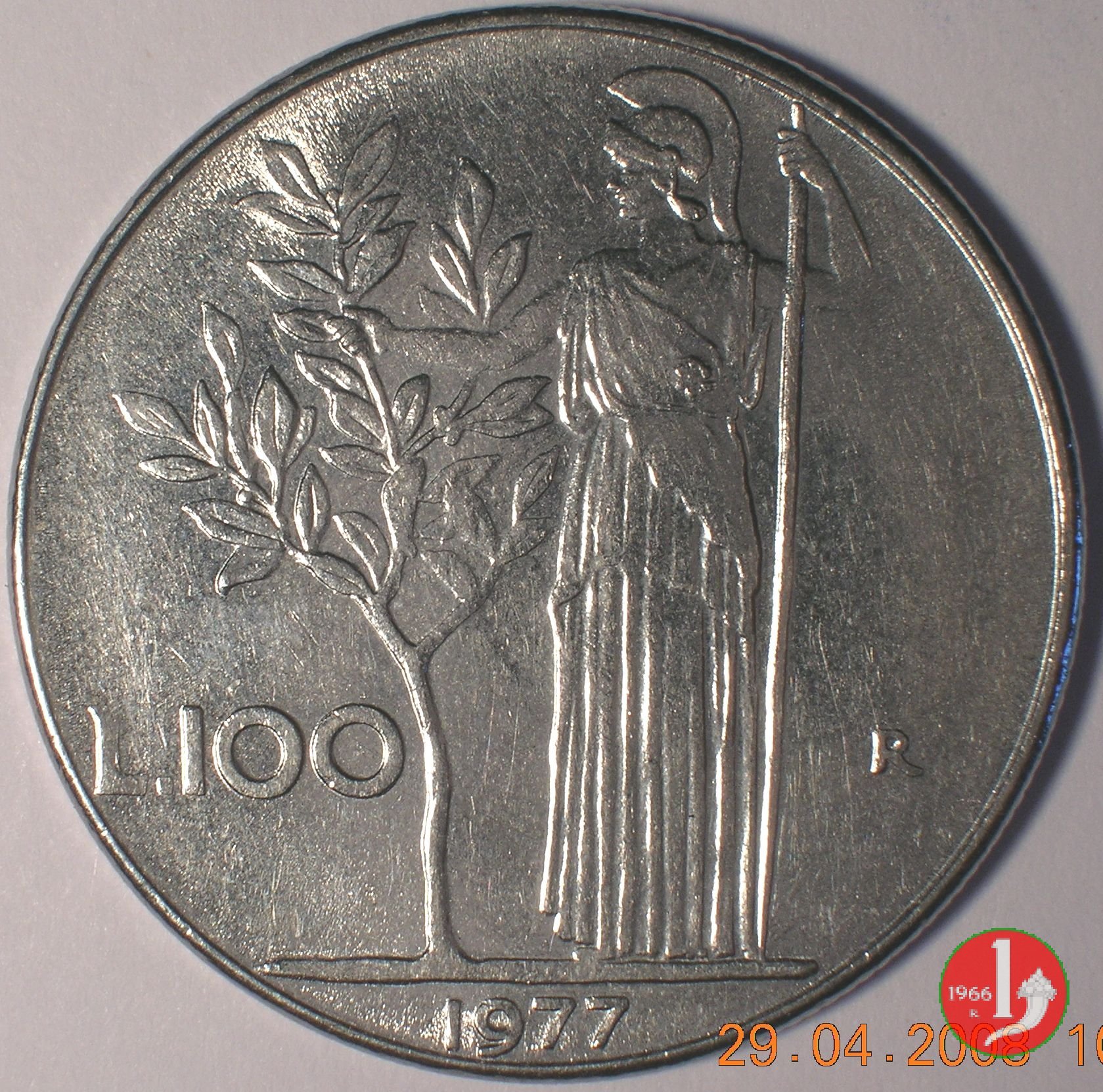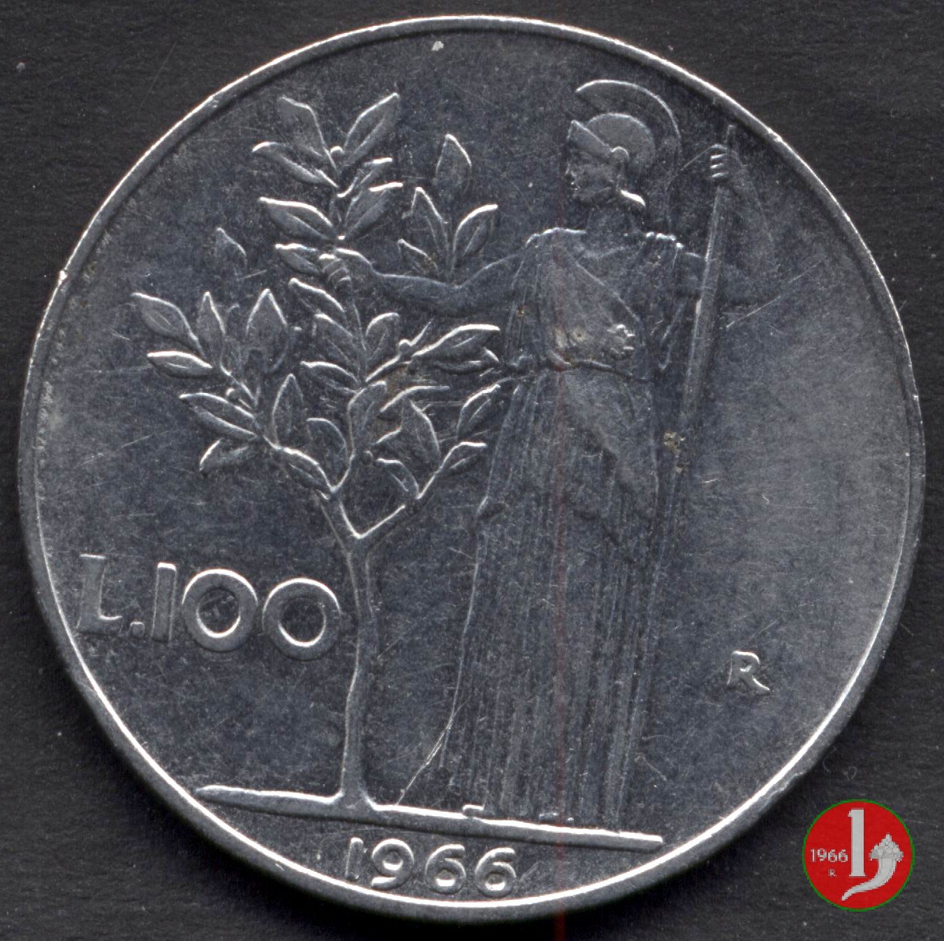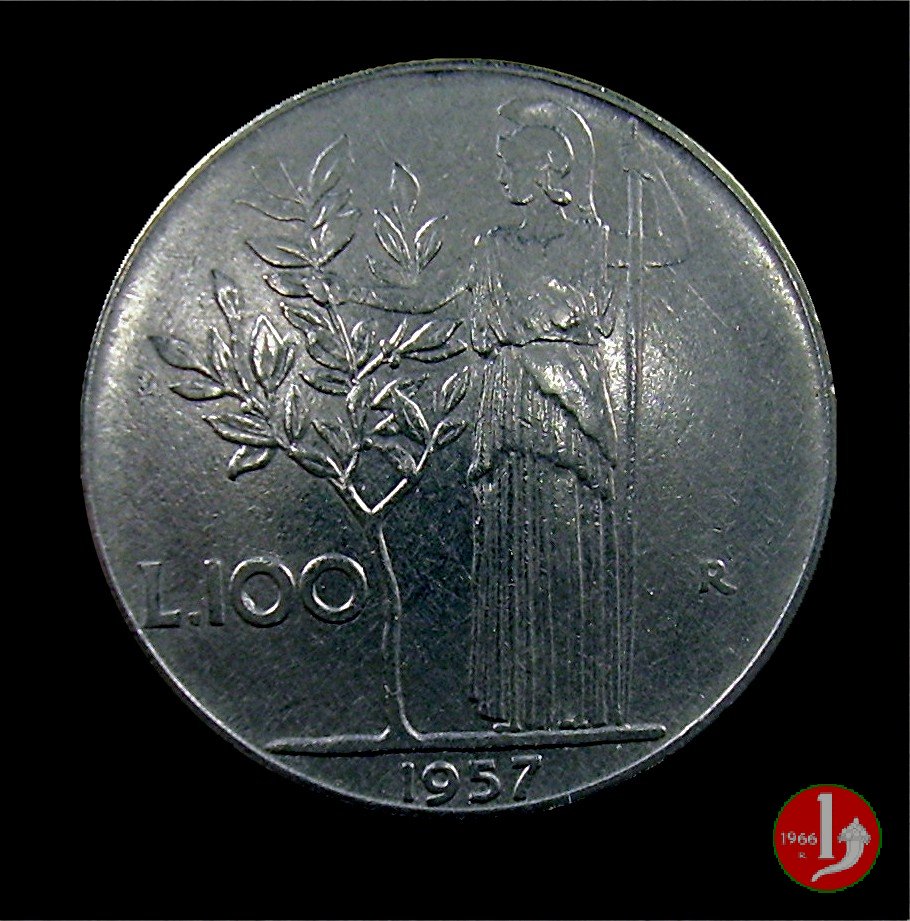 Testa di donna volta a sinistra con il capo cinto da una corona di alloro. Intorno REPVBBLICA ITALIANA. Sotto l'indicazione degli autori (ROMAGNOLI GIAMPAOLI INC •) su due righe. Minerva che protende la destra verso un albero di alloro e regge con la sinistra una lancia. A destra segno di zecca (R), a sinistra indicazione del valore (L. 100). In esergo il millesimo.