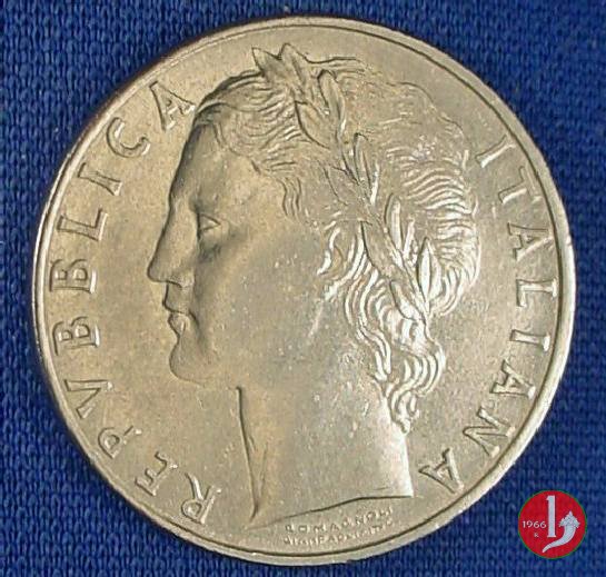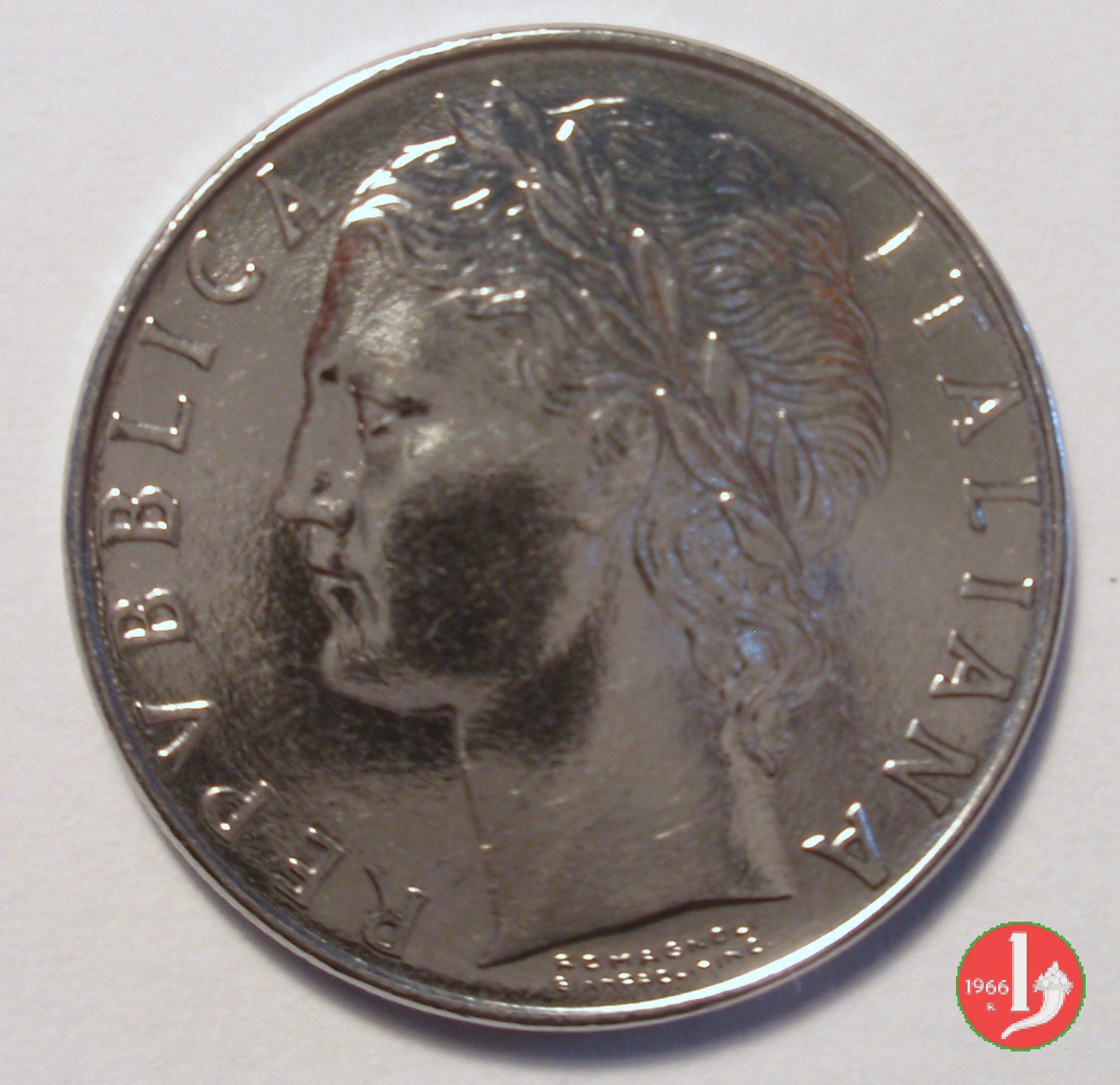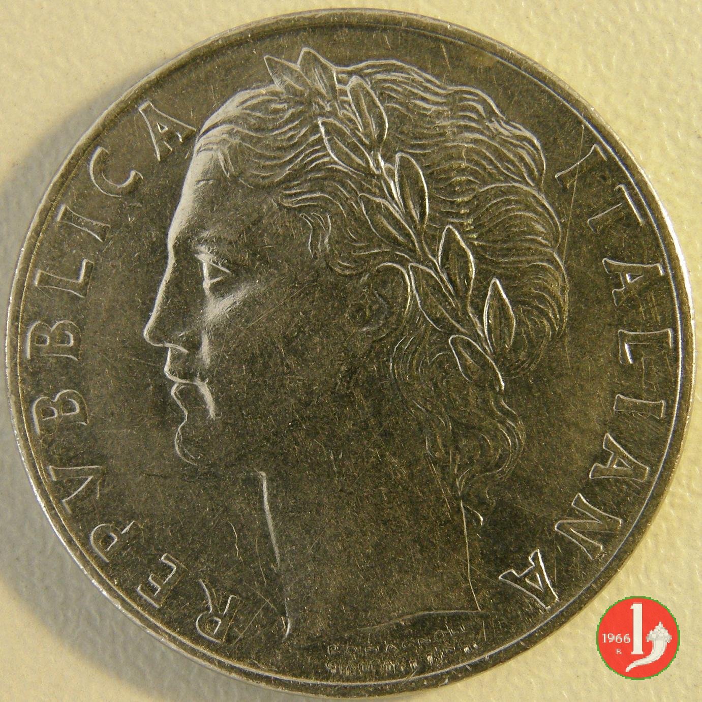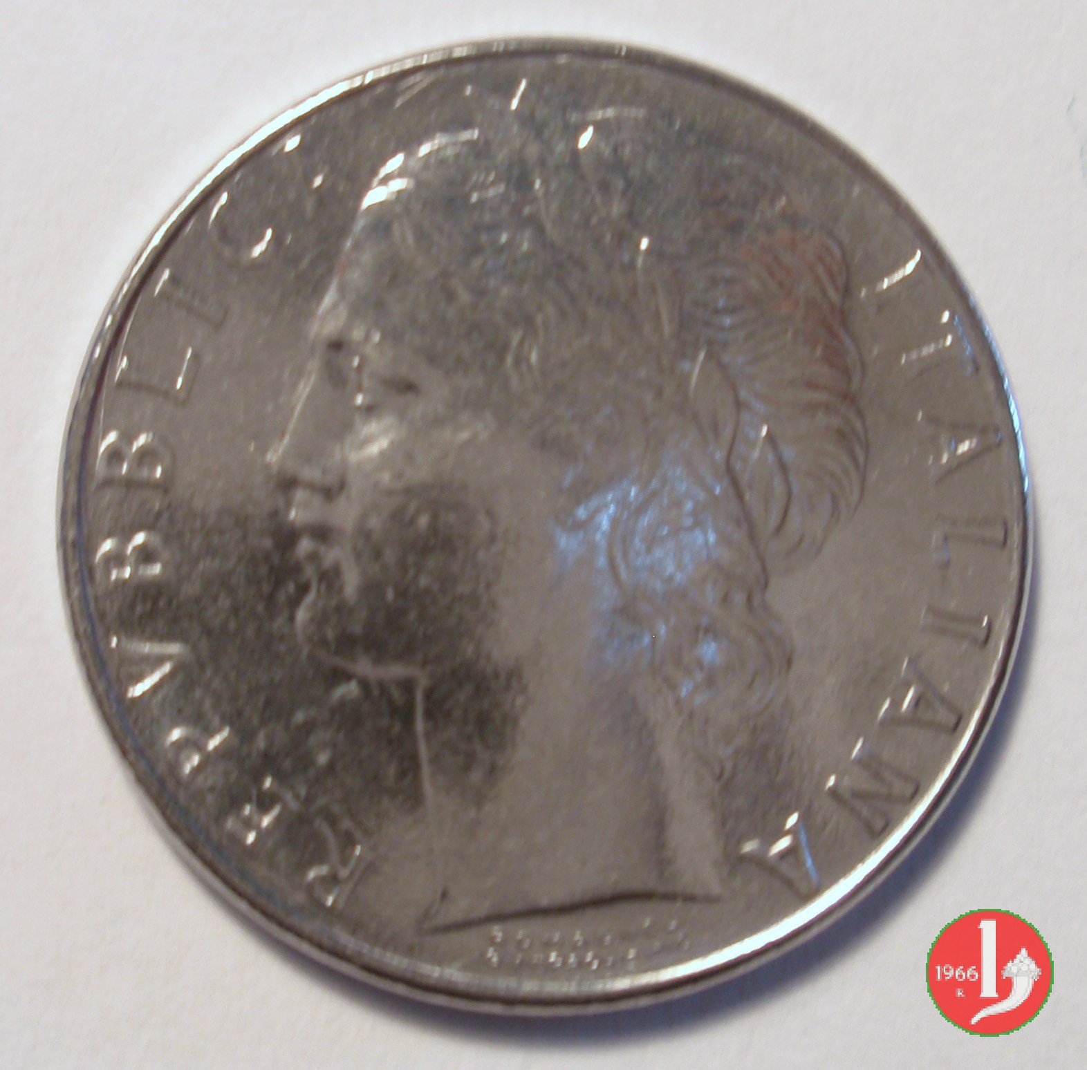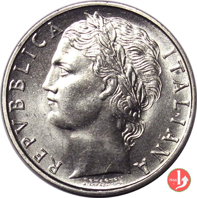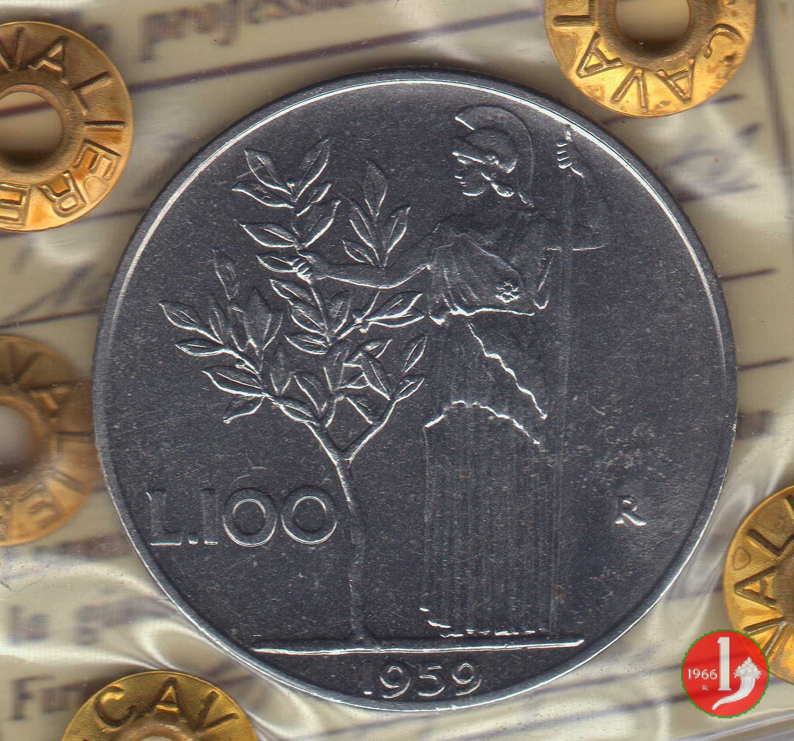 Testa di donna volta a sinistra con il capo cinto da una corona di alloro. Intorno REPVBBLICA ITALIANA. Sotto l'indicazione degli autori (ROMAGNOLI GIAMPAOLI INC •) su due righe. Minerva che protende la destra verso un albero di alloro e regge con la sinistra una lancia. A destra segno di zecca (R), a sinistra indicazione del valore (L. 100). In esergo il millesimo.