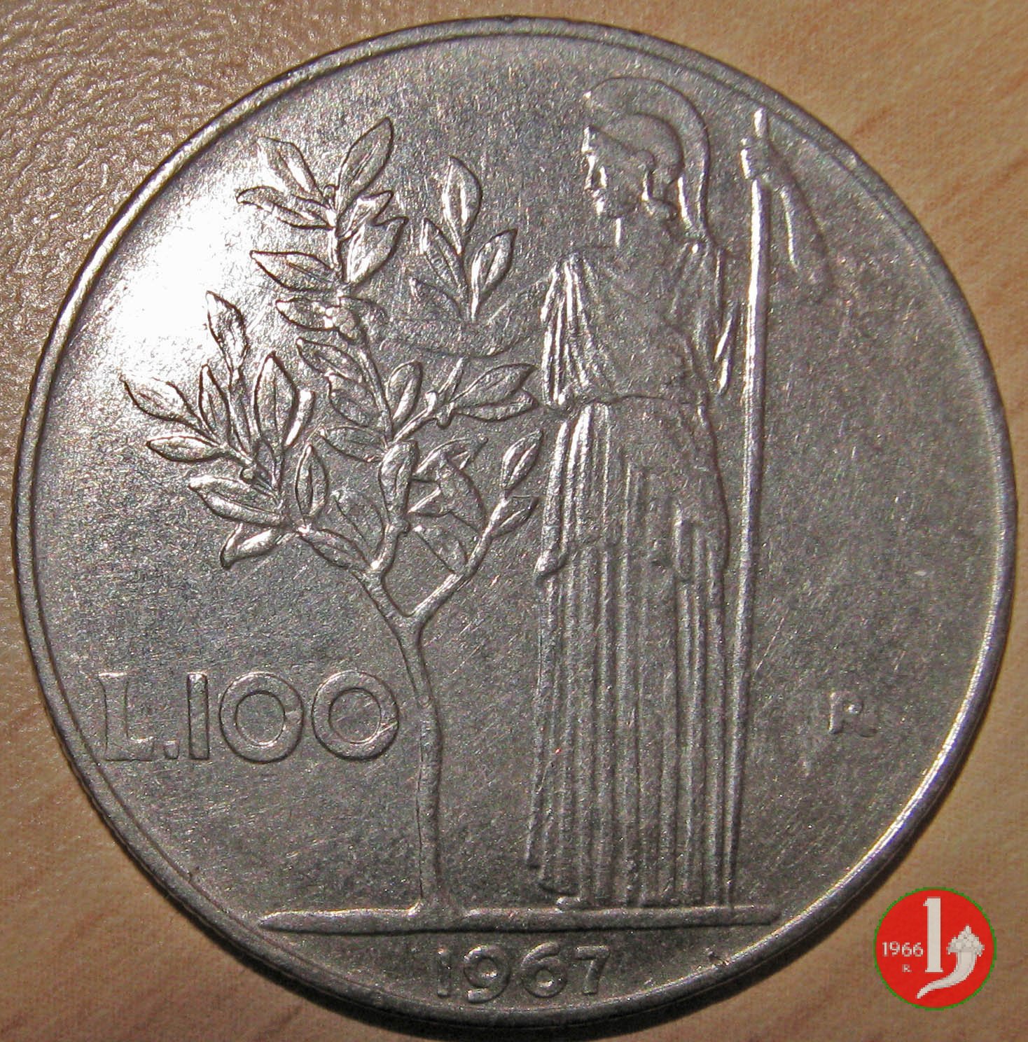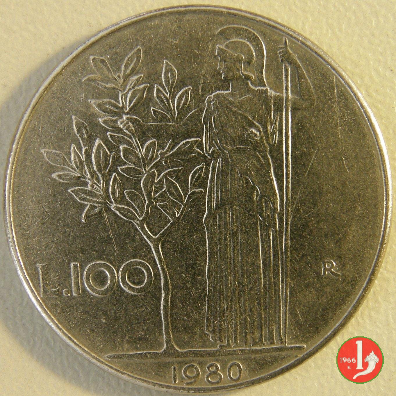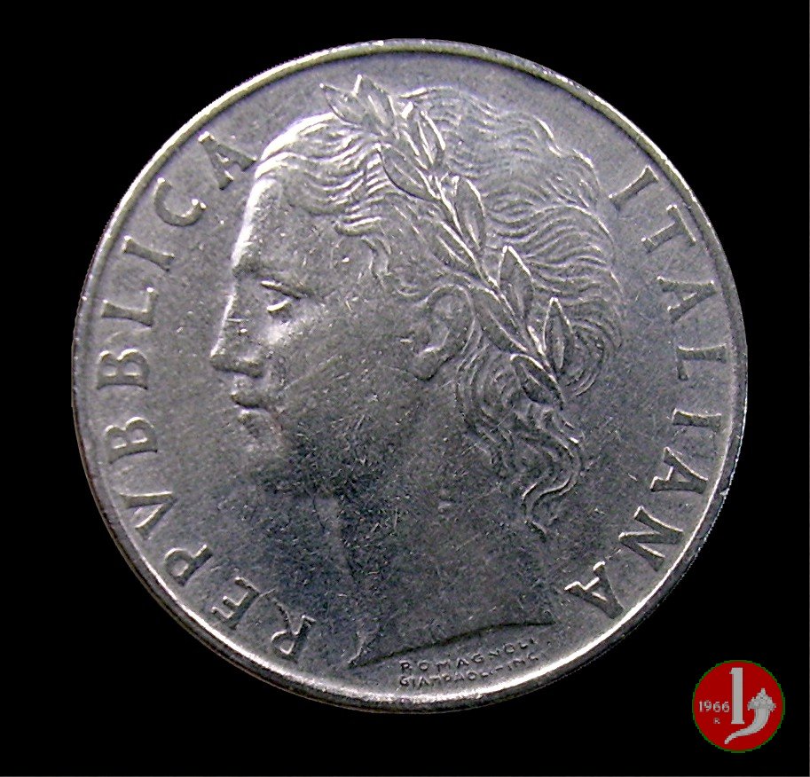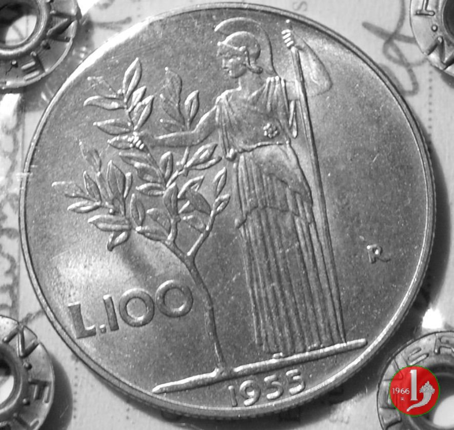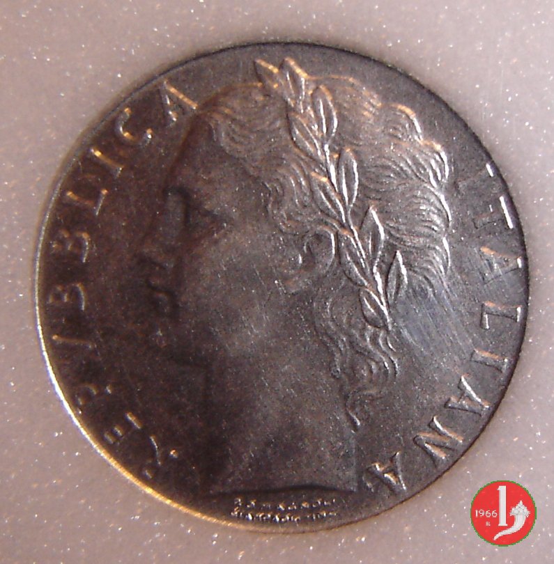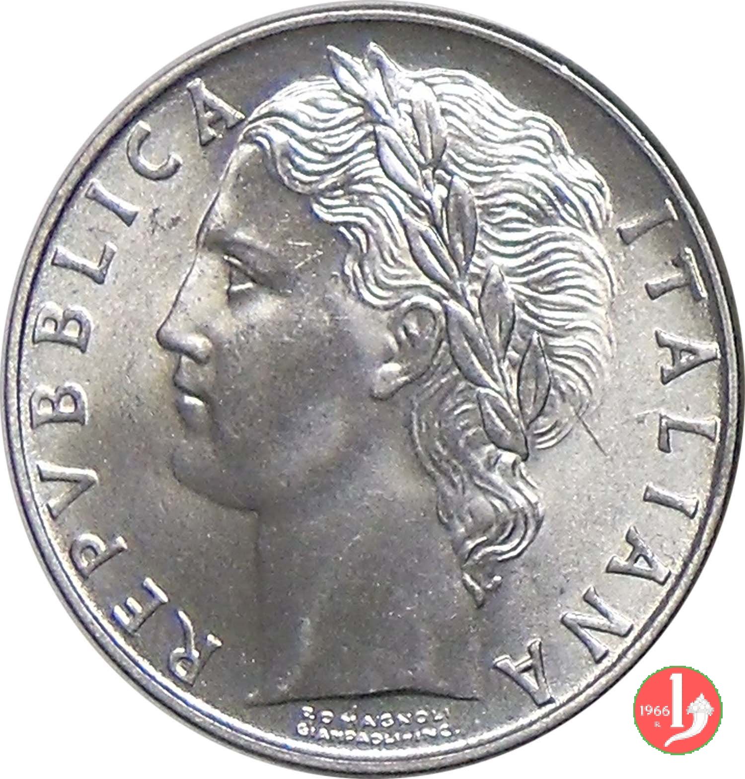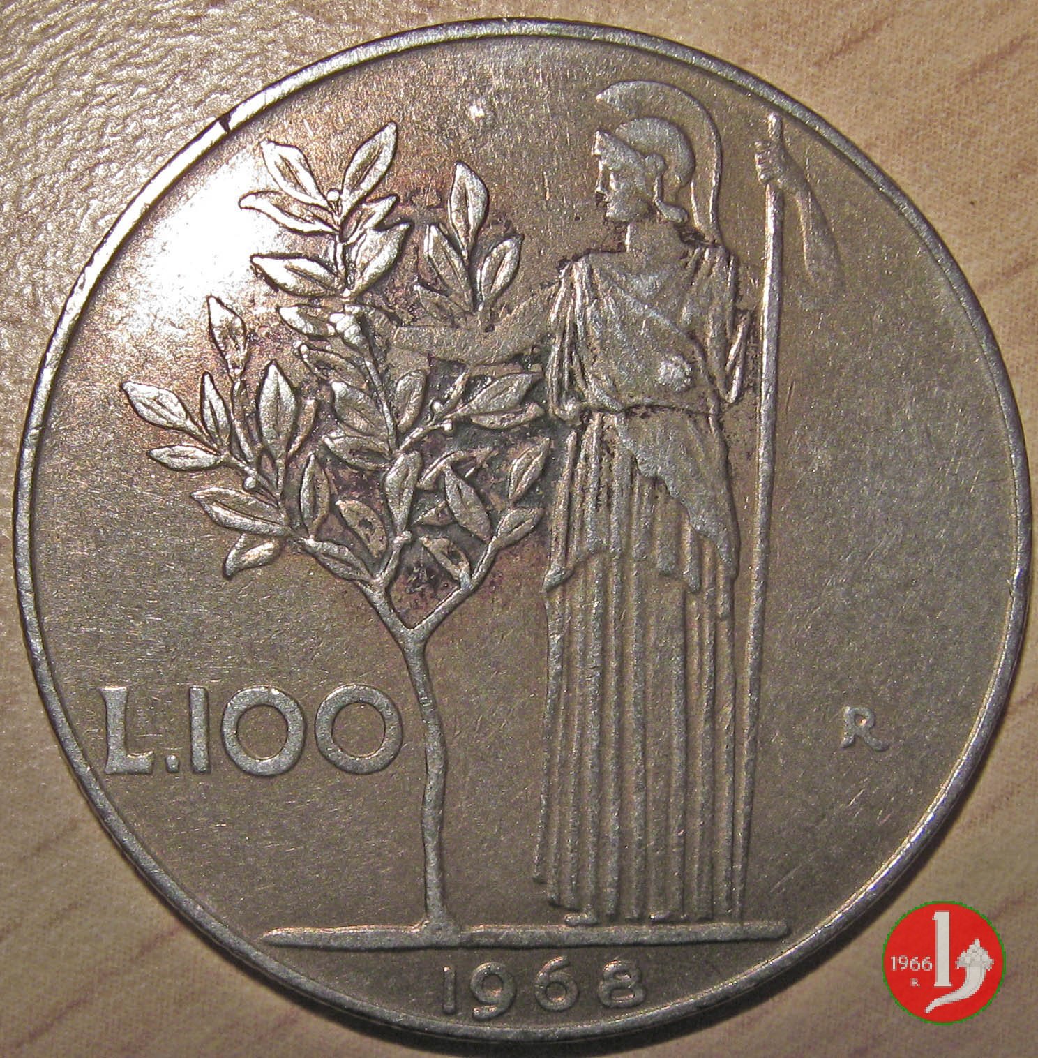 Testa di donna volta a sinistra con il capo cinto da una corona di alloro. Intorno REPVBBLICA ITALIANA. Sotto l'indicazione degli autori (ROMAGNOLI GIAMPAOLI INC •) su due righe. Minerva che protende la destra verso un albero di alloro e regge con la sinistra una lancia. A destra segno di zecca (R), a sinistra indicazione del valore (L. 100). In esergo il millesimo.