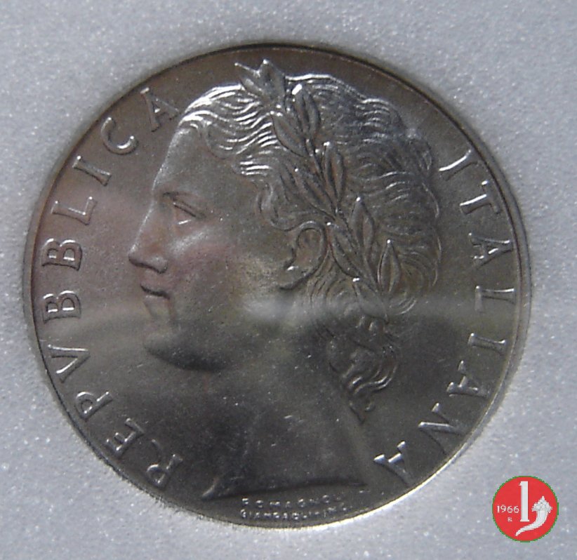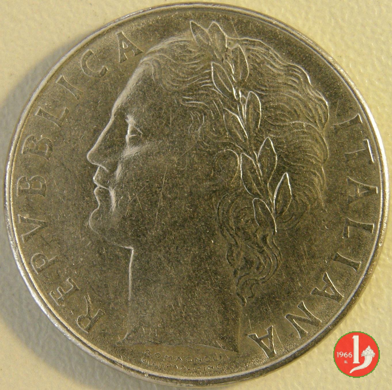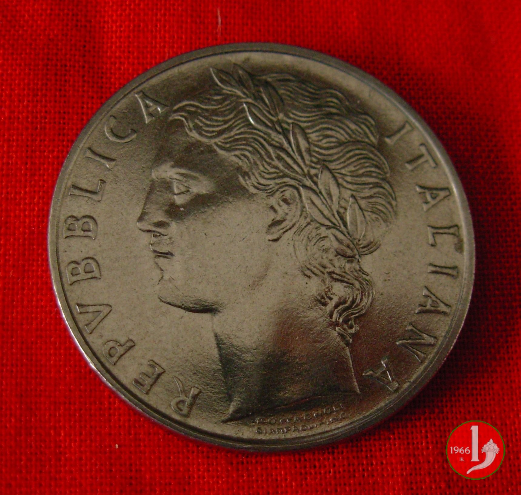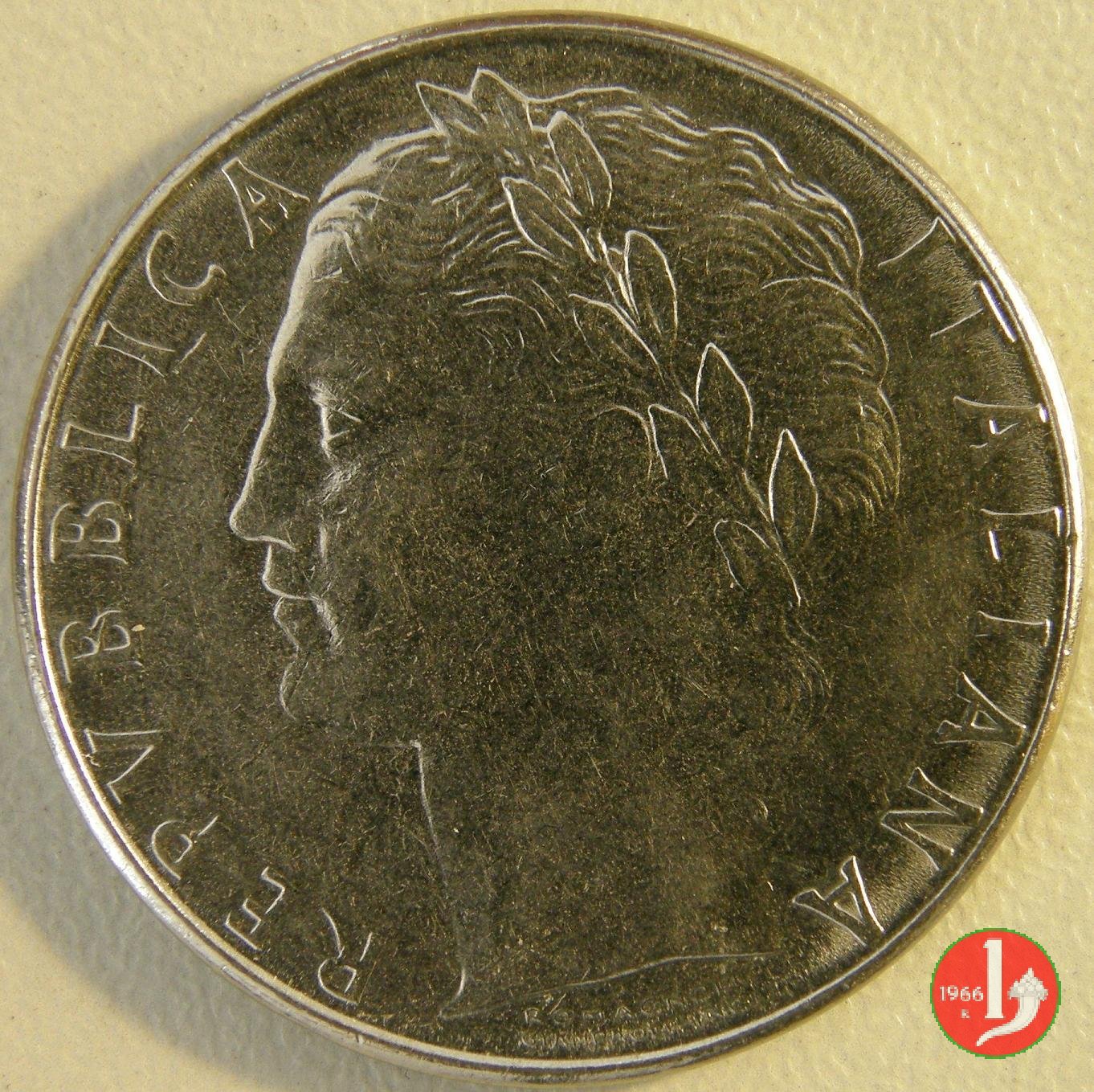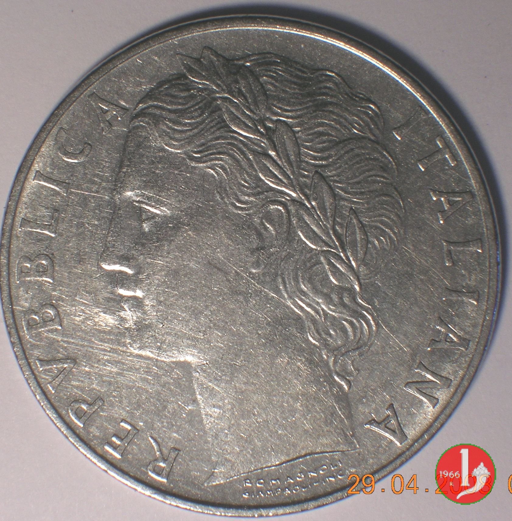 Testa di donna volta a sinistra con il capo cinto da una corona di alloro. Intorno REPVBBLICA ITALIANA. Sotto l'indicazione degli autori (ROMAGNOLI GIAMPAOLI INC •) su due righe. Minerva che protende la destra verso un albero di alloro e regge con la sinistra una lancia. A destra segno di zecca (R), a sinistra indicazione del valore (L. 100). In esergo il millesimo.