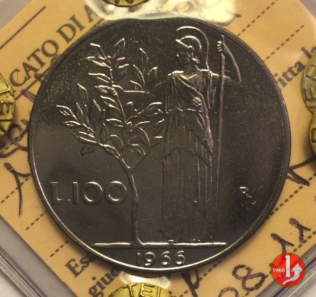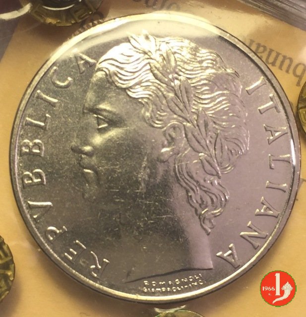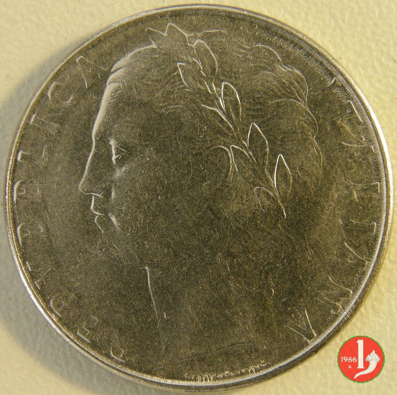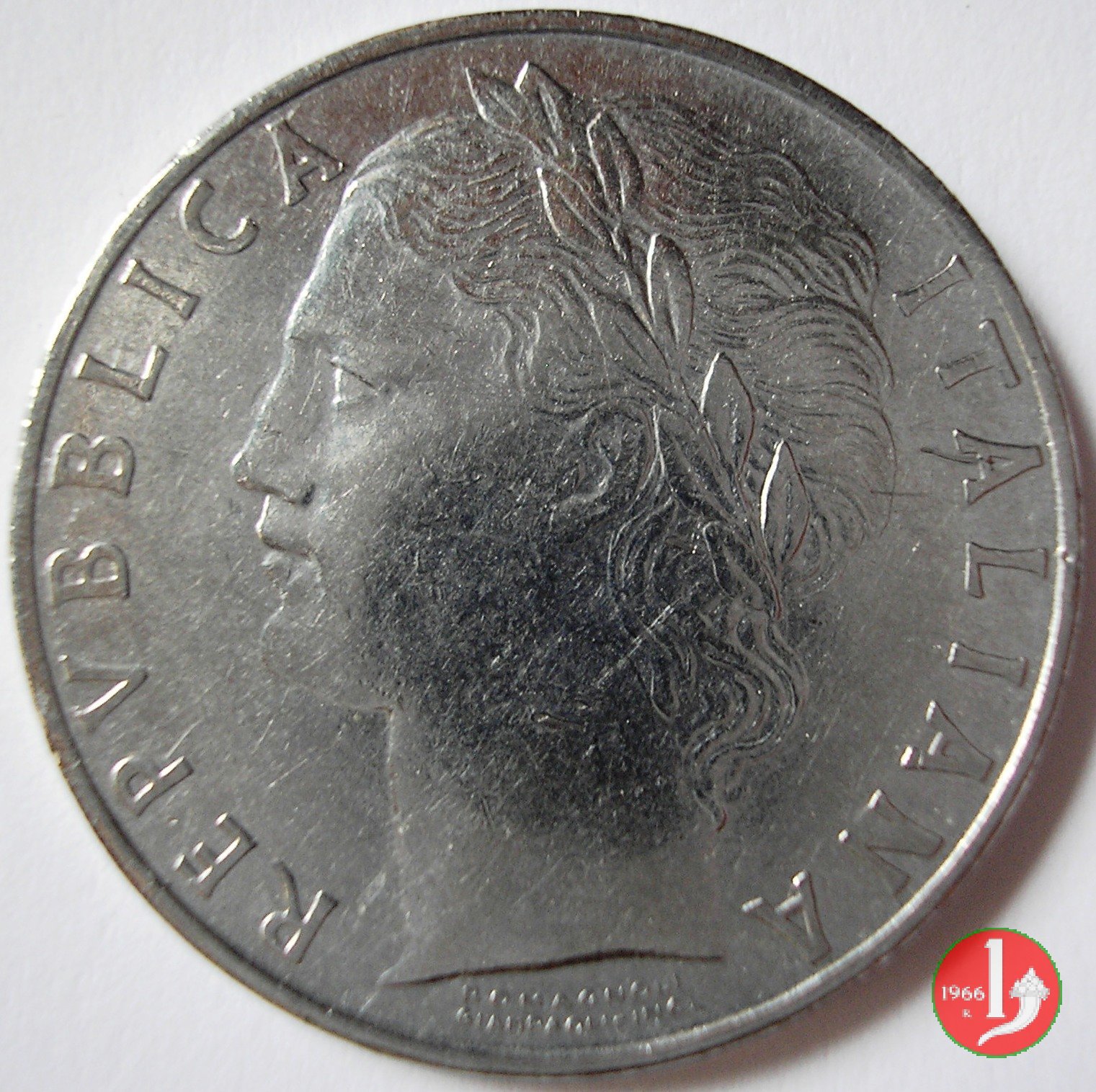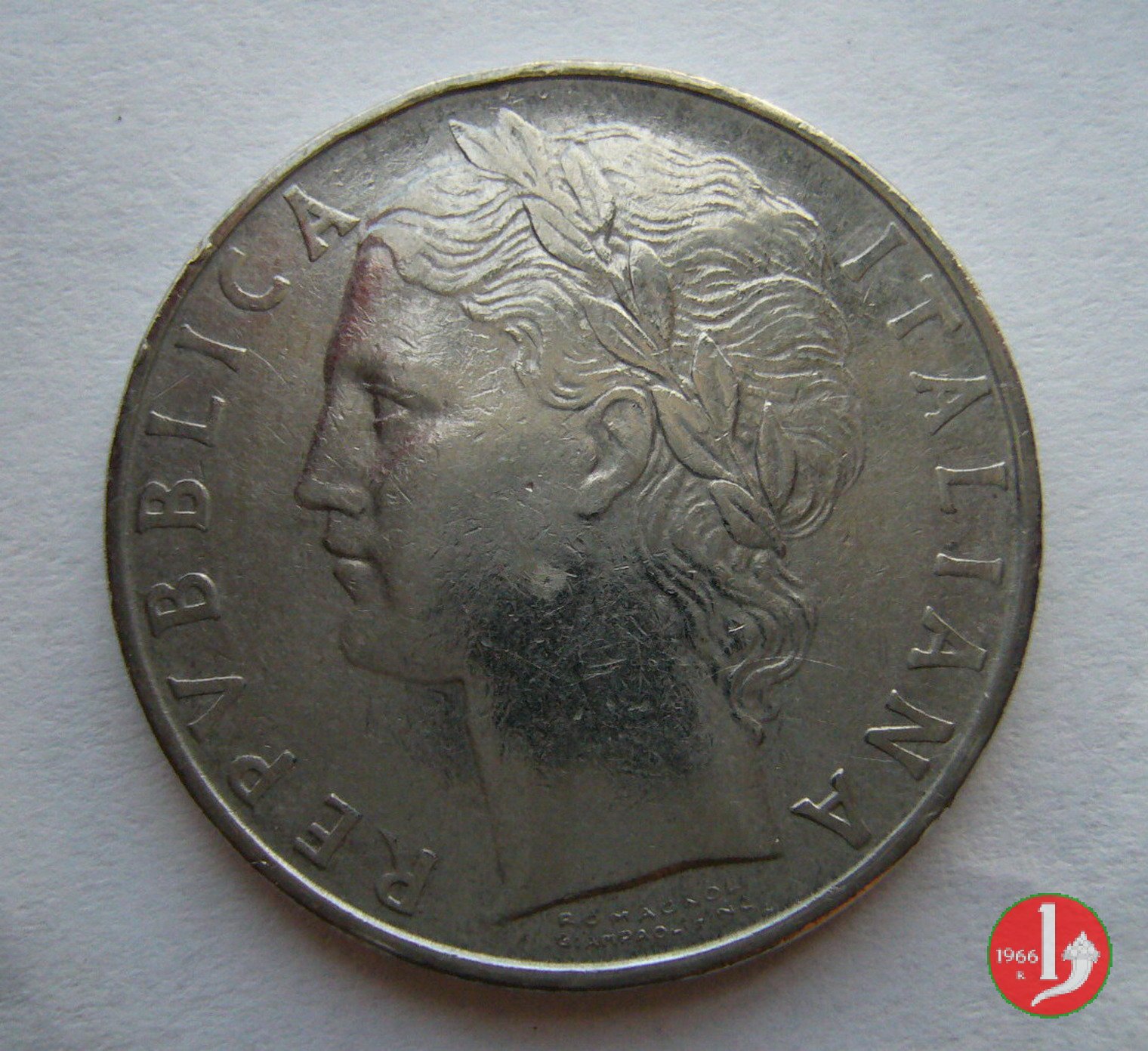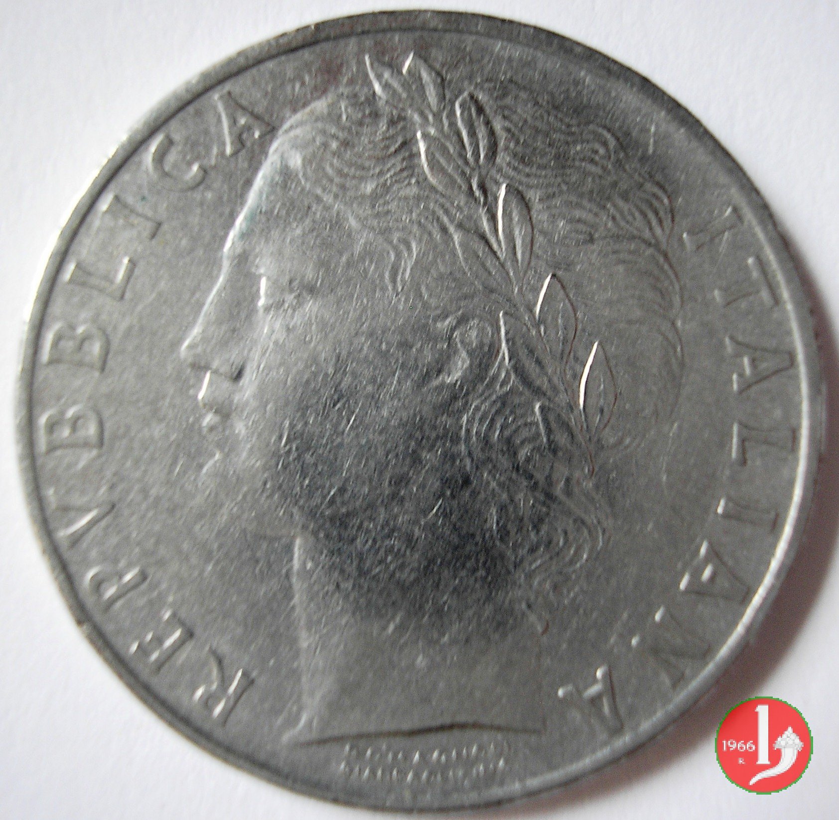 Testa di donna volta a sinistra con il capo cinto da una corona di alloro. Intorno REPVBBLICA ITALIANA. Sotto l'indicazione degli autori (ROMAGNOLI GIAMPAOLI INC •) su due righe. Minerva che protende la destra verso un albero di alloro e regge con la sinistra una lancia. A destra segno di zecca (R), a sinistra indicazione del valore (L. 100). In esergo il millesimo.