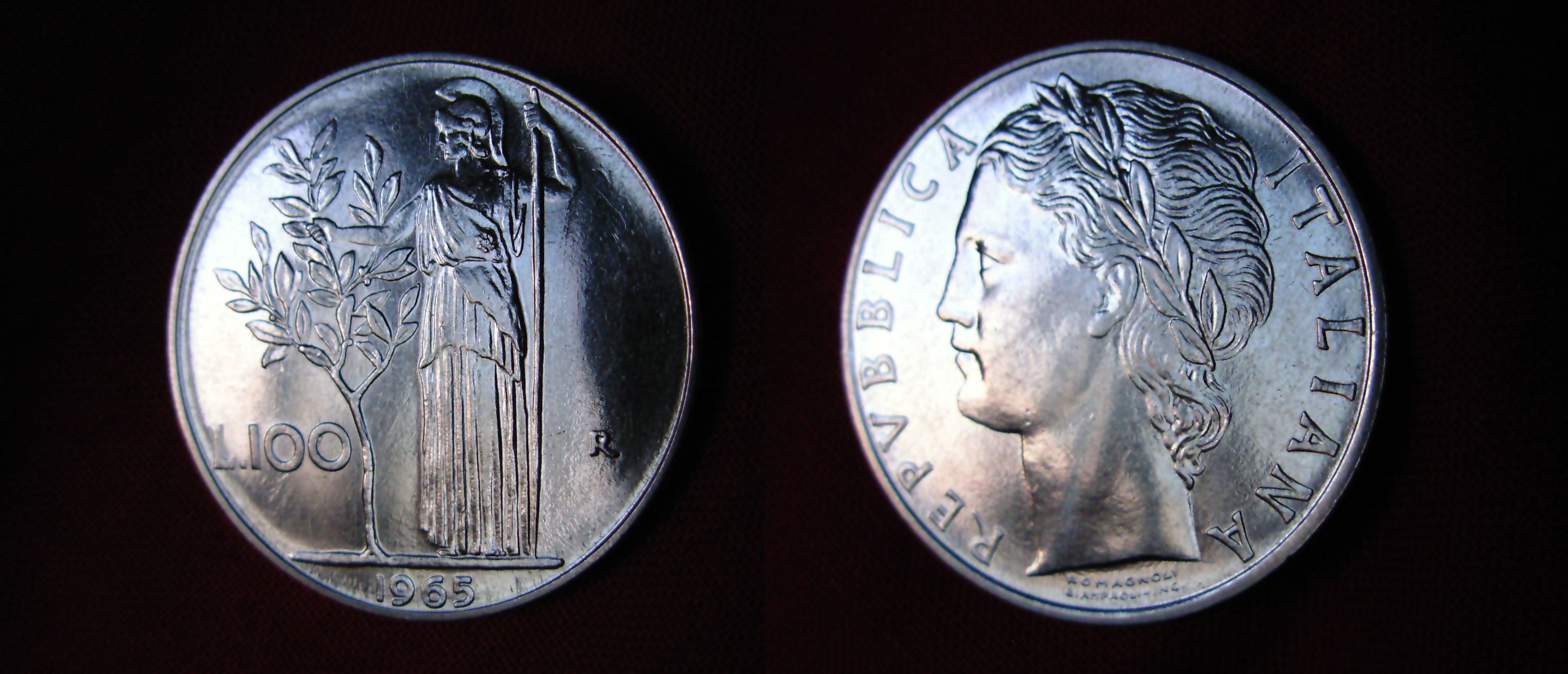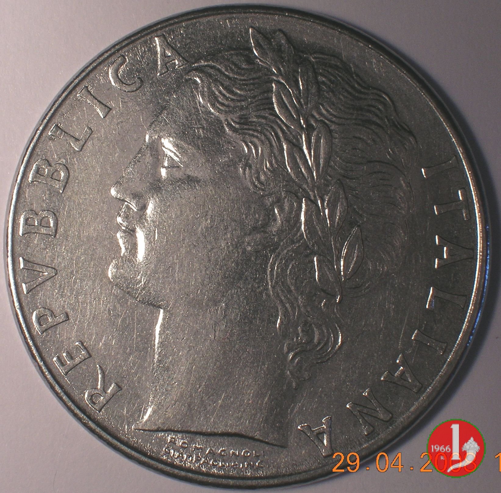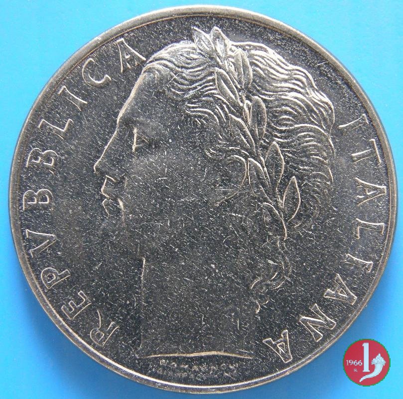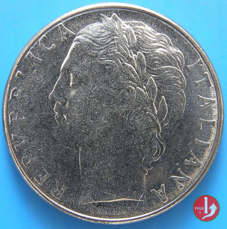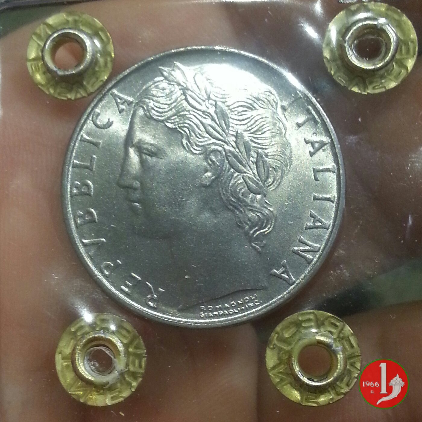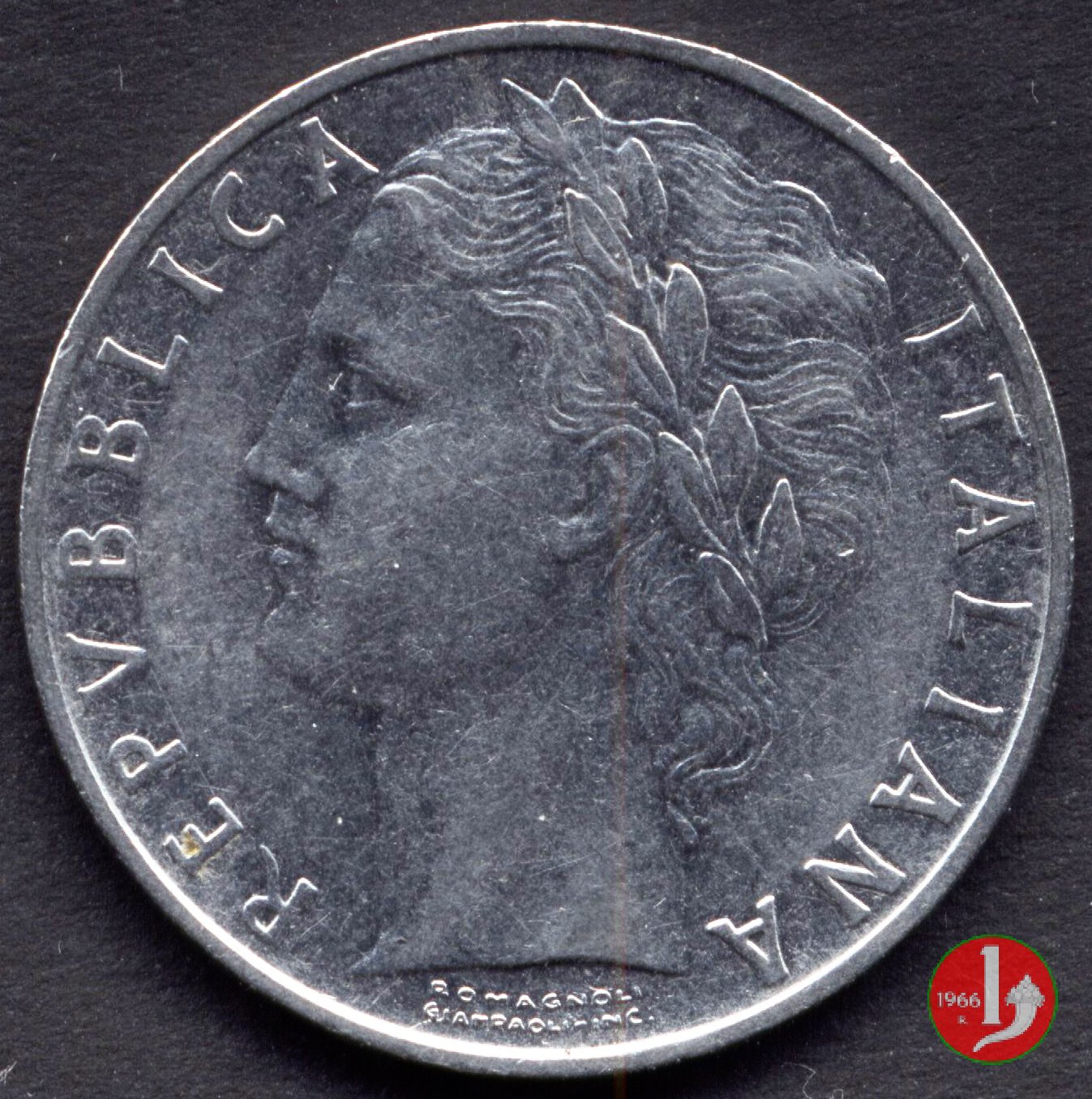 Testa di donna volta a sinistra con il capo cinto da una corona di alloro. Intorno REPVBBLICA ITALIANA. Sotto l'indicazione degli autori (ROMAGNOLI GIAMPAOLI INC •) su due righe. Minerva che protende la destra verso un albero di alloro e regge con la sinistra una lancia. A destra segno di zecca (R), a sinistra indicazione del valore (L. 100). In esergo il millesimo.