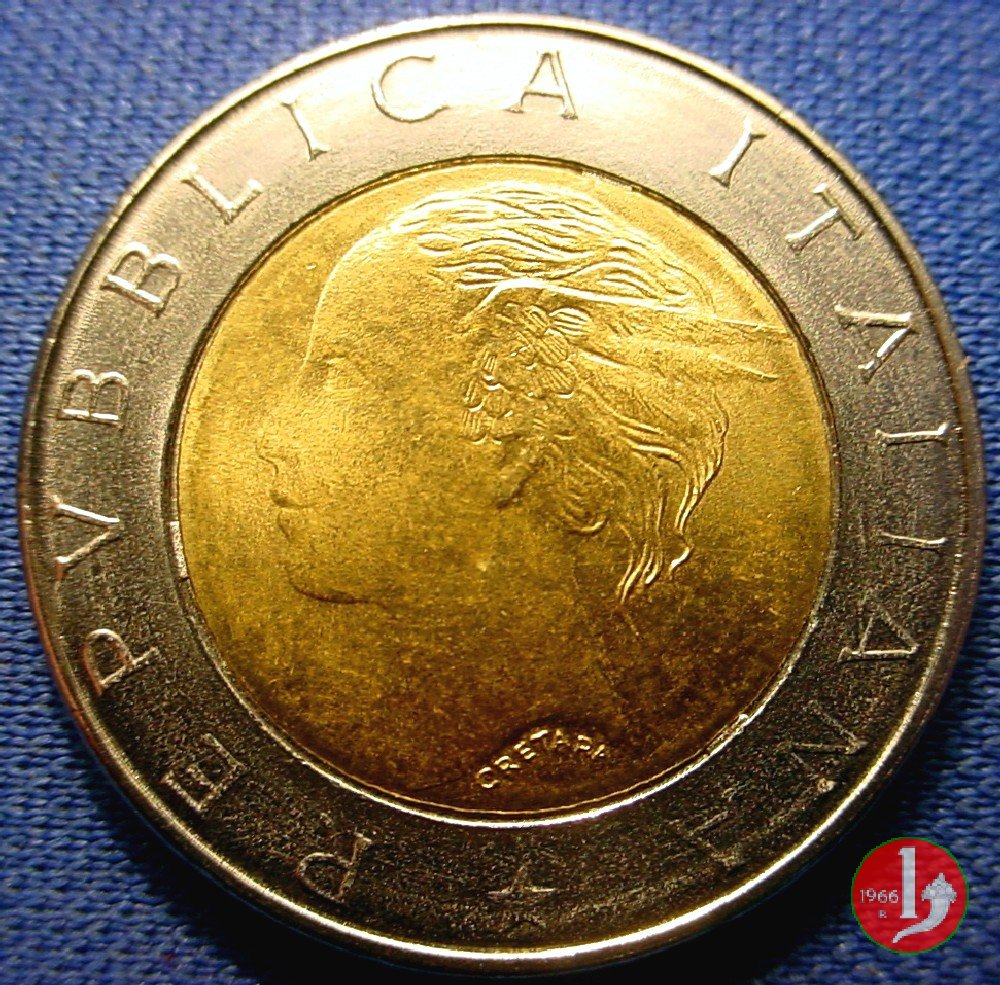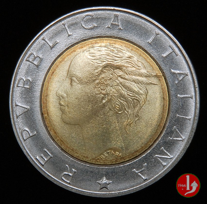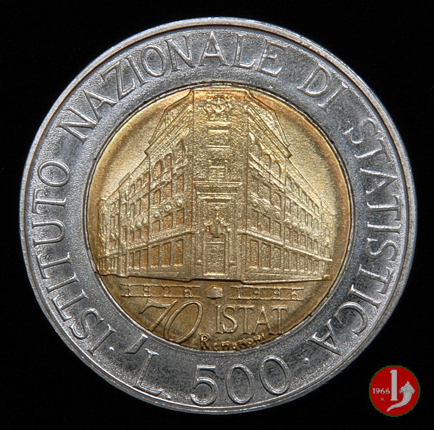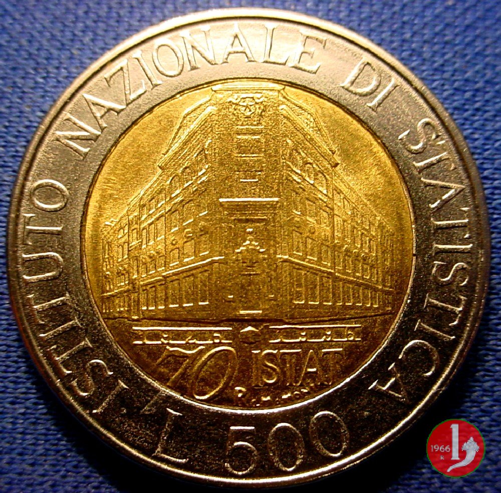 Nella parte interna, testa alata di donna volta a sinistra. Sotto il taglio della testa indicazione degli autori (L • CRETARA e S • GROSS). Nella ghiera esterna REPVBBLICA ITALIANA e una stella a cinque punte. Nella parte interna vista della sede dell'ISTAT; sotto 70 ISTAT e segno di zecca (R). Nella ghiera esterna,  • L • 500 • ISTITUTO NAZIONALE DI STATISTICA.