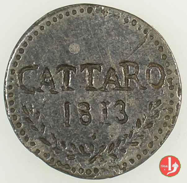Nel campo CATTARO 1813 su due righe, sotto un •. In basso due rami di alloro incrociati.1  N sormontata da corona imperiale, in basso indicazione del facciale (1 • F). Il tutto entro due rami di lauro.