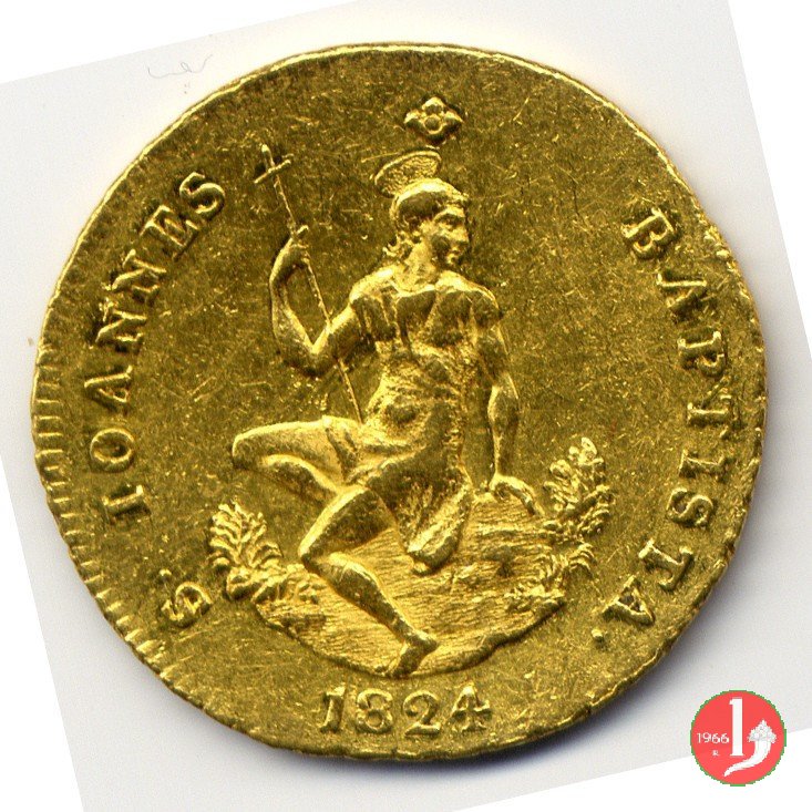 (da sinistra) S • IOANNES croce mauriziana BAPTISTA • il Santo in figura giovanile, seminudo, con nimbo circolare, seduto a sinistra su zolla erbosa, con la testa rivolta a destra, tiene con la destra lunga croce e la sinistra appoggiata al terreno;
