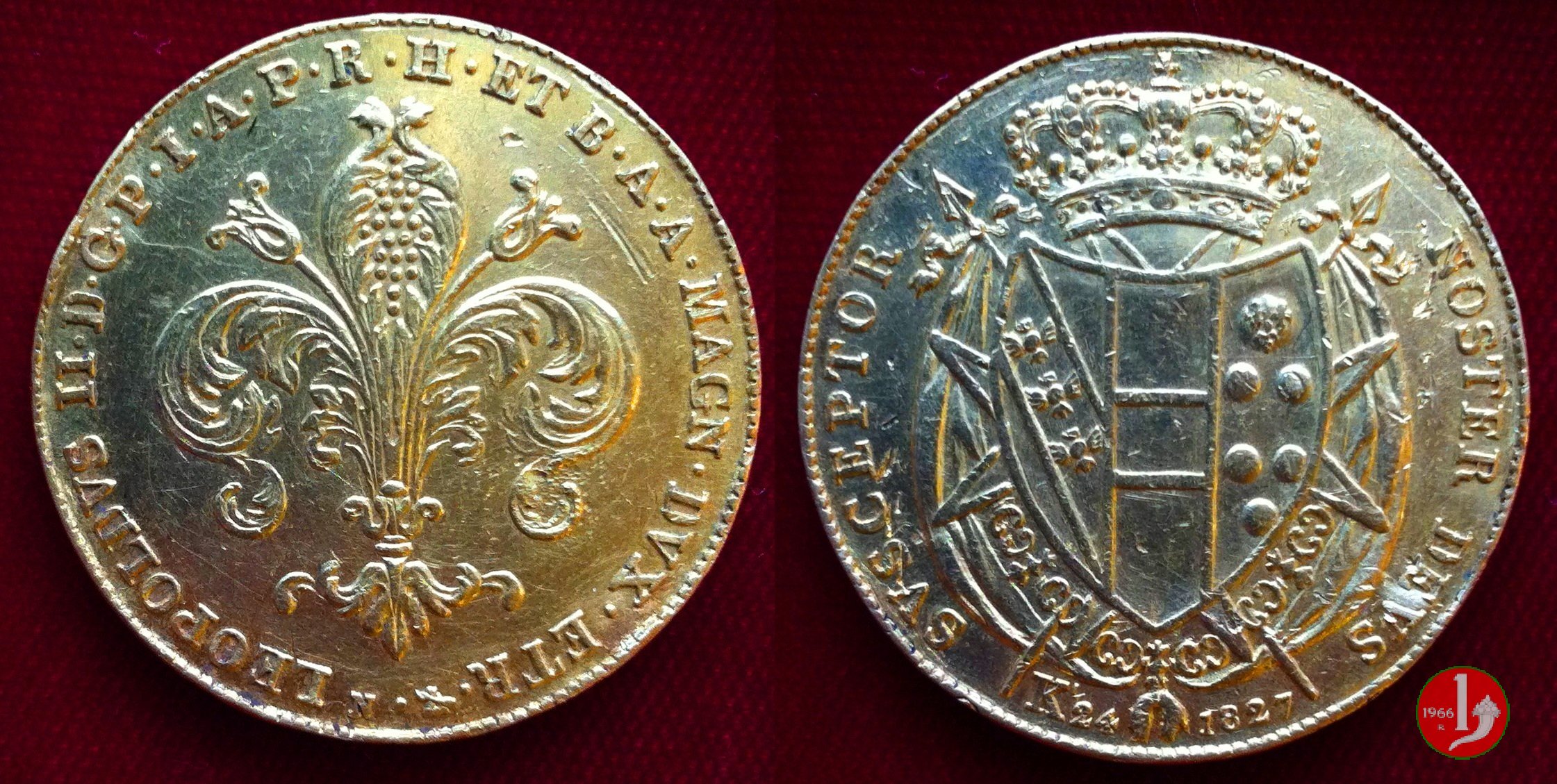 In quel periodo si coniarono in rusponi e zecchini N. 225,914 monete d'oro, alla bontà di karati 24, pel valore intrinseco di L. 7,200,466. E si coniarono N. 22,691 pezzi della nuova moneta di 80 fiorini. [...] Cosí dei pezzi da 80 fiorini, una grossa partita di N. 17,084 coniate nel 1842, passò subito all'estero: gli altri sparirono subito come articoli di curiosità, o come facili a rappresentare, in piccol numero, un buon peculio; nè vennero mai in circolazione. Giovanni Baldasseroni, Leopoldo II, Granduca di Toscana, e i suoi tempi, 1871 | ||||||||||