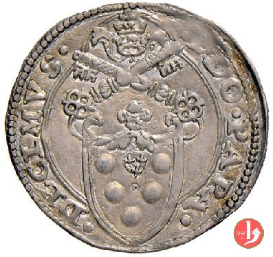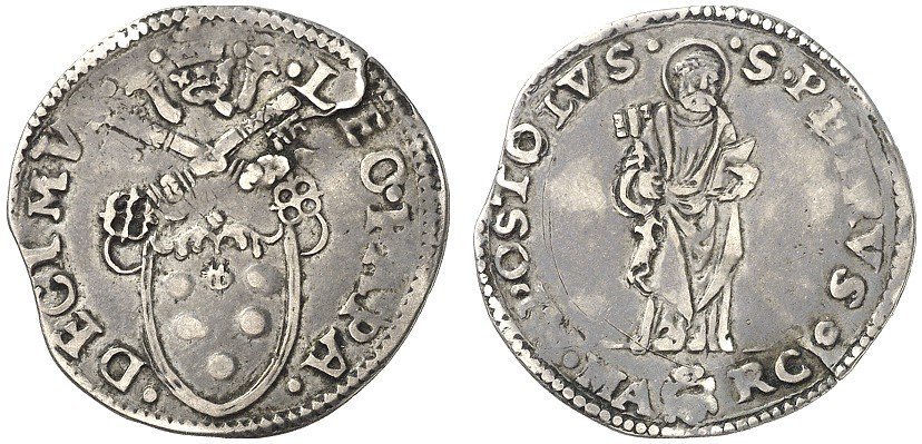 12 D/(da sinistra in basso)°LEO°PAPA°__°DECIMVS°/ stemma gigliato in cornice di 3 centine lineari doppie R/ •S •PETRVS • •__ •APOSTOLVS • /S.Pietro con chiavi erette e libro MA armetta RC, centine di globetti e linee