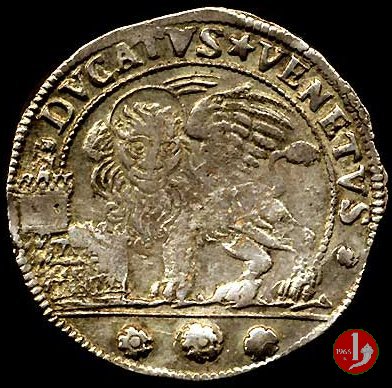 DVCATVS * VENETVS ¤ Leone, alato e nimbato, stante a sinistra e volto di fronte, tiene con la zampa anteriore sinistra libro aperto; nel campo a sinistra, torre. All'esergo tre rosette di cui la centrale piú grande.