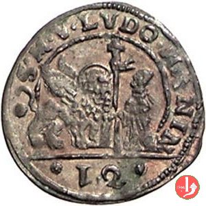 Il Doge, genuflesso a sinistra, tiene con la sinistra l'asta con il vessillo sormontato da croce e banderuola; di fronte, il leone alato e nimbato, a sinistra, con zampa anteriore sul libro aperto, in un cerchio di perline.