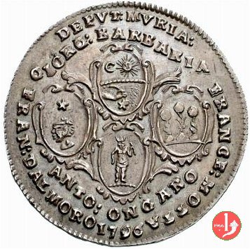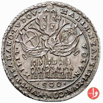 Nel cerchio all'interno la scritta MILIT VOLVN Armi del Doge, del Podestà e del Camerlengo con trofei di guerra, in mezzo gallo di Murano. In basso drappello di soldati, all'esergo 500.