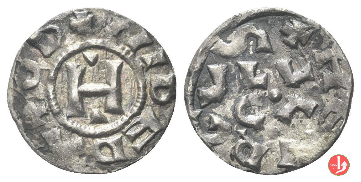 | Il metallo di questa moneta contiene un'alta percentuale d'argento. Lo stile del conio ben curato (per questa tipologia monetale) e il tondello quasi perfettamente rotondo. Si deduce che nel primo periodo dell'XI secolo non vi era ancora la necessità di velocizzare la produzione e si tentava di contrastare il denaro pavese, anche esteticamente, cosa che peraltro riuscí perfettamente nei decenni successivi. Nella scheda presentiamo il disegno dell'esemplare presente nella collezione del Massagli che differisce da quello illustrato nel testo di Bellesia per non avere la H iniziale di Enrico in legenda e per una R di fantasia. Probabilmente si tratta di una errata lettura della moneta poco decifrabile da parte dello studioso. Comincia quell'immobilismo iconografico ed epigrafico che tanto successo ebbe nel Medioevo. I denari di Enrico II si riconoscono per i due cunei sopra e sotto la H. Probabilmente denari attribuiti ai suoi successori sono stati coniati circa un ventennio prima ma senza la caratteristica dei cunei e con monogramma doppia T, che insieme ai vecchi ottoniani costituirono l'insieme dei nominali a disposizione. I denari che avevano un alto valore fiduciario continuavano a circolare come moneta vecchia accanto alla nuova ancora per molti anni dopo la loro emissione. Questo doppio sistema di circolazione monetaria si verificò con continuità per ogni emittenza. Cosí si verrebbe a riempire un vuoto monetale, considerata la rarità di questi denari, decisamente poco credibile.1 | |||||||||
