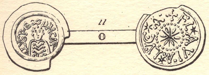 Stella a sei punte accantonata da losanghe in cerchio puntinato.La legenda e' inframezzata da tre stelle a sei punte.